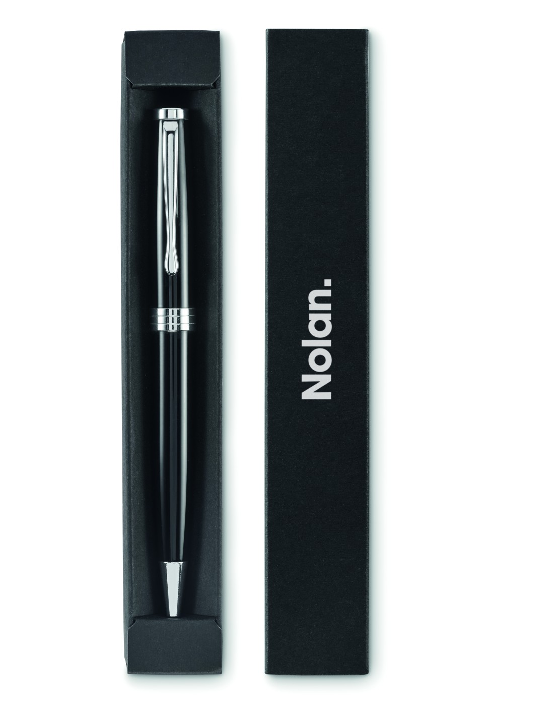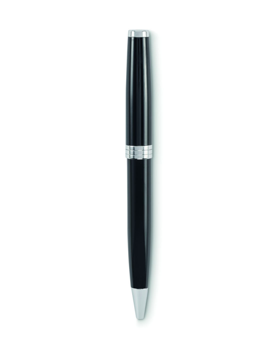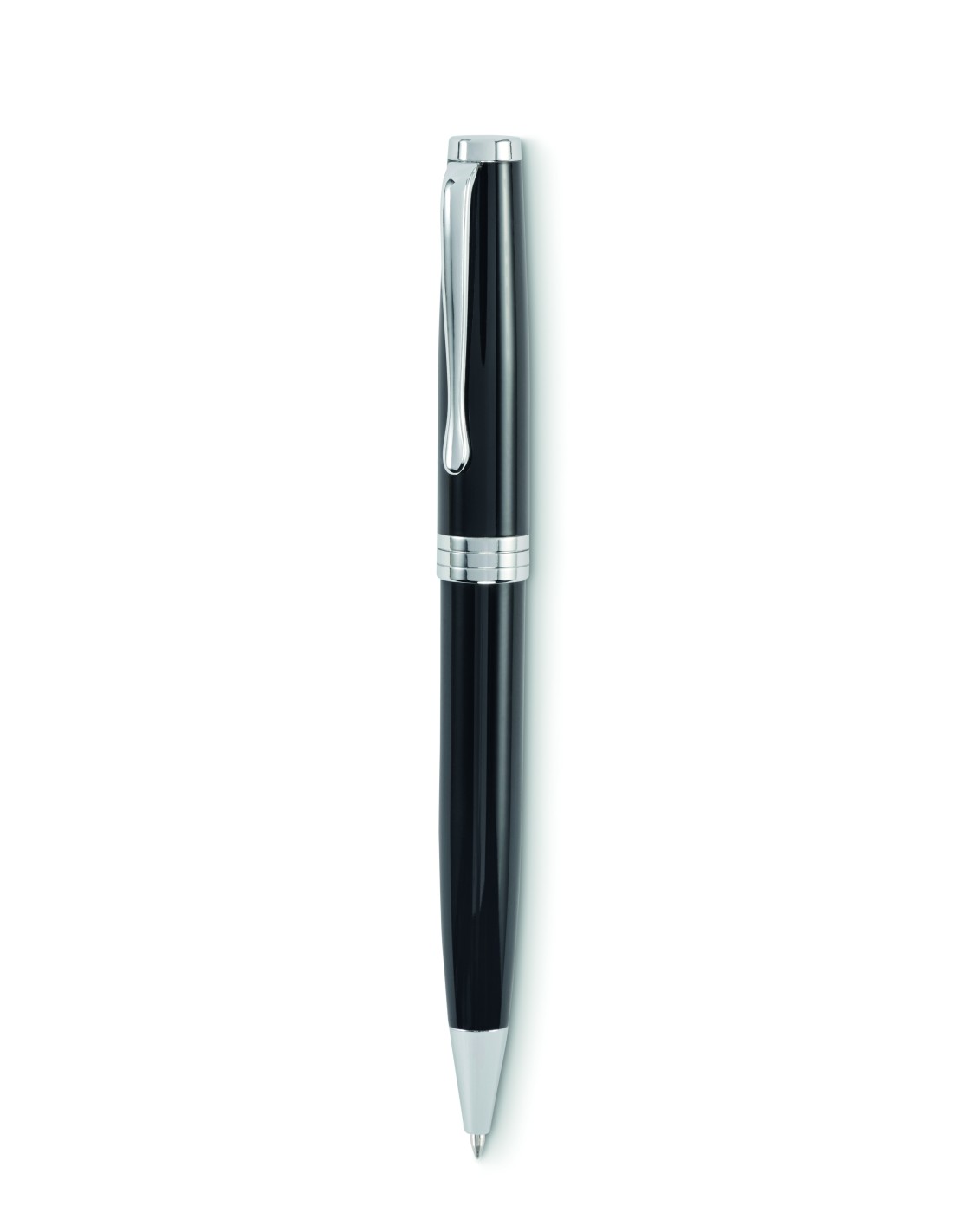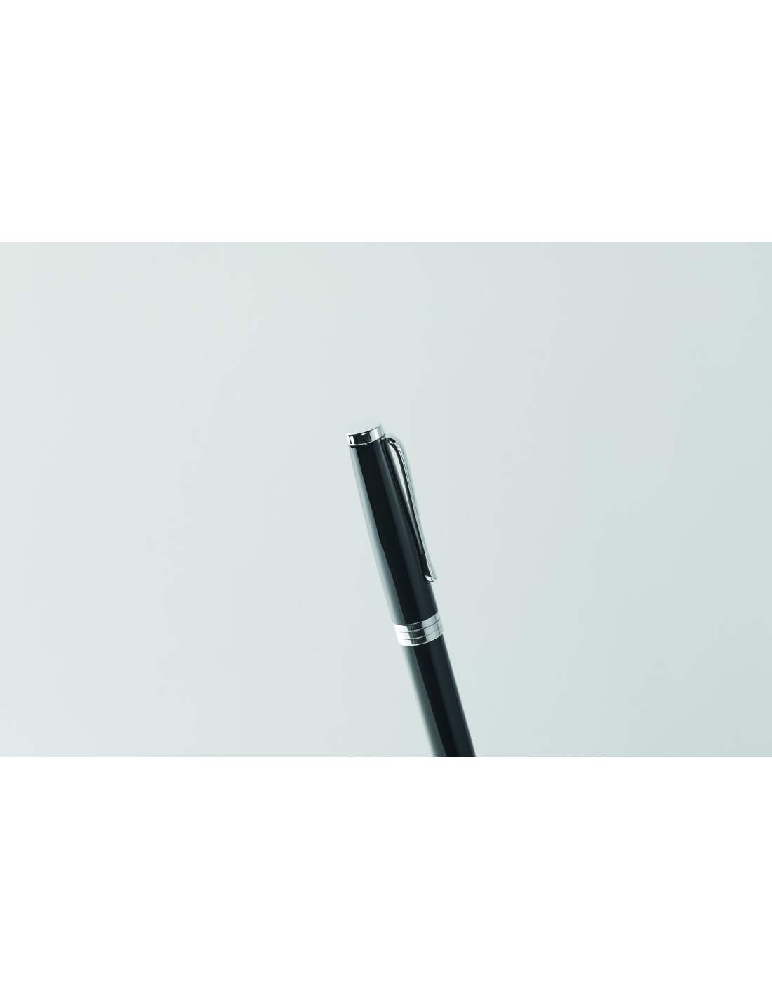 Set penna a sfera con refill blu e meccanismo a scatto e penna roller con refill nero in metallo e PU con cuciture in bianco. Astuccio in PU con chiusura a zip.