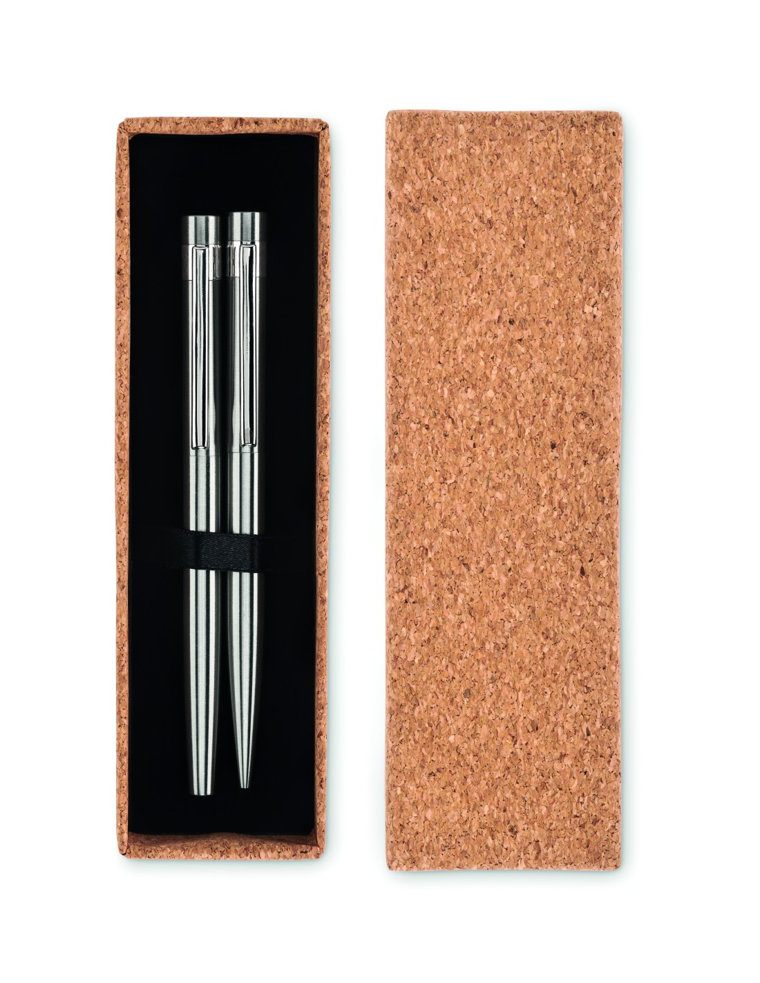 Set composto da una penna a sfera (meccanismo twist) e una roller (con cappuccio), con fusto in sughero. Presentato in scatola di sughero abbinata. Inchiostro rispettivamente blu e nero.