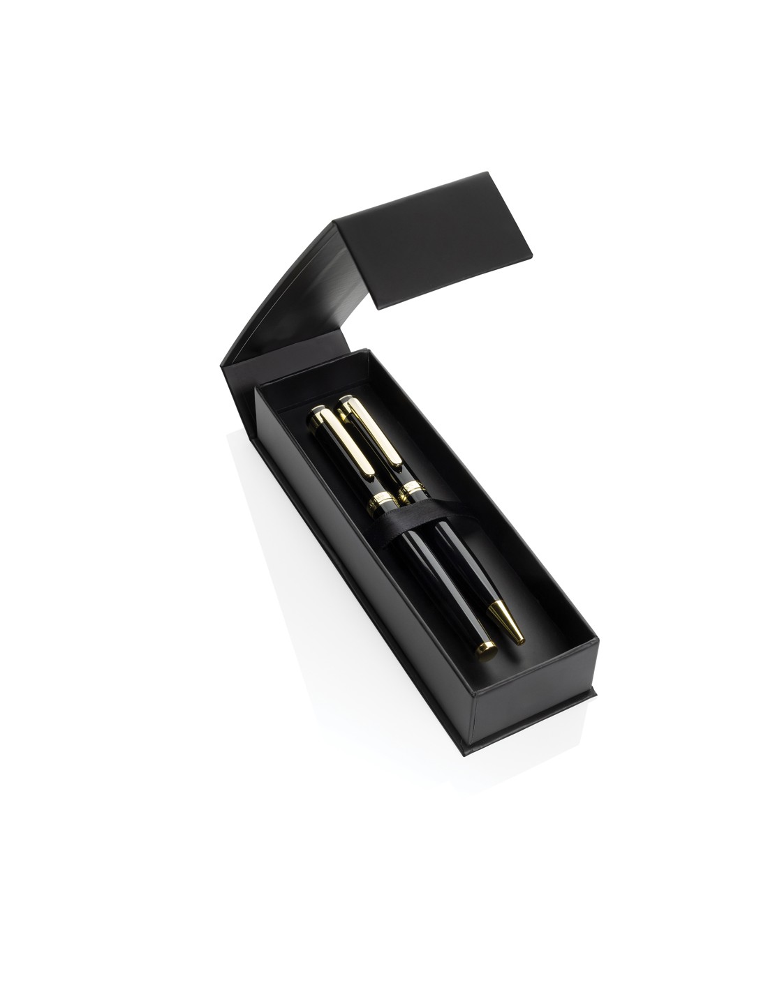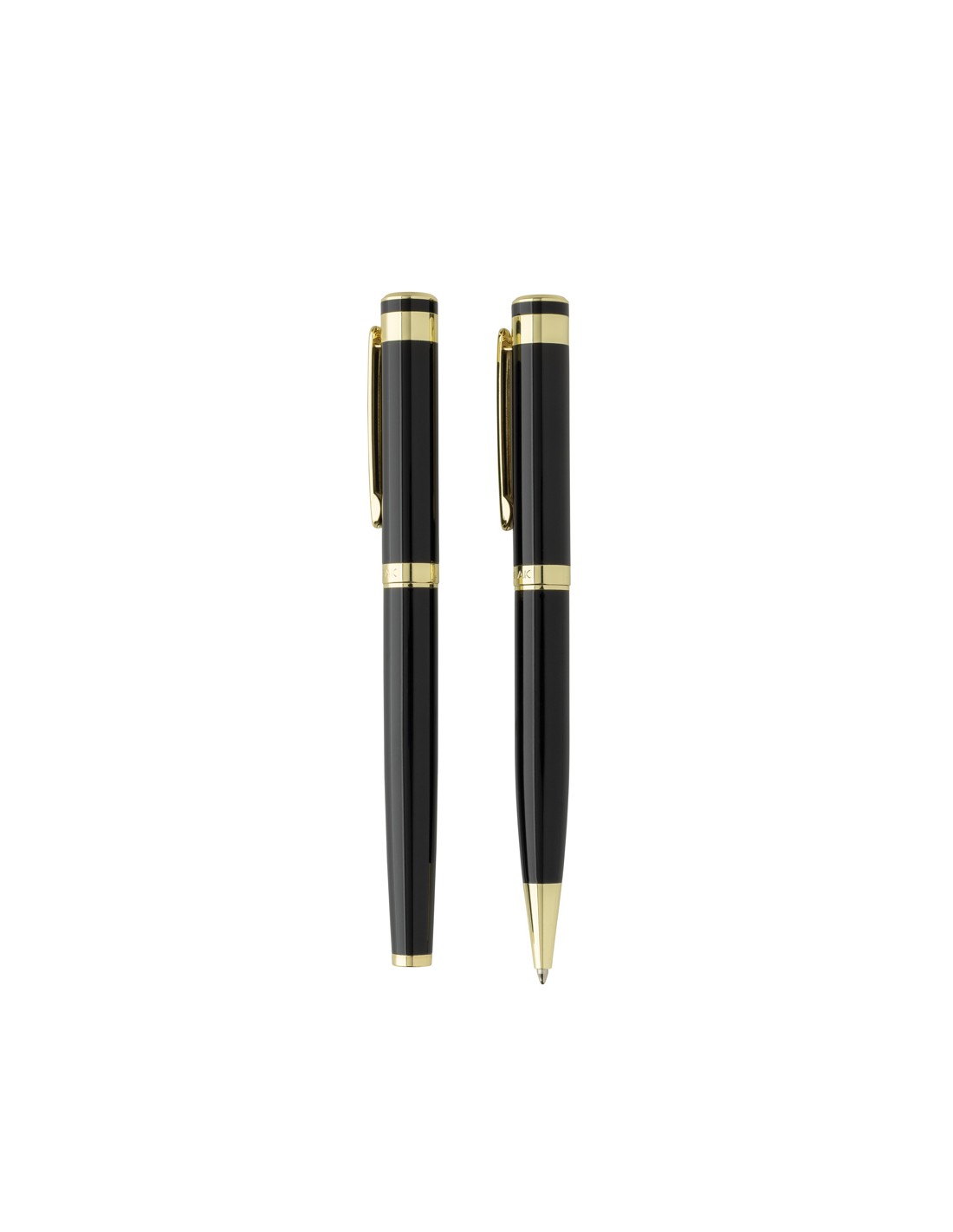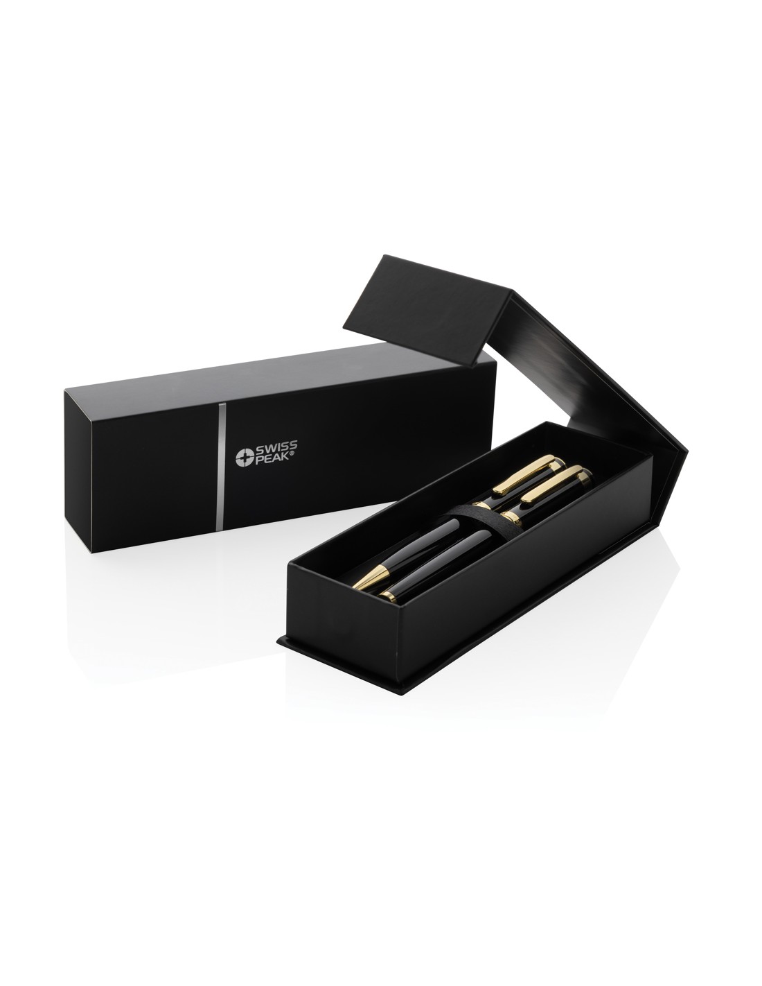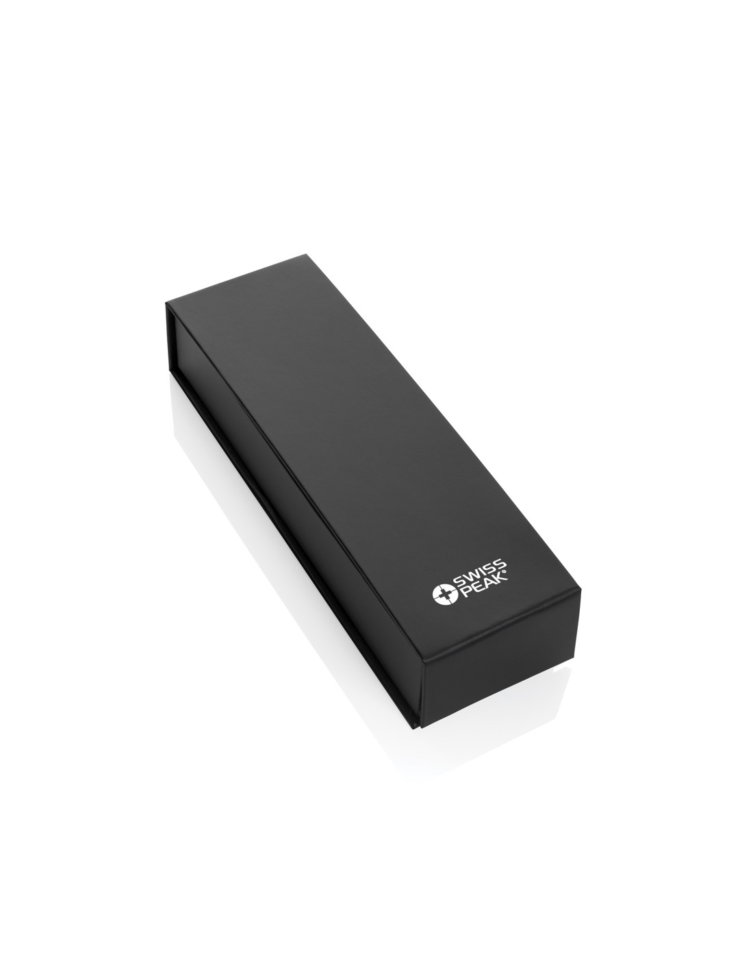 Elevate la vostra esperienza di scrittura con il set di penne deluxe Luca Swiss Peak in ottone riciclato RCS. Progettato all'insegna della raffinatezza, questo set presenta eleganti penne nere con dettagli dorati, tra cui la parte superiore, l'anello superiore, la clip, l'anello centrale e la punta. Realizzate con il 55% di ottone riciclato certificato RCS, queste penne offrono eleganza e sostenibilità. La penna a sfera funziona con un meccanismo a rotazione e include un refill con inchiostro blu, che scrive con una larghezza di 1,0 mm per un massimo di 1200 metri. La penna con tappo è dotata di inchiostro gel blu, che offre 800 m di scrittura scorrevole con la stessa larghezza di 1,0 mm. Entrambe le penne sono rifinite con una clip in acciaio e incise con il logo Swiss Peak sull'anello centrale. Presentato in una pregiata confezione regalo, questo set emana lusso e stile.