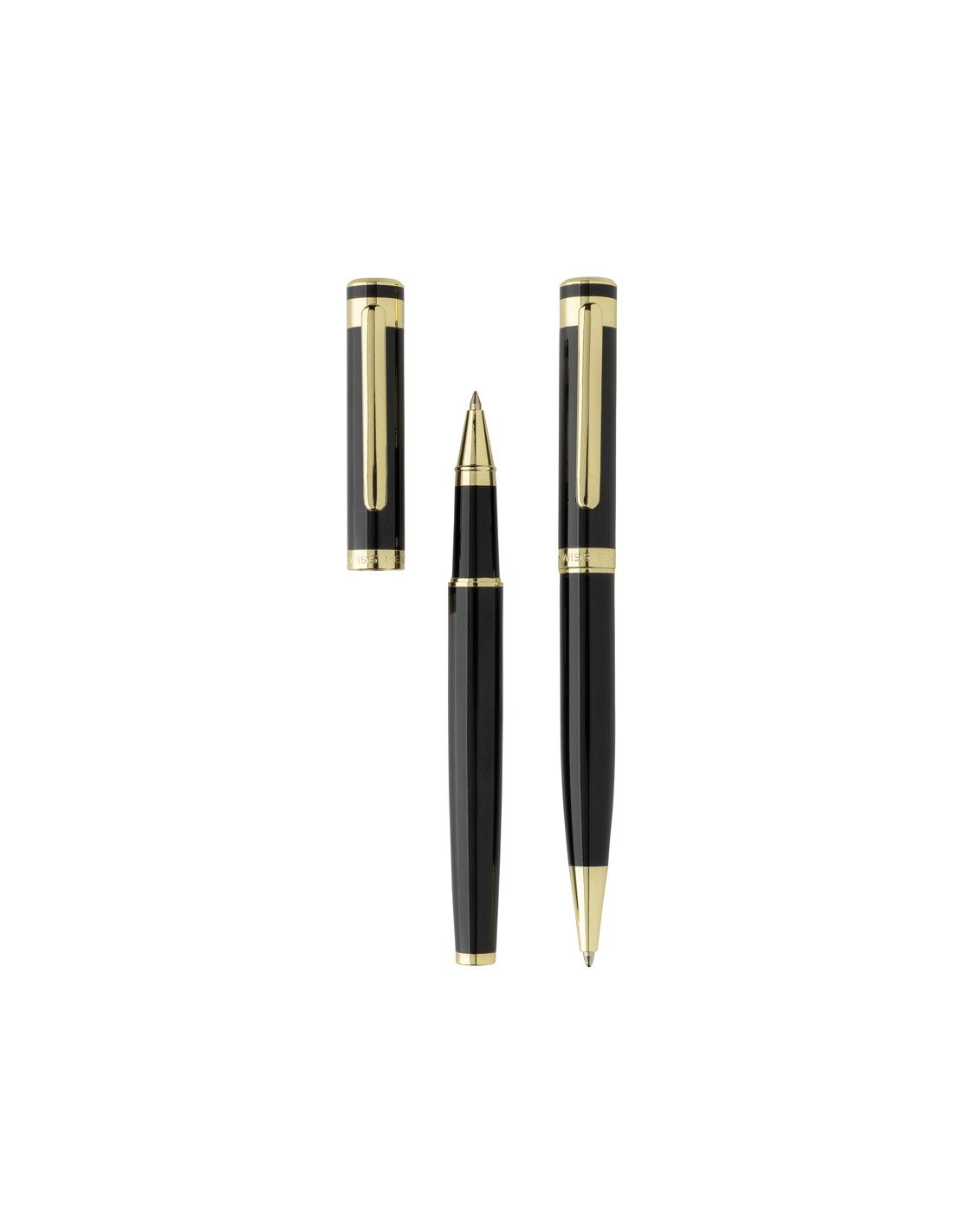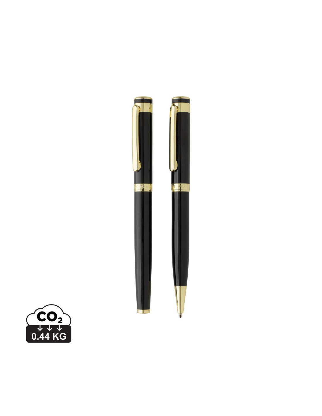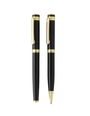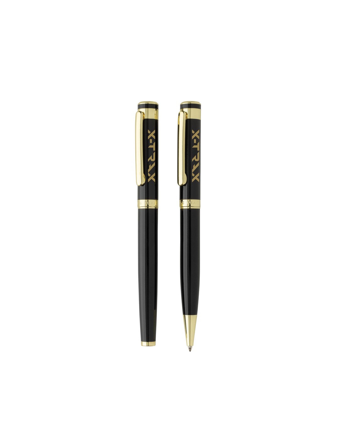 Elevate la vostra esperienza di scrittura con il set di penne deluxe Luca Swiss Peak in ottone riciclato RCS. Progettato all'insegna della raffinatezza, questo set presenta eleganti penne nere con dettagli dorati, tra cui la parte superiore, l'anello superiore, la clip, l'anello centrale e la punta. Realizzate con il 55% di ottone riciclato certificato RCS, queste penne offrono eleganza e sostenibilità. La penna a sfera funziona con un meccanismo a rotazione e include un refill con inchiostro blu, che scrive con una larghezza di 1,0 mm per un massimo di 1200 metri. La penna con tappo è dotata di inchiostro gel blu, che offre 800 m di scrittura scorrevole con la stessa larghezza di 1,0 mm. Entrambe le penne sono rifinite con una clip in acciaio e incise con il logo Swiss Peak sull'anello centrale. Presentato in una pregiata confezione regalo, questo set emana lusso e stile.