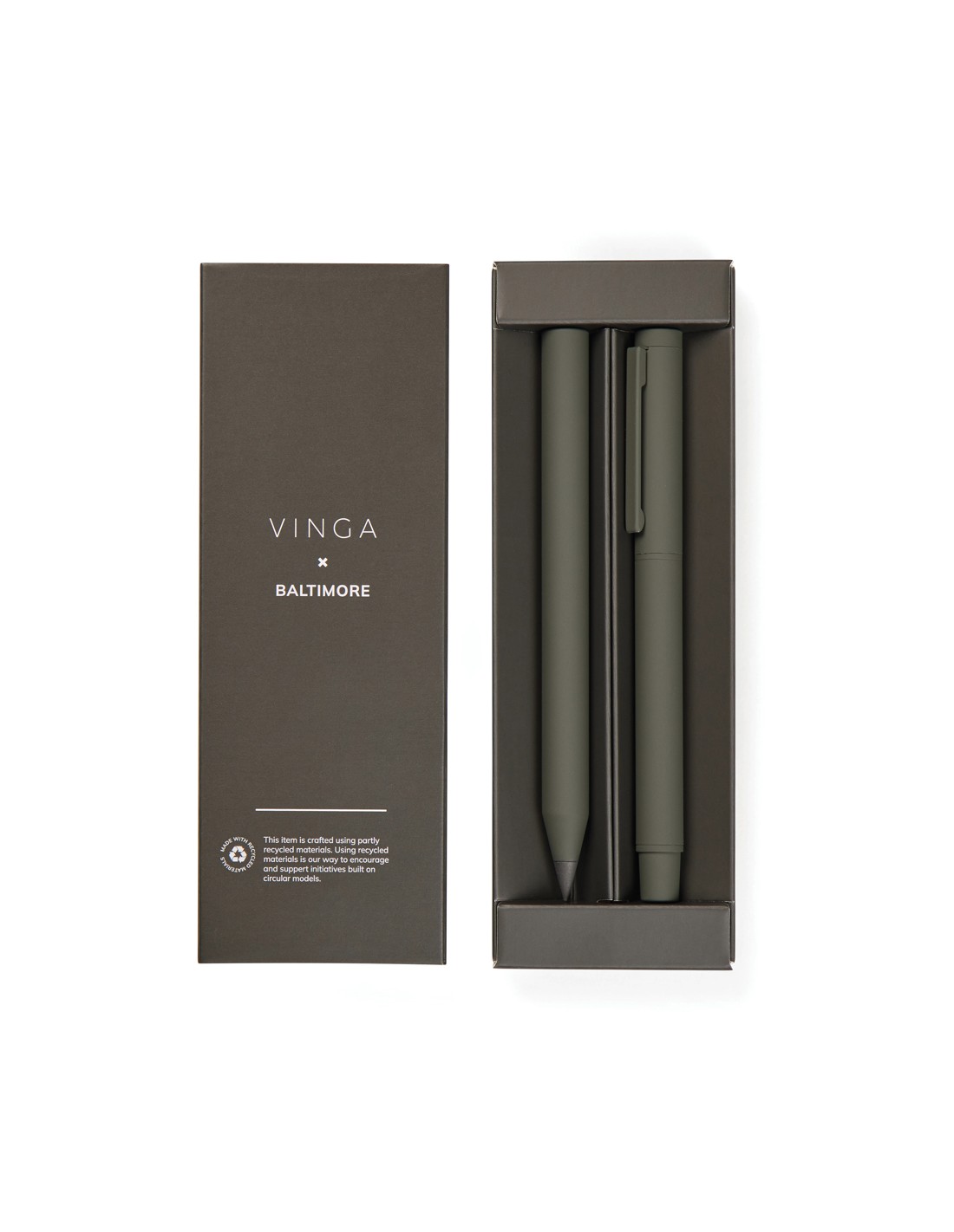 Questo moderno ed elegante set comprende due penne: una eterna e una classica penna a sfera con cappuccio e clip. Progettate per garantire stile e funzionalità, queste penne sono realizzate in acciaio inossidabile riciclato certificato RCS, con un rivestimento superficiale in gomma per una presa confortevole e una finitura opaca. Entrambe le penne hanno un peso bilanciato che garantisce stabilità e scrittura senza sforzo. La penna eterna offre una scrittura senza limiti. La penna a sfera è dotata di una punta fine da 1,00 mm e garantisce una scrittura fluida e costante con inchiostro blu documentale, che dura fino a 1200 metri. La certificazione RCS garantisce che l'intera catena di approvvigionamento dei materiali riciclati sia certificata. Il contenuto totale di materiale riciclato si basa sul peso complessivo del prodotto. Questo prodotto contiene il 52% di alluminio riciclato certificato RCS e il 10% di acciaio inossidabile certificato RCS.