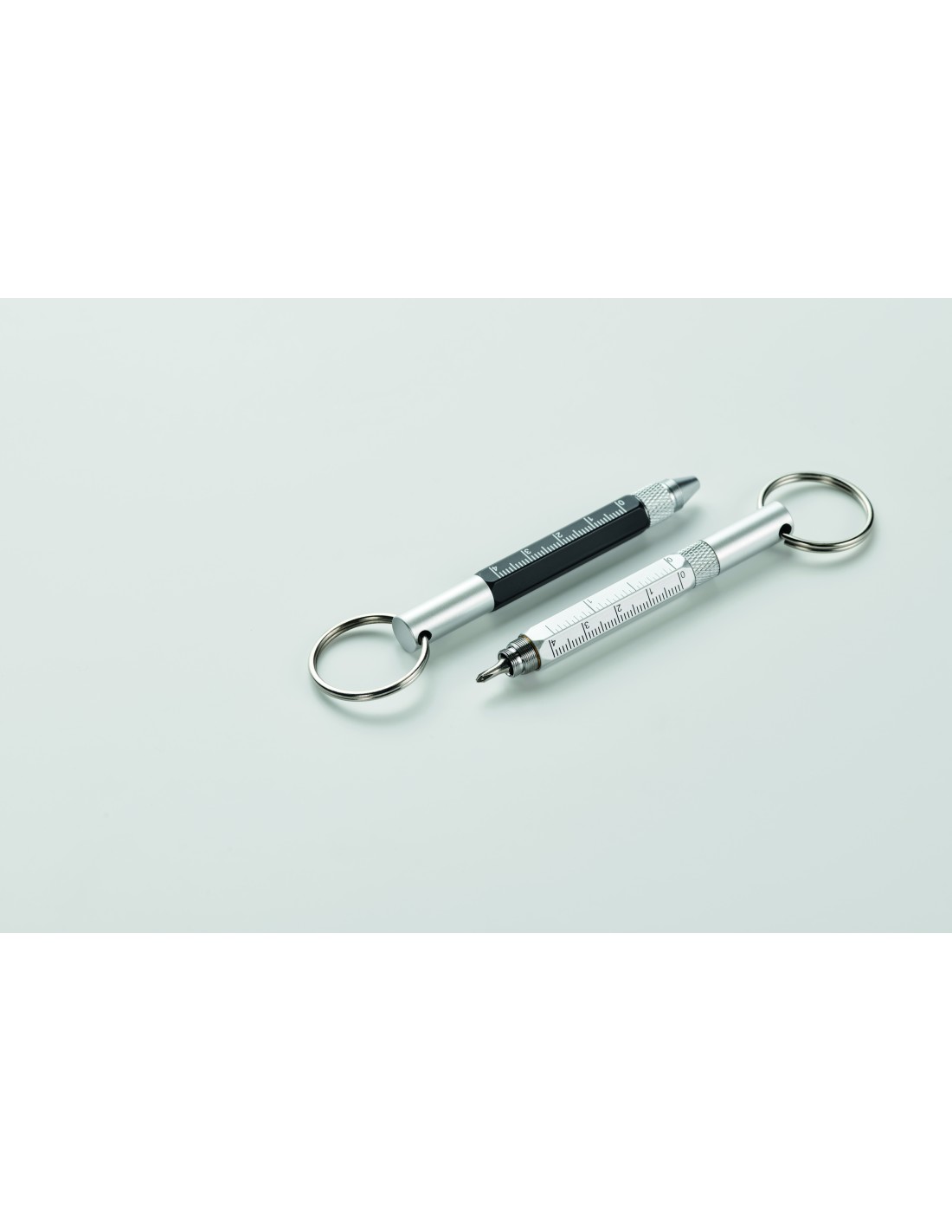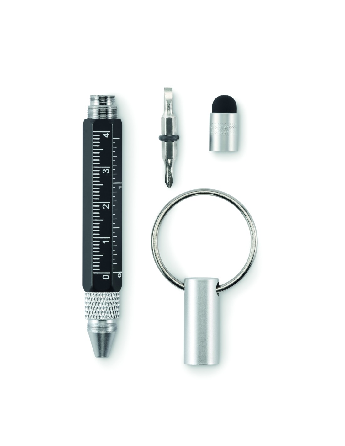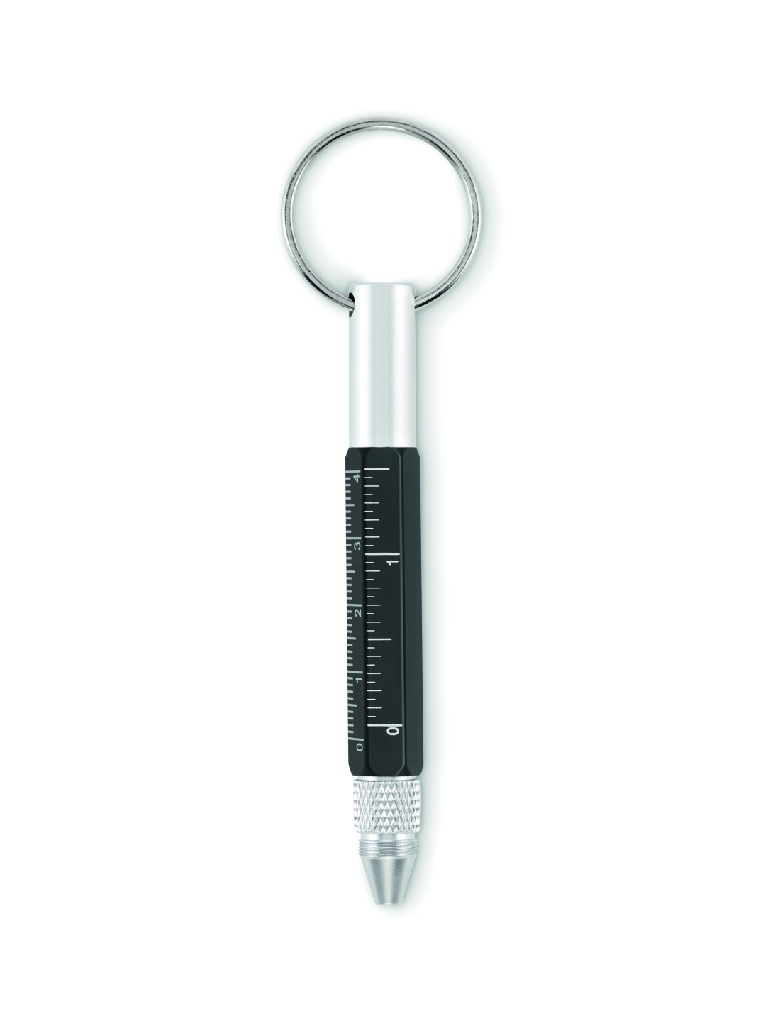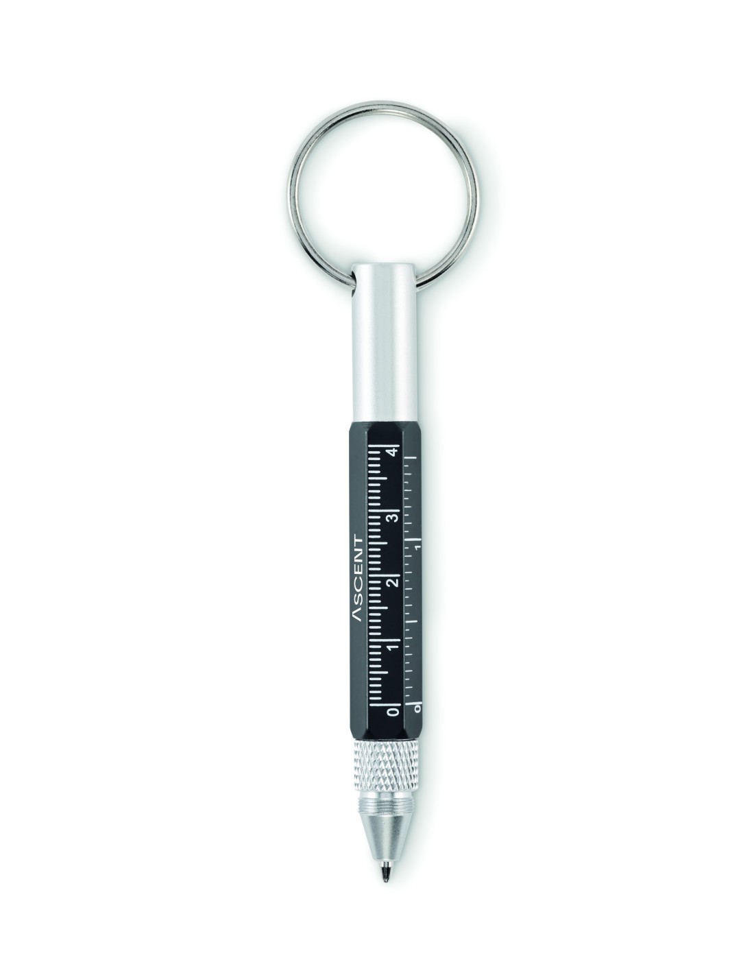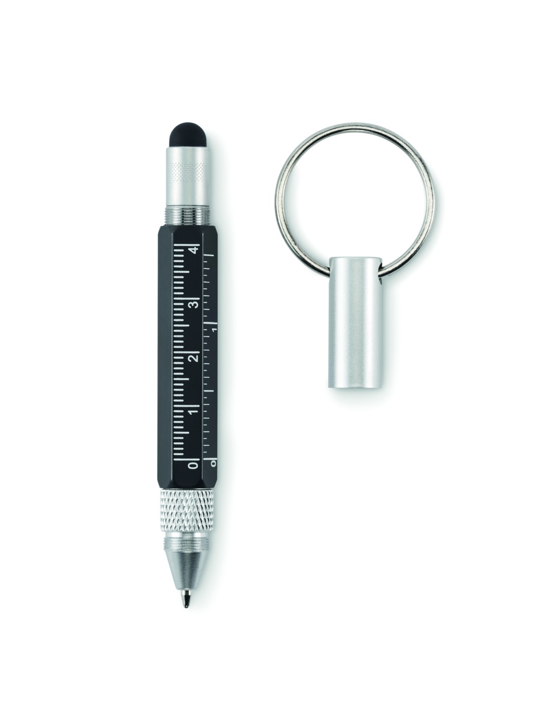Portachiavi con penna a rotazione in alluminio riciclato con righello da 4 cm e 1,5 pollici, stilo e cacciavite 2 in 1 a testa piatta e a croce. Inchiostro nero.