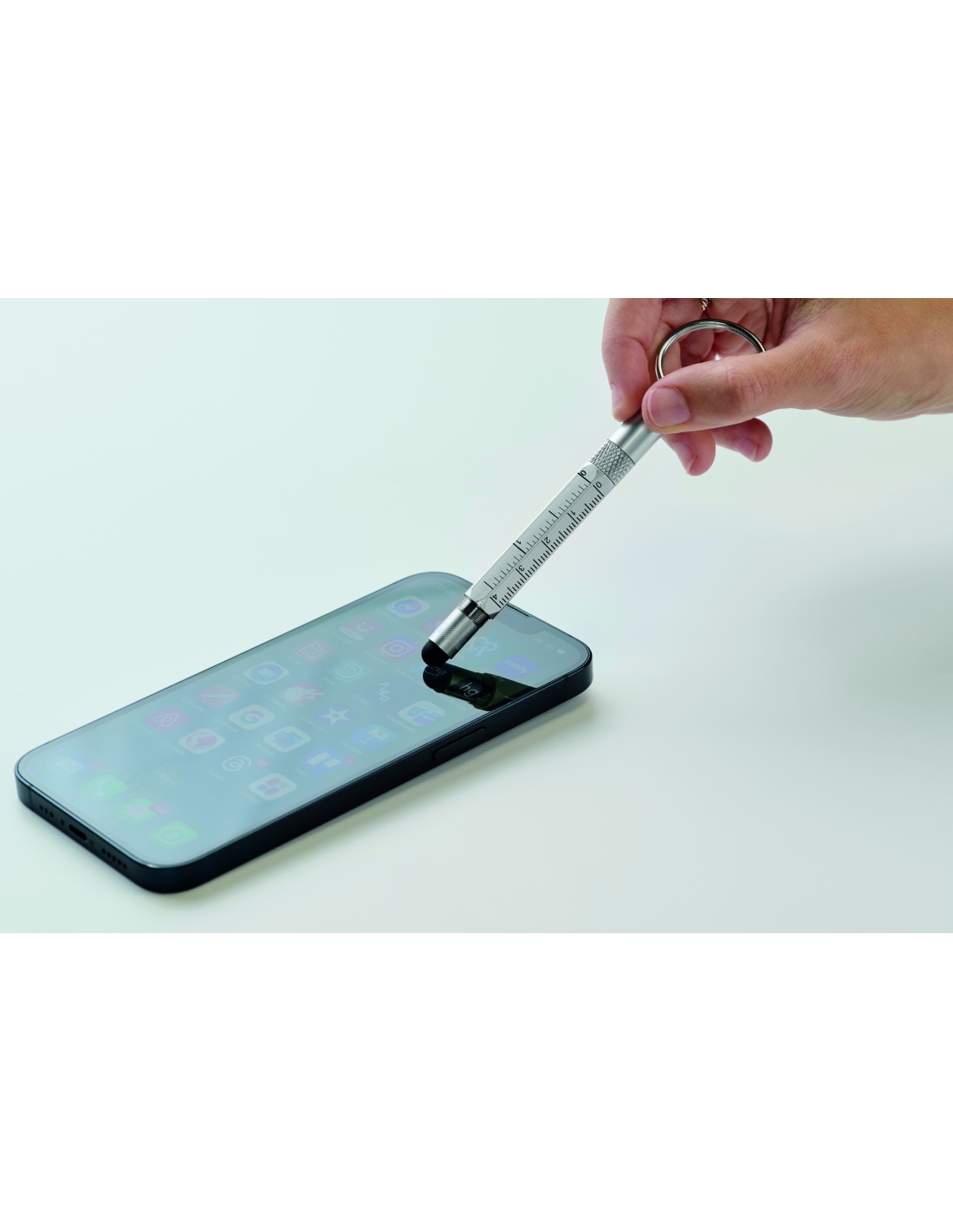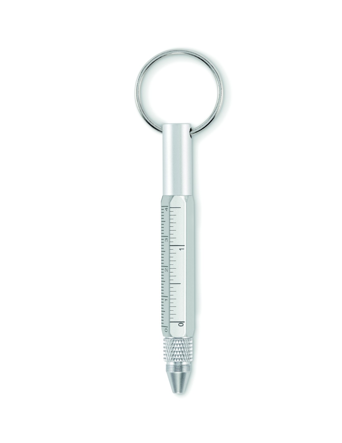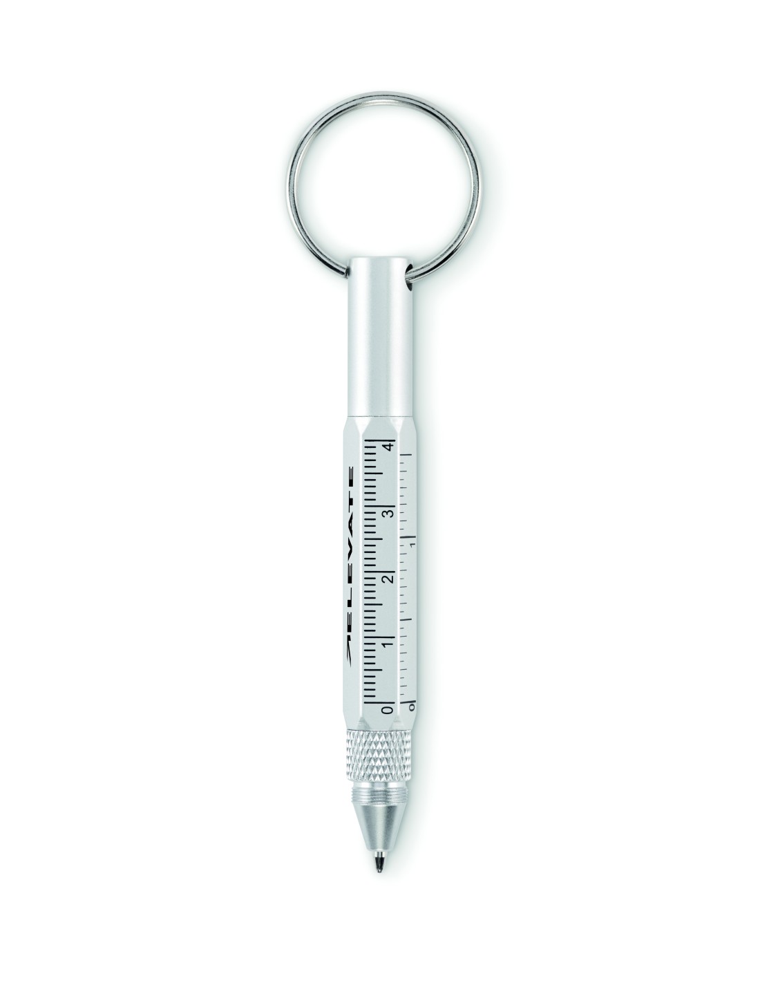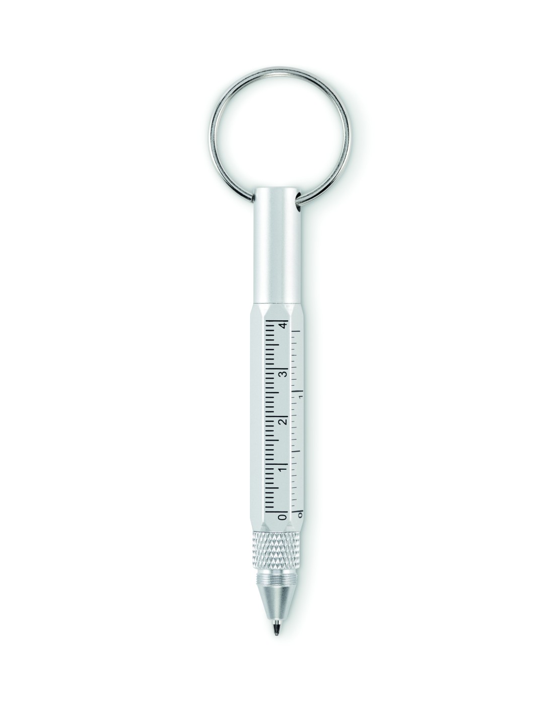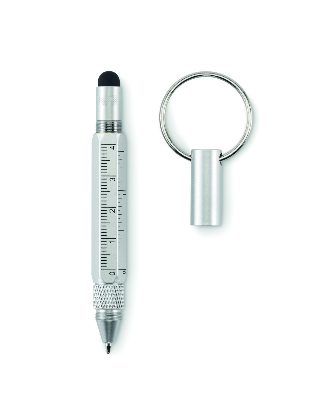 Portachiavi con penna a rotazione in alluminio riciclato con righello da 4 cm e 1,5 pollici, stilo e cacciavite 2 in 1 a testa piatta e a croce. Inchiostro nero.