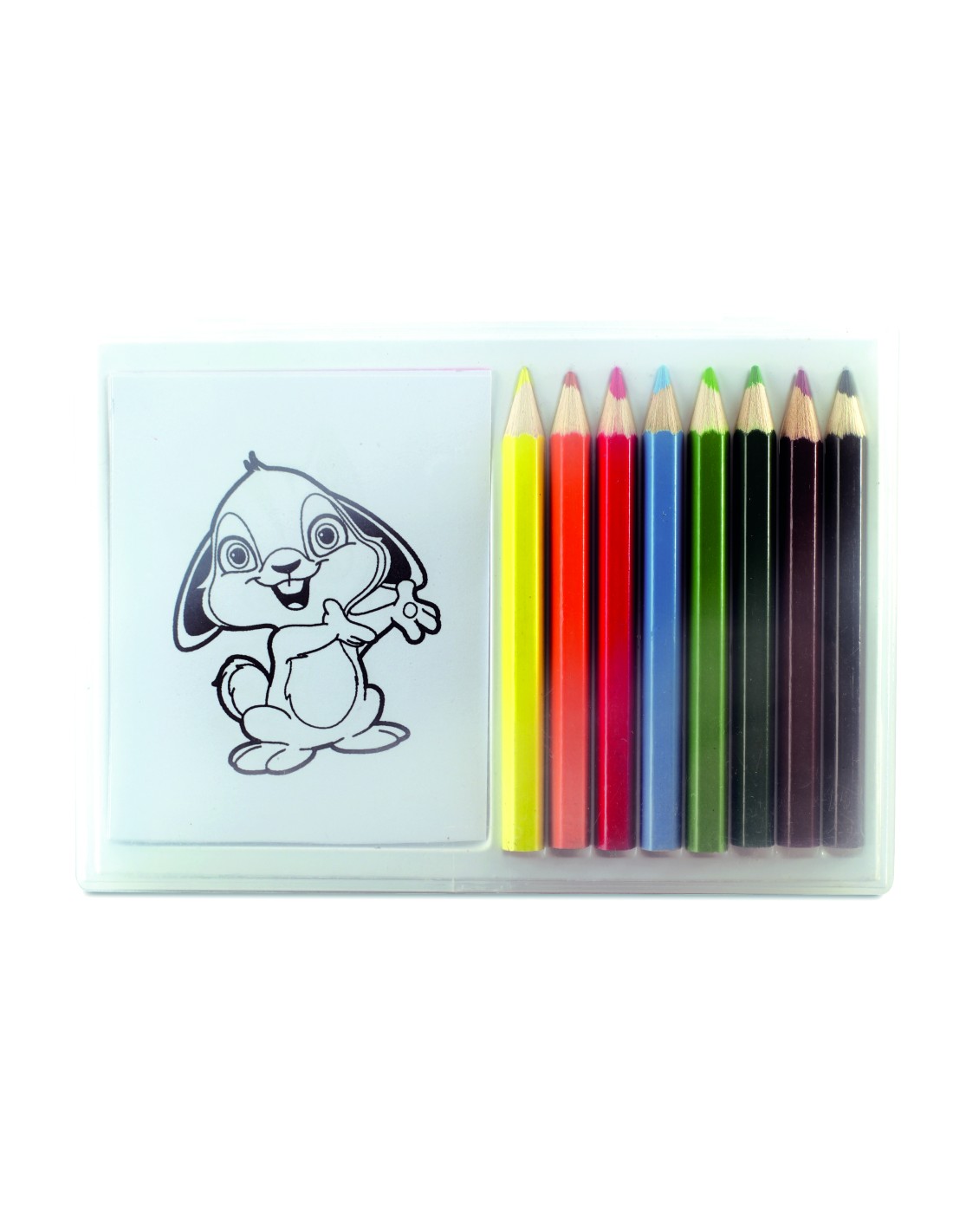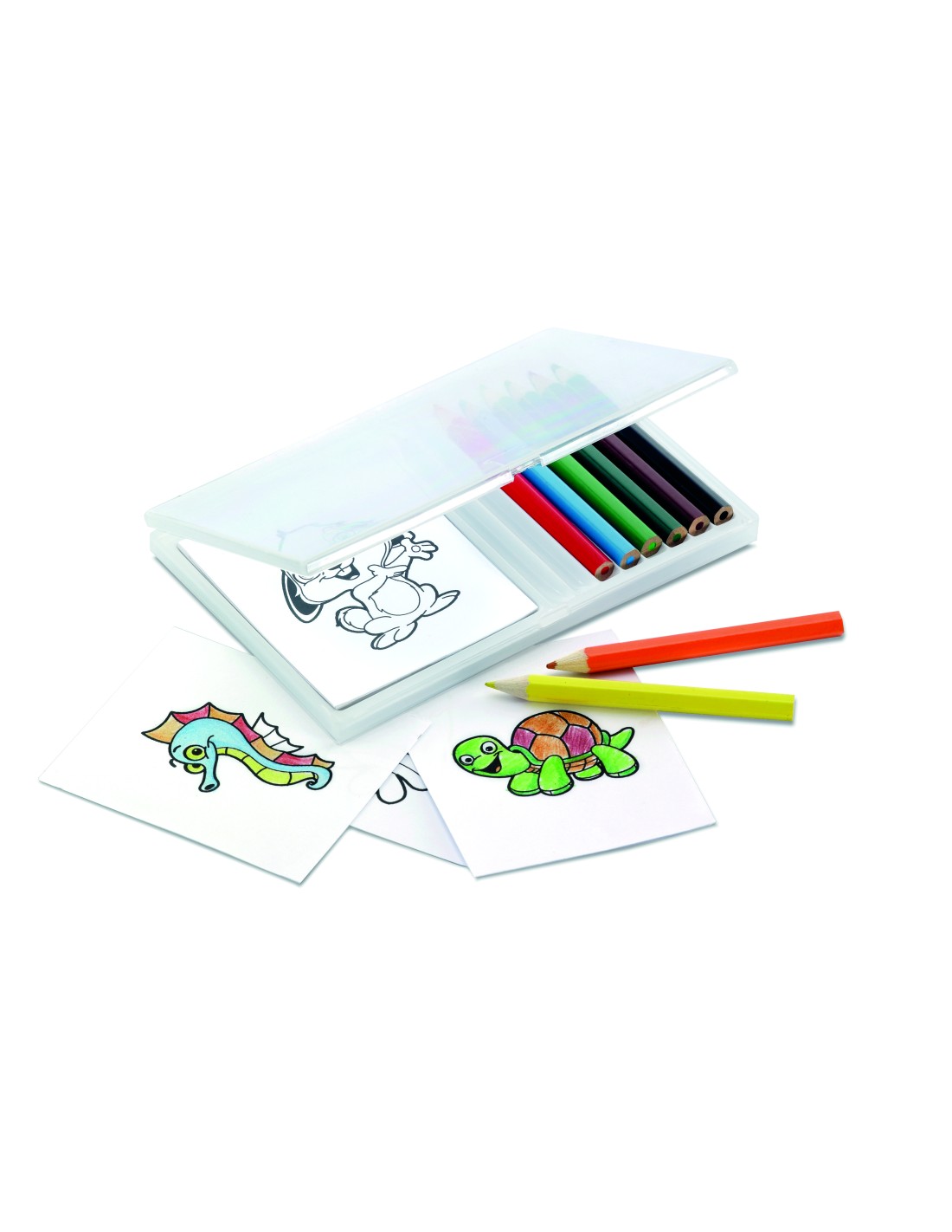 Set da colorare in scatola trasparente, contiene 8 matite di legno e 20 disegni su carta riciclata.
