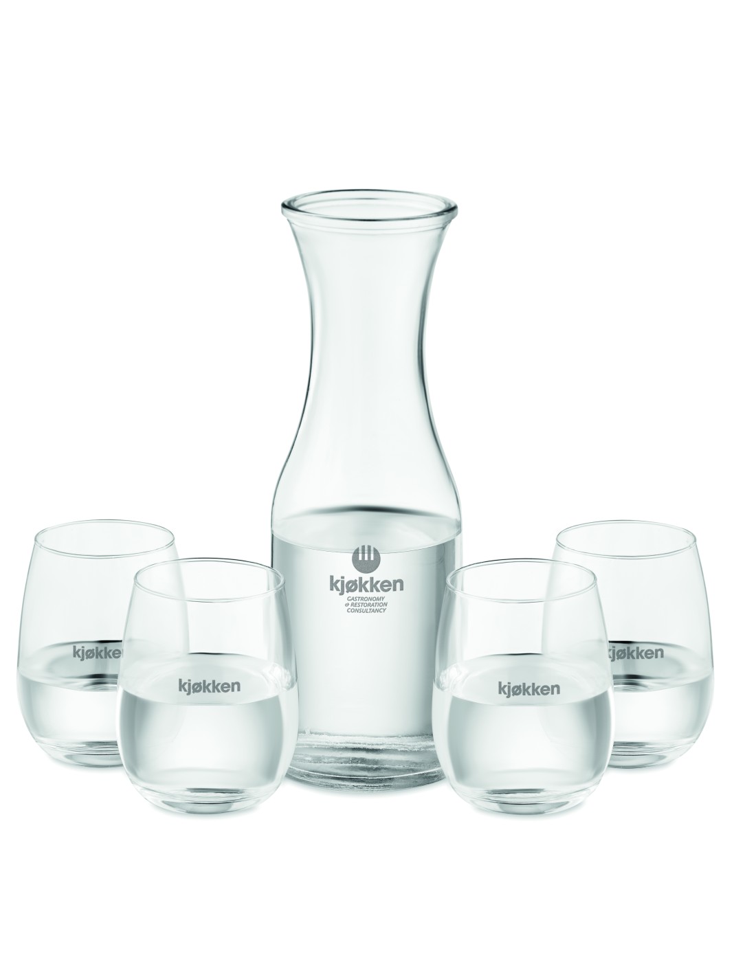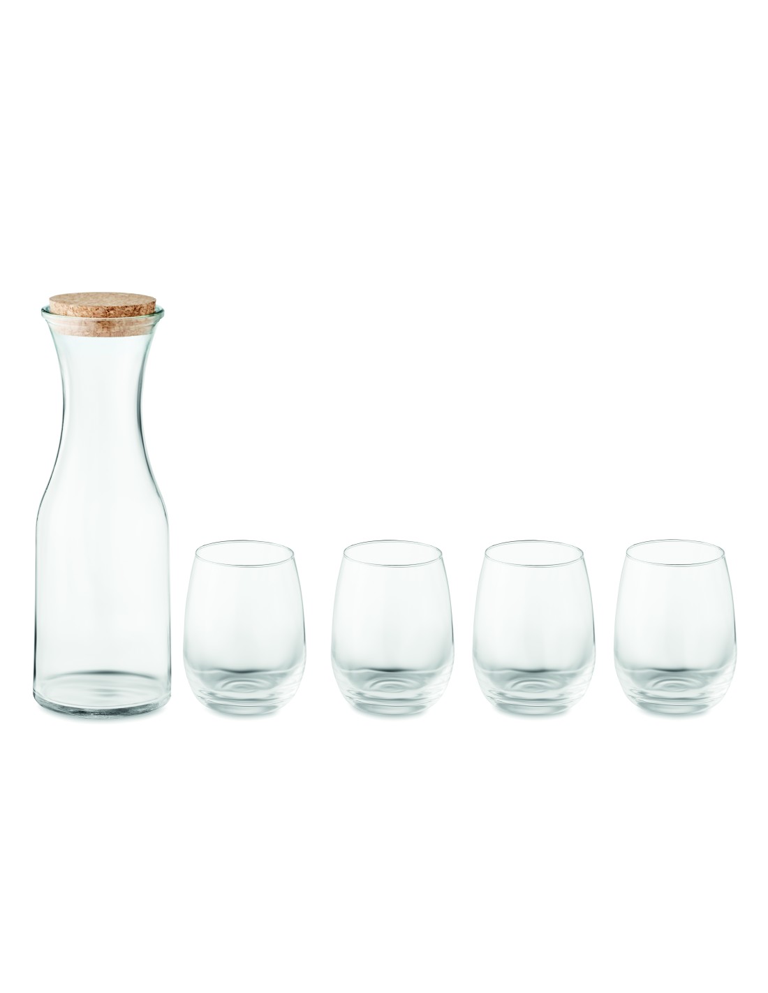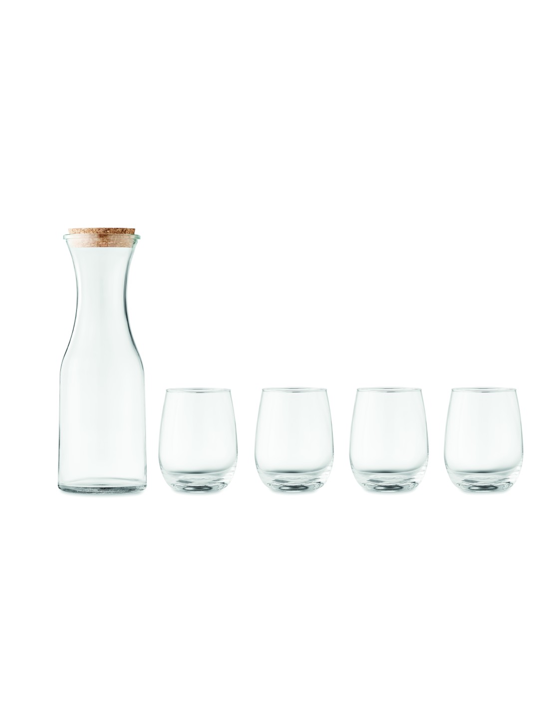 Set di bevande in vetro riciclato. Include: Caraffa (1L) con coperchio di sughero e 4 bicchieri (420 ml).