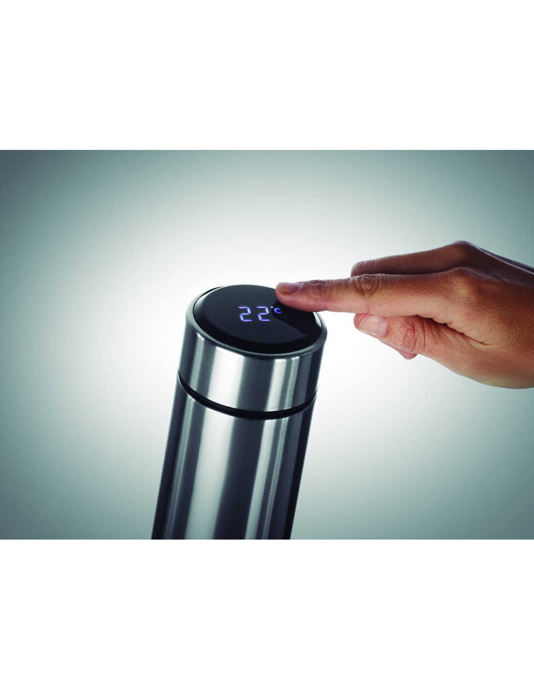 Thermos doppio strato isolante in acciaio inossidabile, antigoccia. Termometro touch a LED incorporato sul tappo, infusore interno. Funziona con 1 batteria CR2032 e sostituibile. 450ml.Antigoccia.