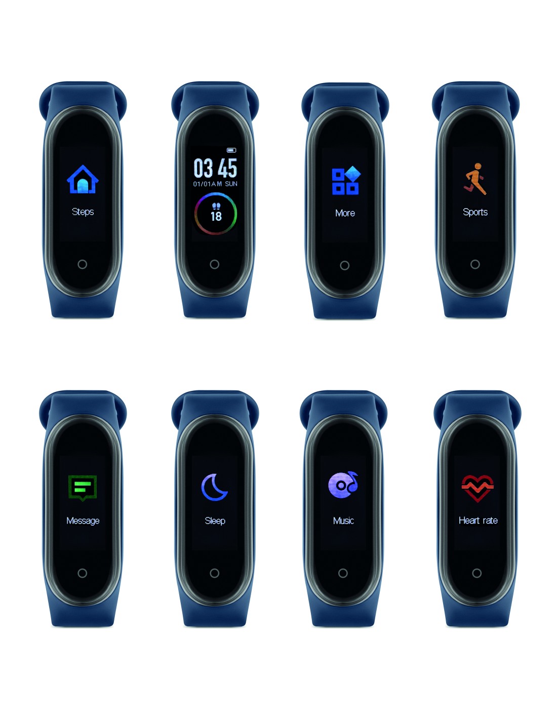 Touch screen a colori da 1,3''. Misura il battito cardiaco, l'ossigenazione del sangue e la pressione sanguigna. Ha una funzione di contapassi e termometro e può tenere traccia di più attività sportive. Monitoraggio del sonno, cronometro, allarme, notifiche, promemoria di chiamata e fotocamera...