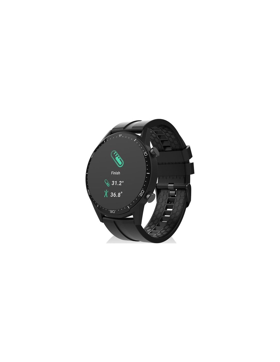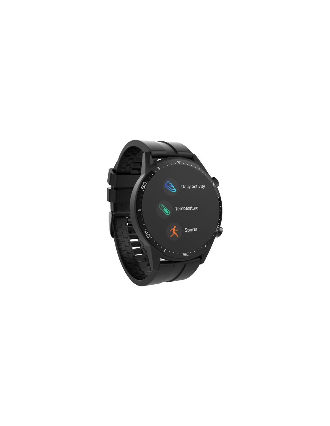 Smartwatch con termometro per la temperatura corporea, touch screen da 1,3 pollici e fotocamera integrata. Tiene traccia dell'attività fisica quotidiana e dispone di una modalità multisport. Batteria da 3,7 V/240 mAh. RAM 128 kB / ROM 64 Mb.