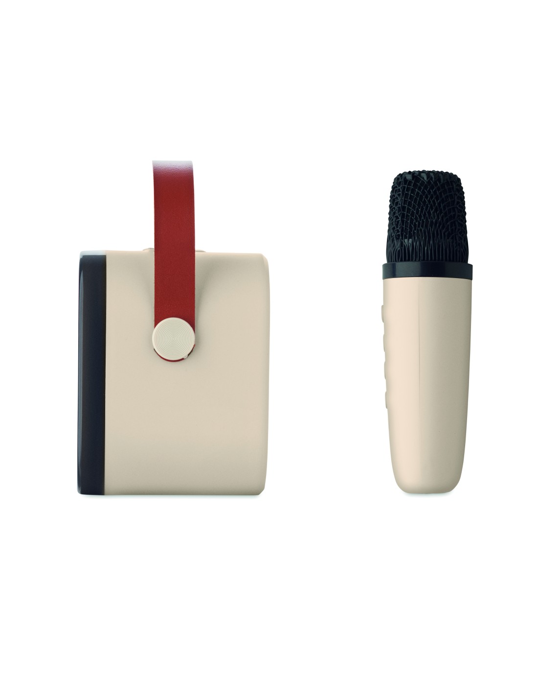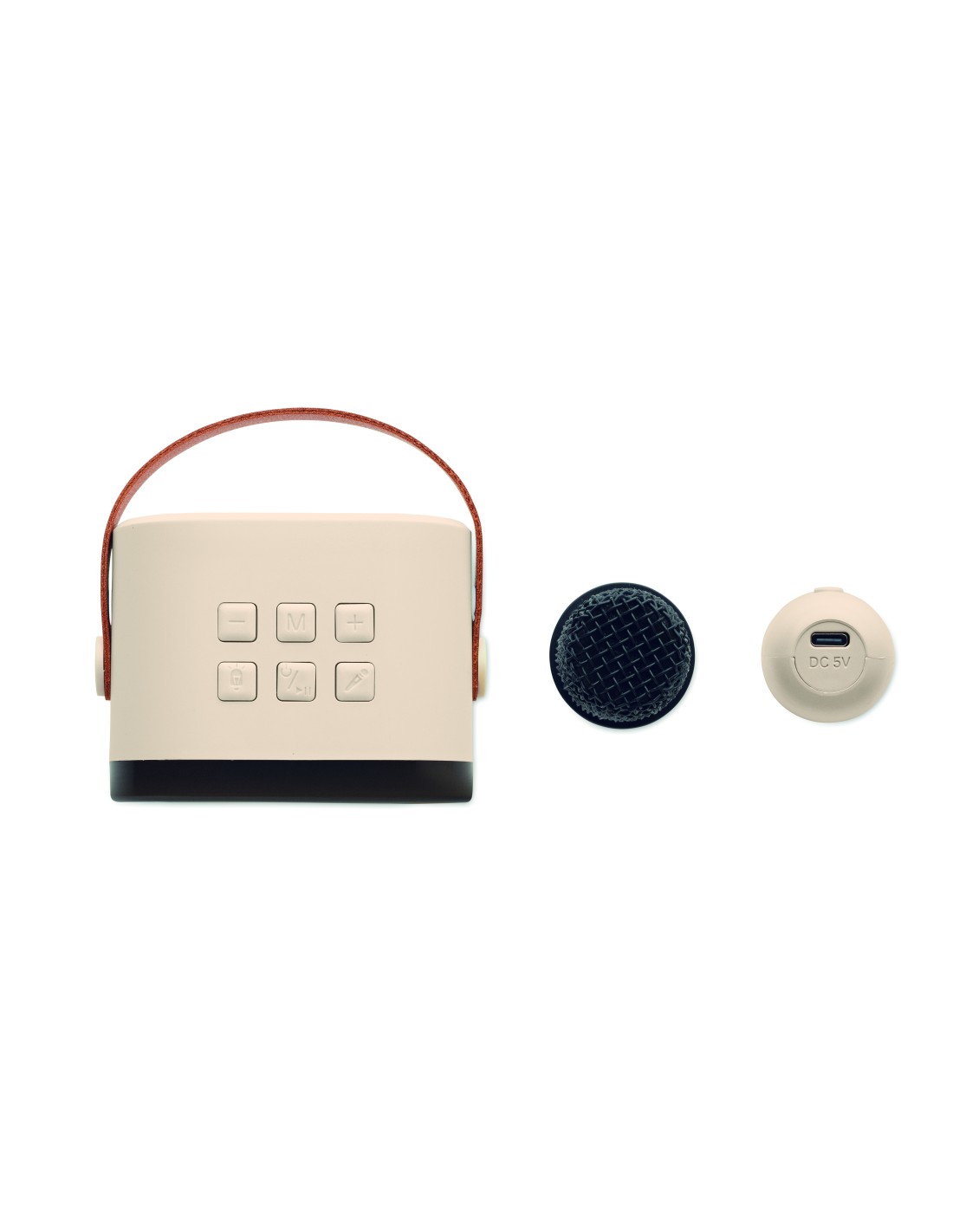 Speaker wireless 5.1 in paglia (35%) e ABS (65%) con finiture gommate e indicatore LED. 1 Batteria ricaricabile al Litio da 300 mAh. Output: 3W, 3 Ohm e 5V. Tempo di autonomia circa 2h.