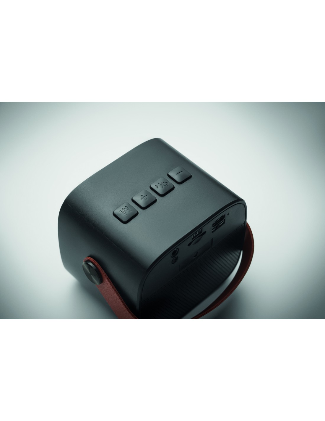 Speaker wireless 5.0 in ABS riciclato con impugnatura in PU. 1 batteria ricaricabile Li-ION 500 mAh inclusa. Include una porta per schede SD e un cavo AUX/USB. Dati di uscita: 5W, 3 Ohm e 5V. Tempo di riproduzione di circa 4 ore.