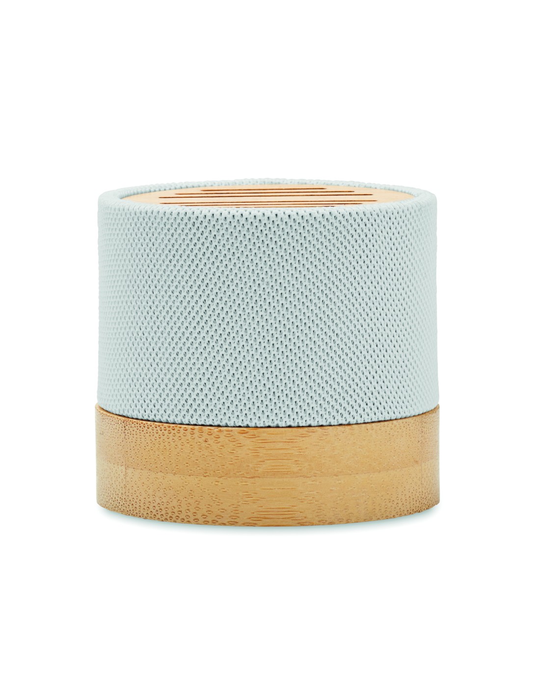 Speaker wireless 5.0 con involucro in RPET e dettaglio in bamboo sulla parte superiore. Con luce LED. 1 batteria ricaricabile Li-ION 300 mAh inclusa. Include una porta per schede SD e un cavo AUX/USB. Dati di uscita: 3W, 3 Ohm e 5V. Tempo di riproduzione di circa 3 ore.