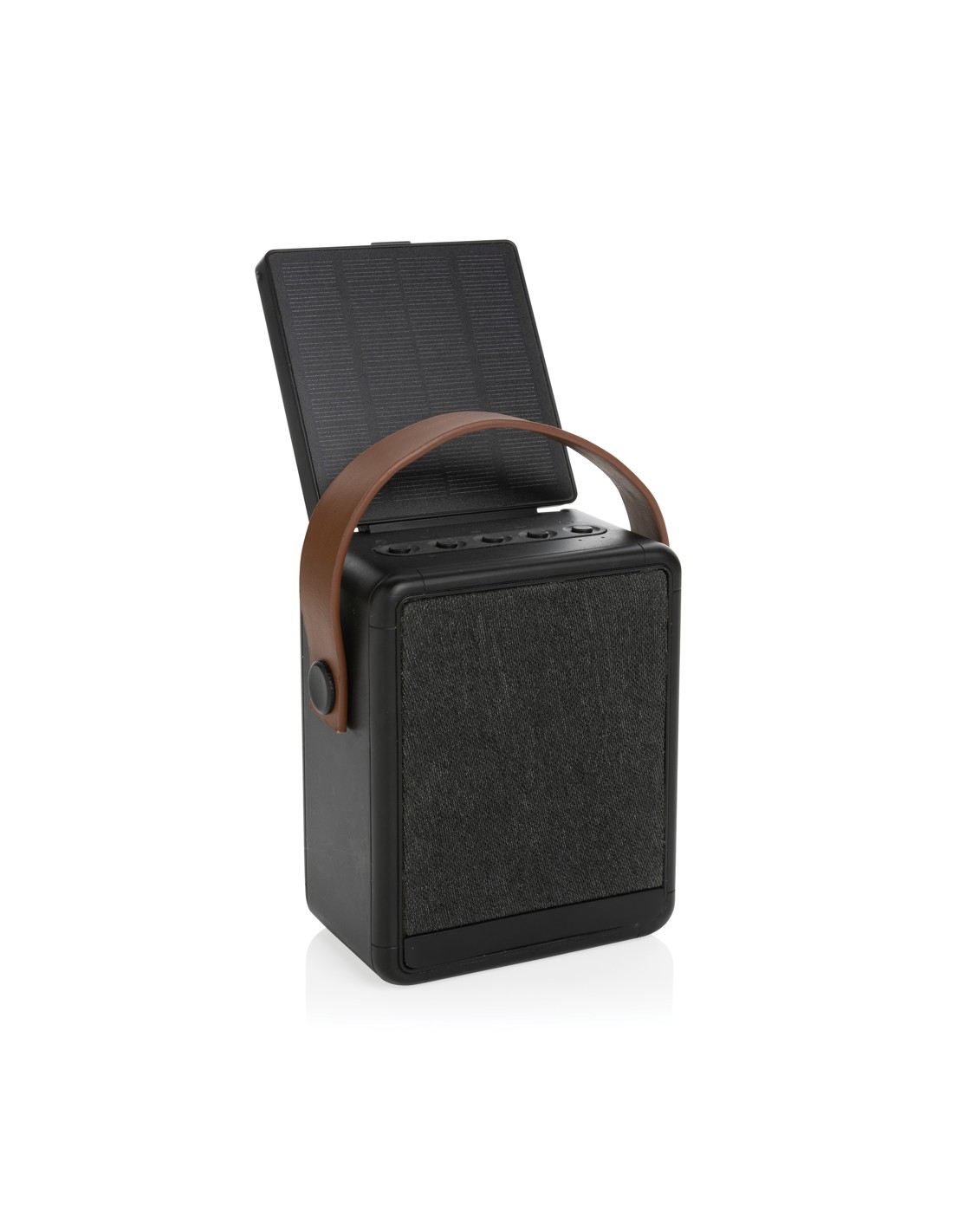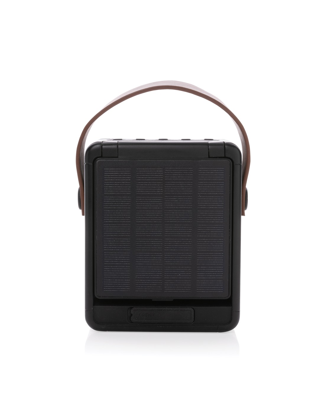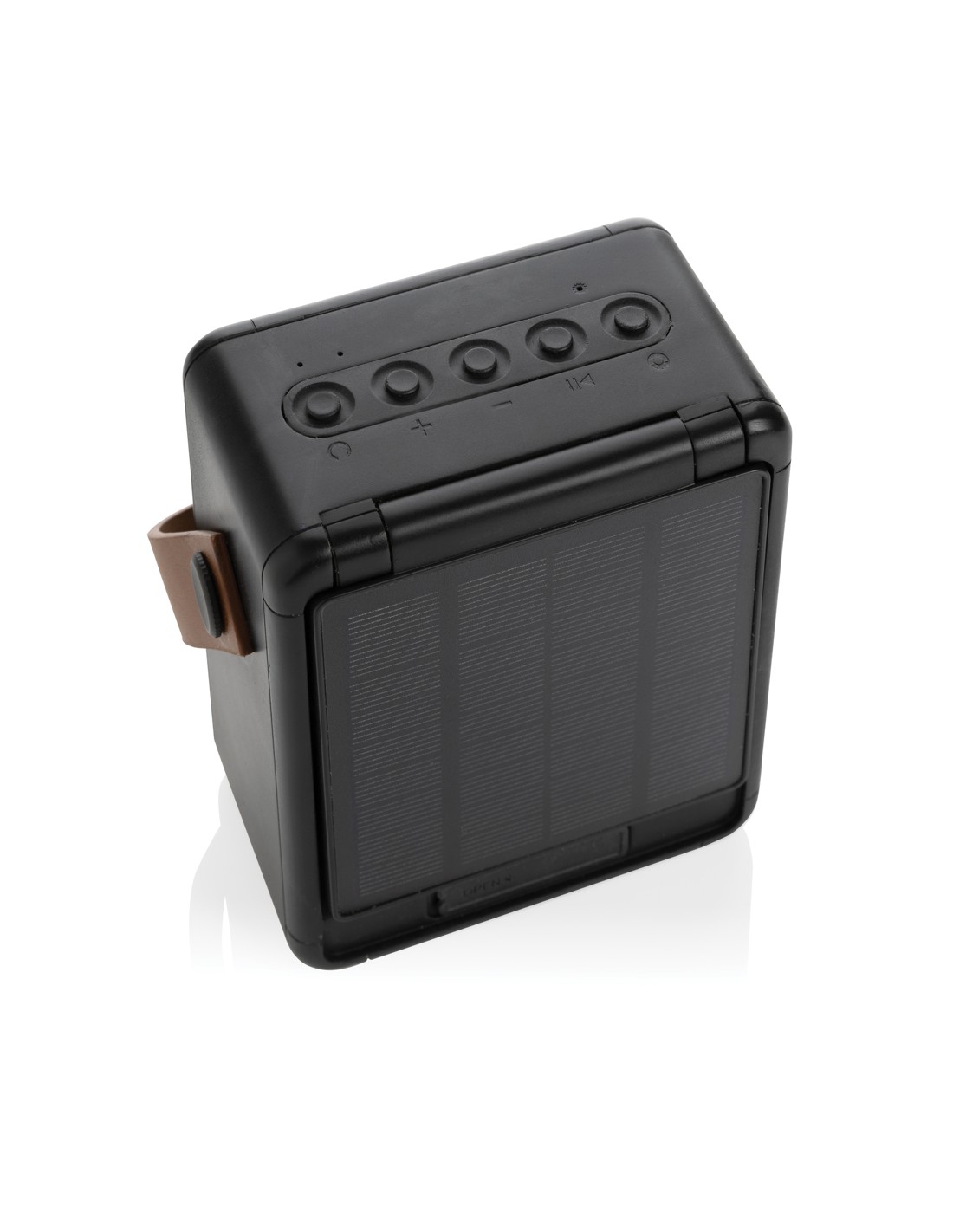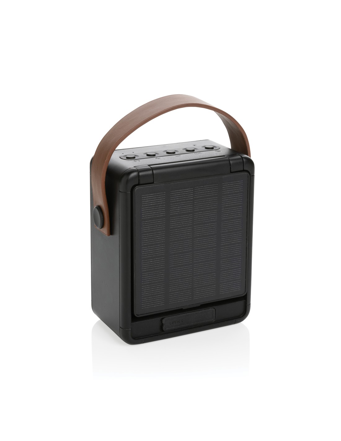 Potente speaker wireless da 12W con pannello solare integrato di grandi dimensioni in ABS riciclato certificato RCS. Contenuto riciclato totale: 16% in base al peso totale dell'articolo. La certificazione RCS garantisce una catena di approvvigionamento dei materiali riciclati completamente certificata. Lo speaker utilizza pannelli solari monocristallini di alta qualità con un tasso di conversione del 19%. La velocità di carica dipende dalle condizioni atmosferiche. Con lampada LED integrata per utilizzare il diffusore anche quando il sole è tramontato. E' dotato di una batteria da 2000 mAh che garantisce fino a 8 ore di riproduzione e di BT5.3 per una connessione fluida e un suono chiaro. Raggio di connessione fino a 10 metri. Con microfono e funzione di risposta alle chiamate. Velocità di ricarica solare: 5V/300mA. Confezionato in scatola FSC mix FSC®. Incluso cavo di ricarica in TPE riciclato certificato RCS. Articolo e accessori 100% senza PVC