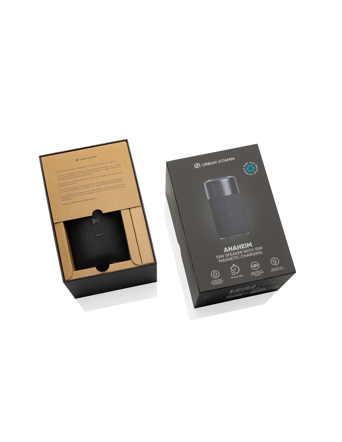 Scatenatevi con Urban Vitamin Anaheim! Questo speaker da 10W offre un suono eccellente e fino a 8 ore di riproduzione. Inoltre, è dotato di un caricatore wireless magnetico da 15W per alimentare i vostri dispositivi durante l'ascolto. Dovete rispondere ad una chiamata? Il microfono incorporato è a portata di mano. Realizzato al 37% in rPET e ABS riciclati RCS. Include un cavo type C riciclato da 120 cm, il tutto in scatola a ridotto contenuto di plastica e priva di PVC. Musica e ricarica in un unico elegante dispositivo!