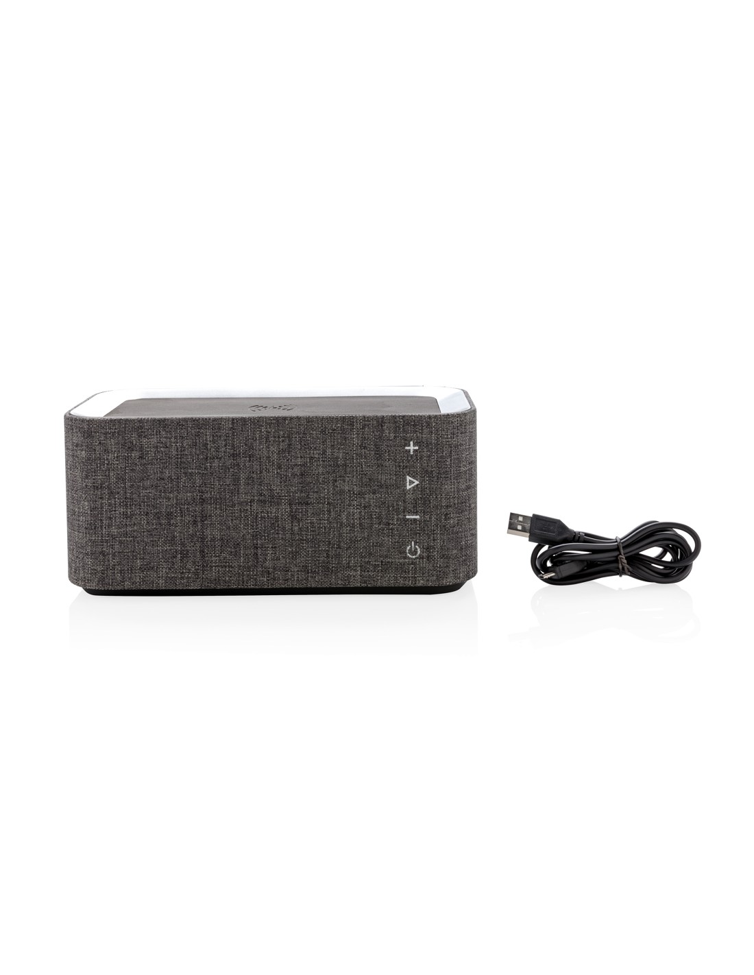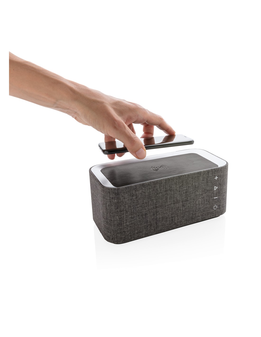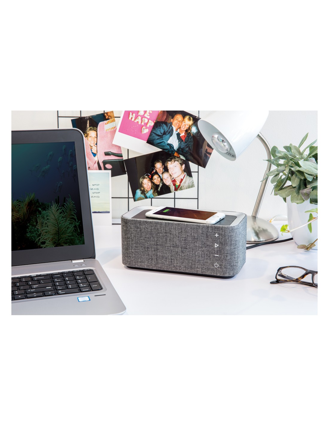 Lo speaker e caricatore wireless da 6W ha due funzioni essenziali per lo stile di vita moderno: ascoltare la tua musica preferita e ricaricare il tuo smartphone senza cavi. Il suo design in tessuto è perfetto per la tua scrivania, a casa o durante i tuoi viaggi. Grazie alla tecnologia BT 3.0 avrai una connessione pulita e stabile fino a 10 metri. Include tasto per rispondere alle chiamate in entrata. La batteria da 4.000 mAh ti consente di ascoltare musica per circa 10 ore oppure di ricaricare il tuo smartphone circa 2 volte (dipende dalla capacità della batteria del telefono). Nel caso in cui il tuo smartphone non supporti la ricarica wireless, potrai farlo tramite cavo utilizzando la porta USB sul retro. Se utilizzi le 2 tecnologie contemporaneamente è consigliato collegarlo ad una fonte di energia grazie al cavo micro USB da 150 cm. Input: 5V/1A. Output: 5V/1A. Wireless output: 5W. Design registrato®