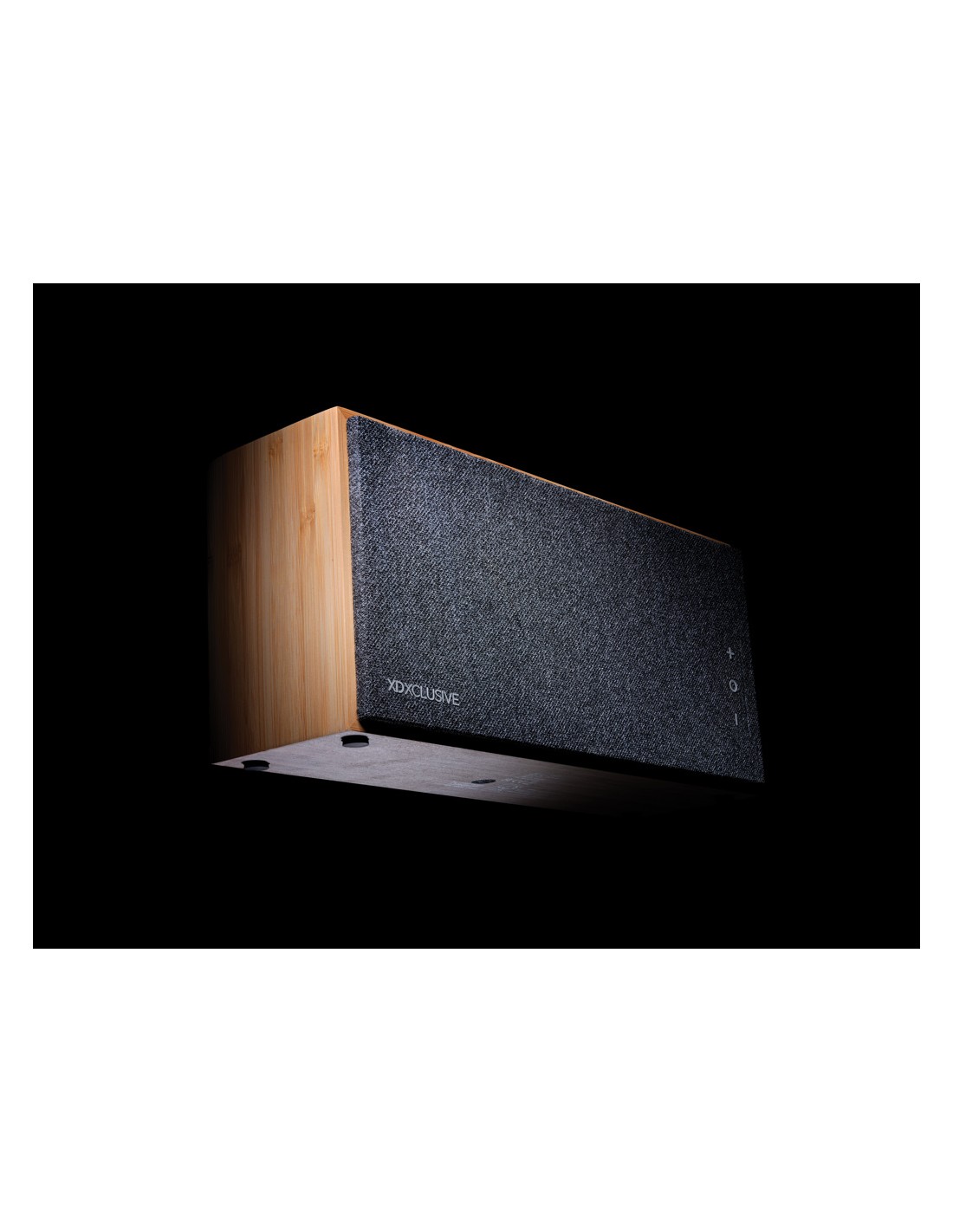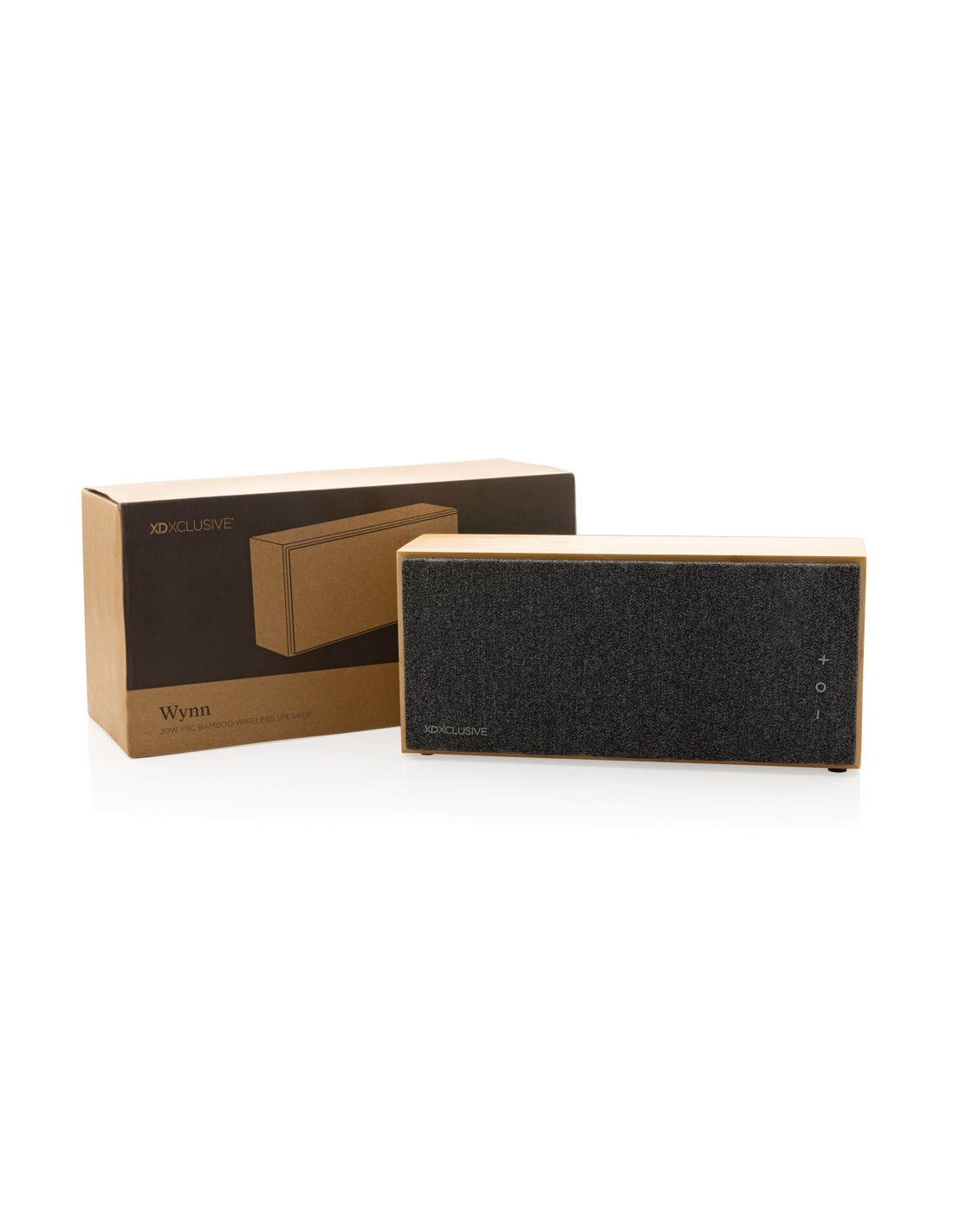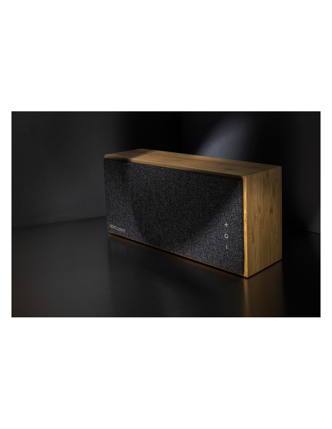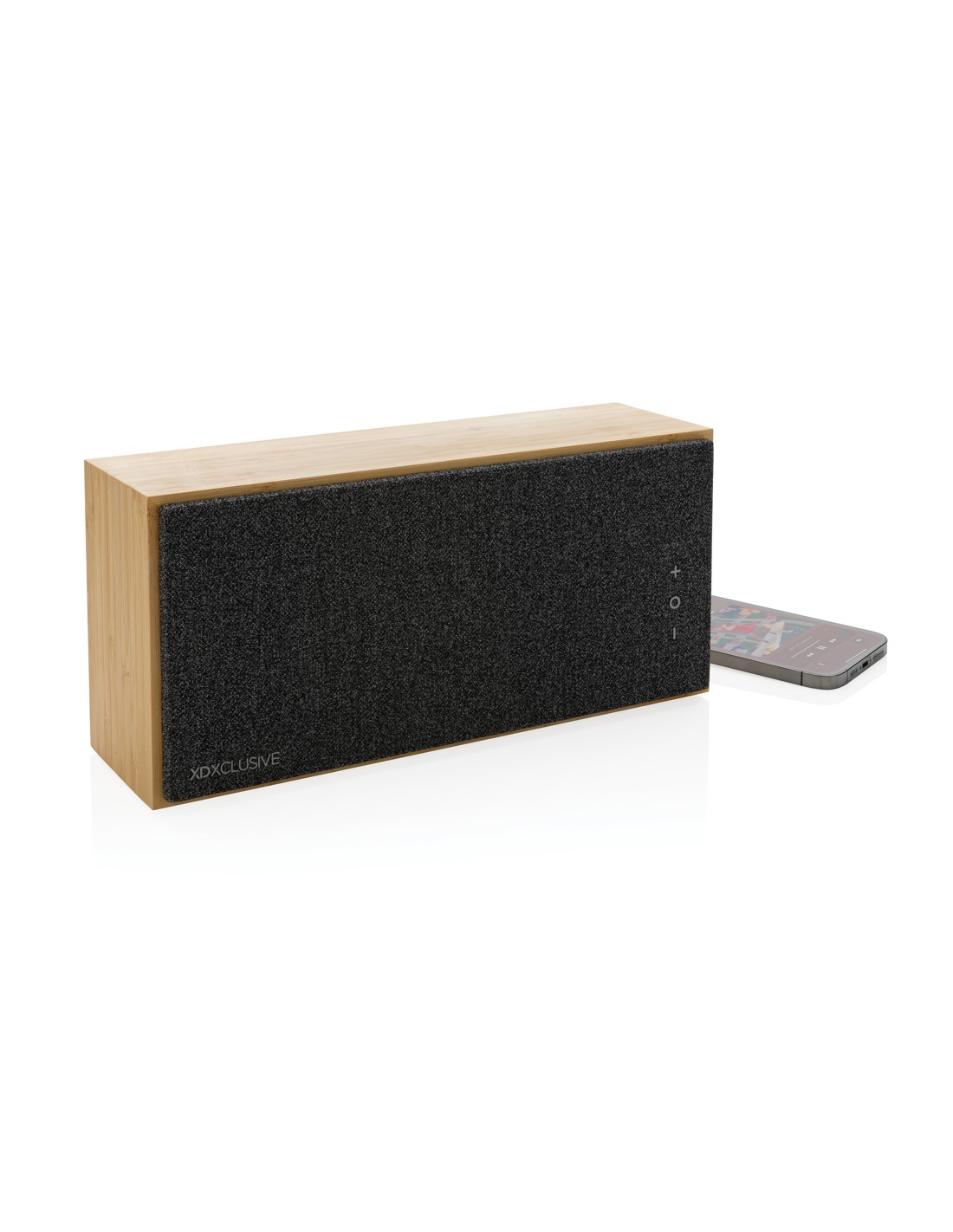 5.3 speaker wireless in ABS con finitura in tessuto poliestere RPET e caricatore wireless da 15W in bamboo, con maniglia in iuta. 1 batteria ricaricabile agli ioni di litio da 1200 mAh. Dati di uscita: 5W, 4 Ohm e 5V. Tempo di riproduzione di circa 4 ore.