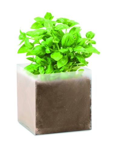 Sacchetto con semi di basilico. Aggiungendo 300 ml di acqua si ottiene 1 litro di compost da giardino.