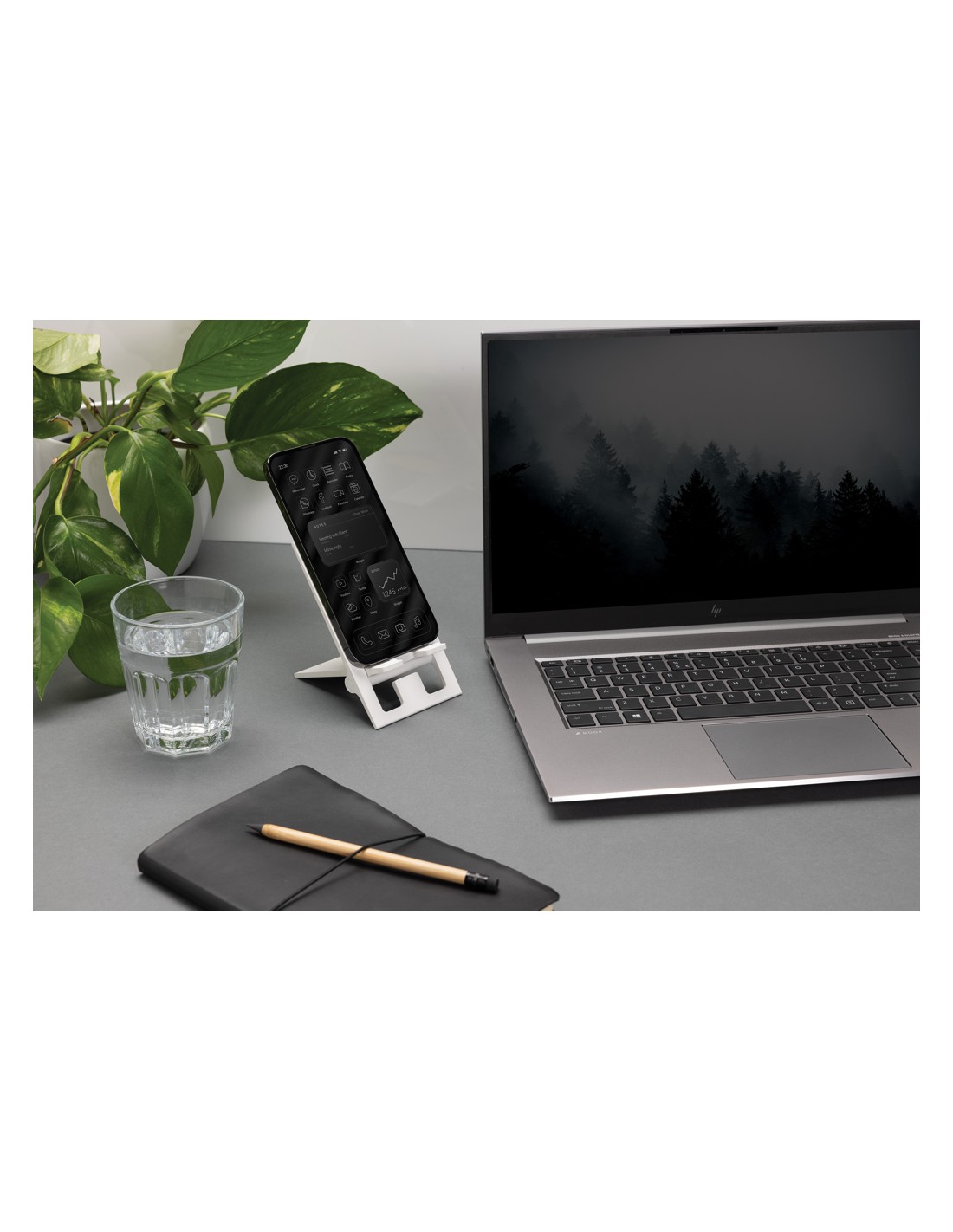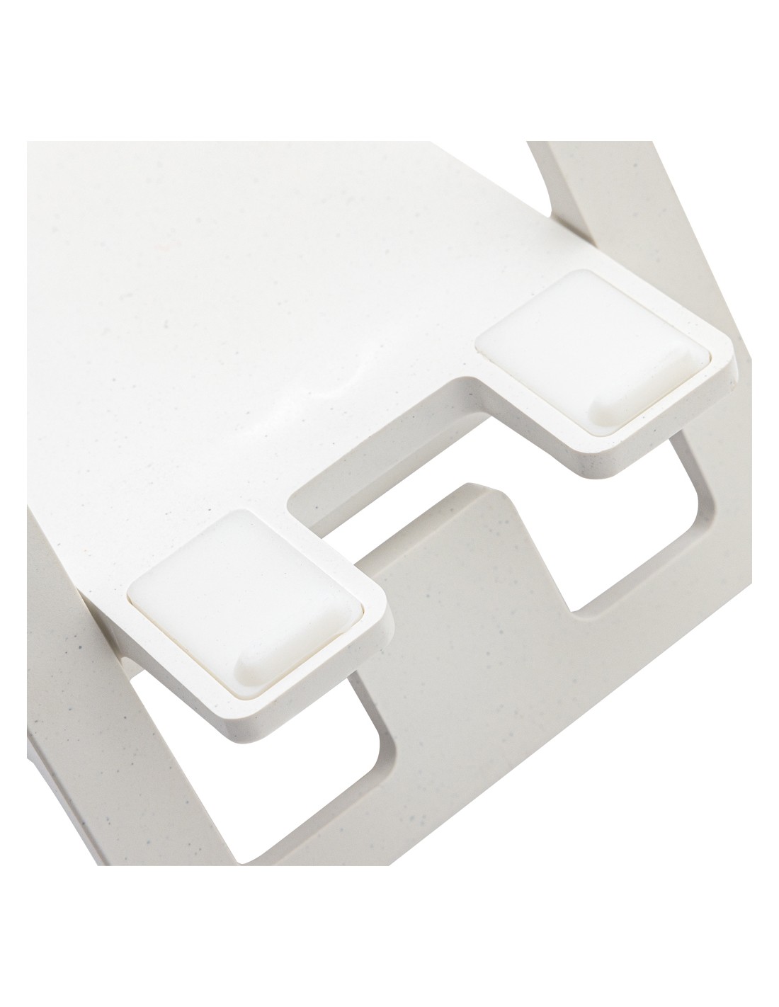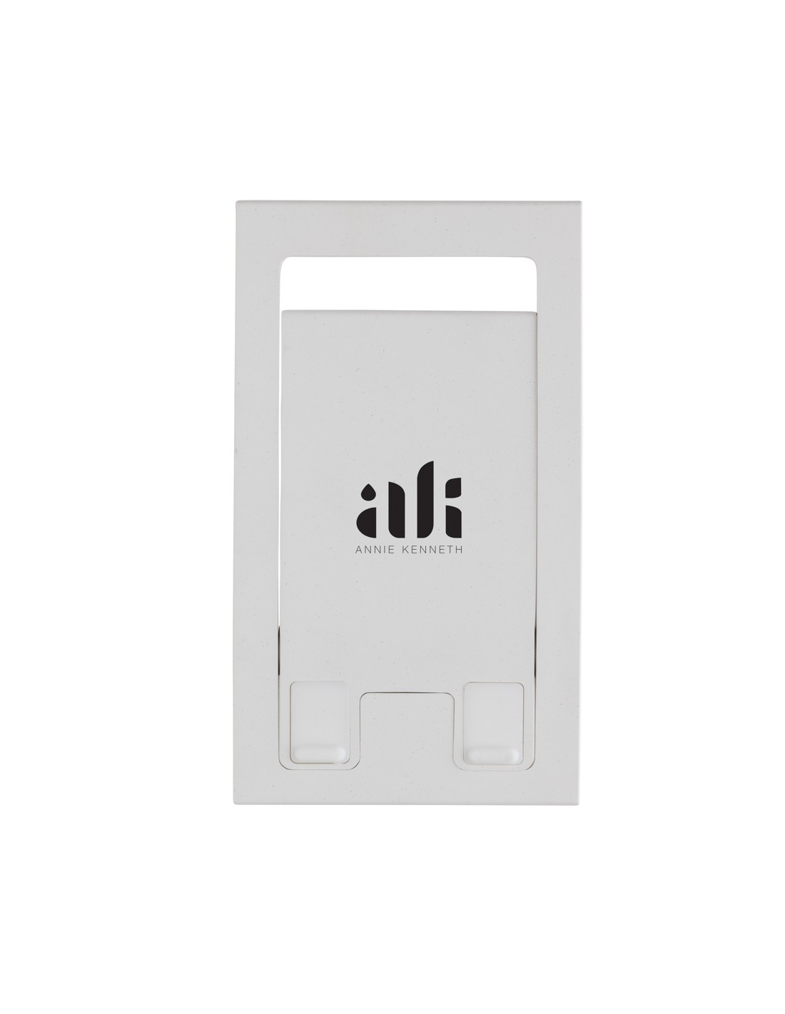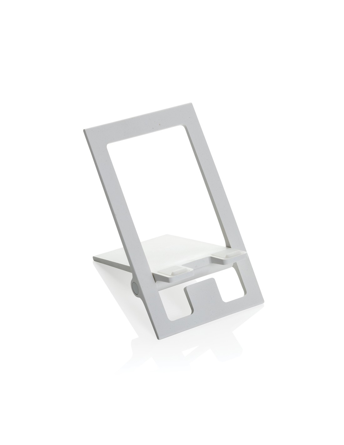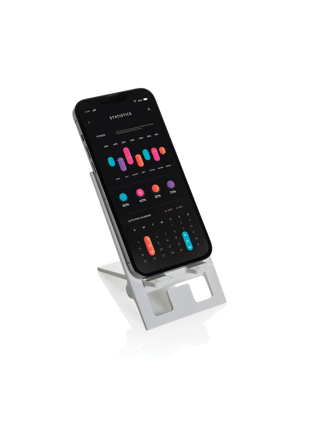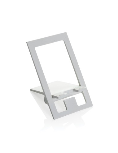 Supporto per telefono piatto e pieghevole realizzato in ABS riciclato RCS. Il supporto viene fornito piatto e piegato e può essere dispiegato in un supporto per telefoni di tutte le dimensioni. E' sufficientemente robusto per regolare l'angolo di visione. È dotato di un'imbottitura in silicone per mantenere il telefono in condizioni ottimali. Contenuto totale riciclato: 85% in base al peso totale dell'articolo. La certificazione RCS garantisce una catena di approvvigionamento completamente certificata dei materiali riciclati. Confezionato in una scatola FSC®. Senza PVC.
