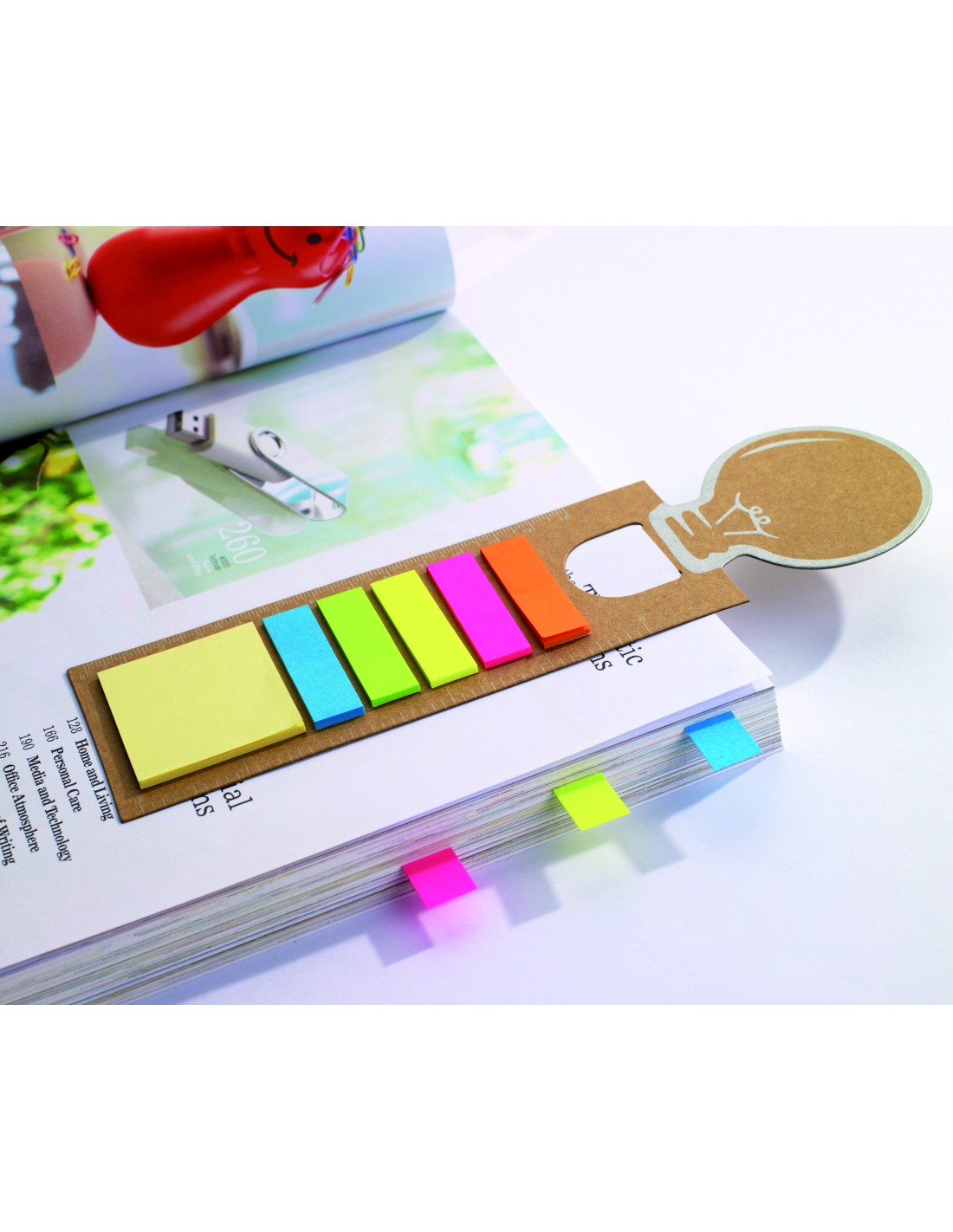 Segnalibro a forma di lampadina in cartone riciclato. Blocco note adesive da 2 pezzi. Blocchi note adesive in carta riciclata gialla media e 5 segnalibri di pagina assortiti. Righello da 13 cm.