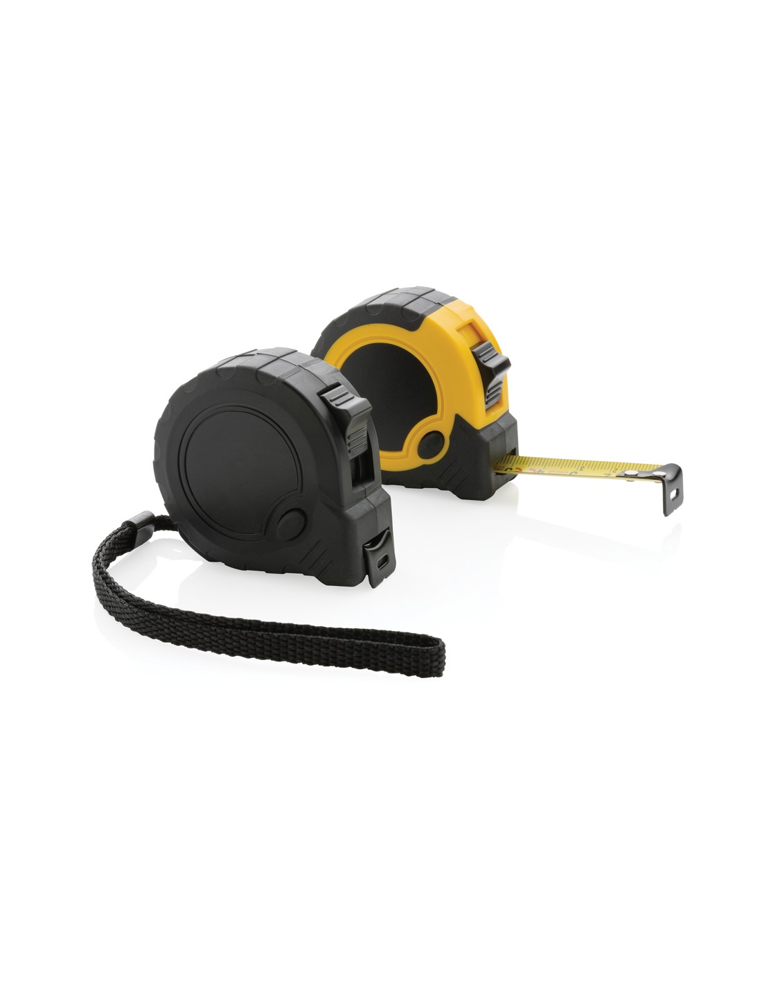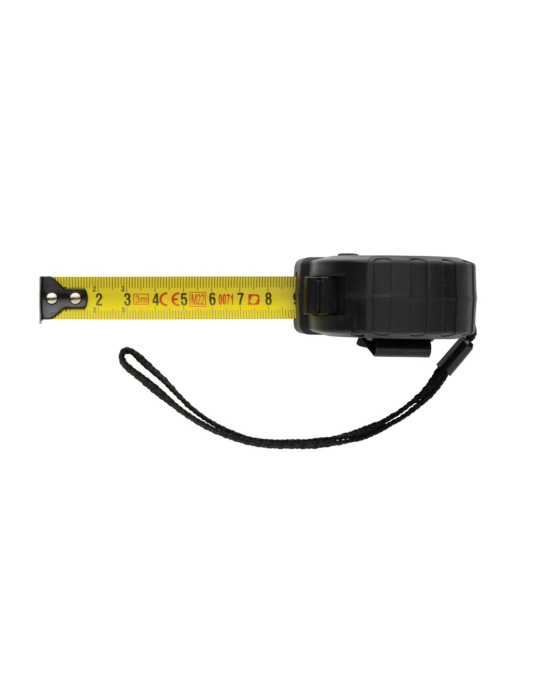 Flessometro da 3 metri realizzato con ABS riciclato certificato RCS (Recycled Claim Standard). Contenuto totale riciclato: 17% in base al peso totale dell'articolo. La certificazione RCS garantisce una filiera completamente certificata dei materiali riciclati. L'mpugnatura in gomma TRP deluxe garantisce una presa sicura. Pulsante di sblocco/blocco e ulteriore pulsante di blocco sul lato. Nastro da 16mm giallo con gancio in acciaio al carbonio nero. Cinturino da polso in poliestere. Confezionato in scatola FSC® mix.