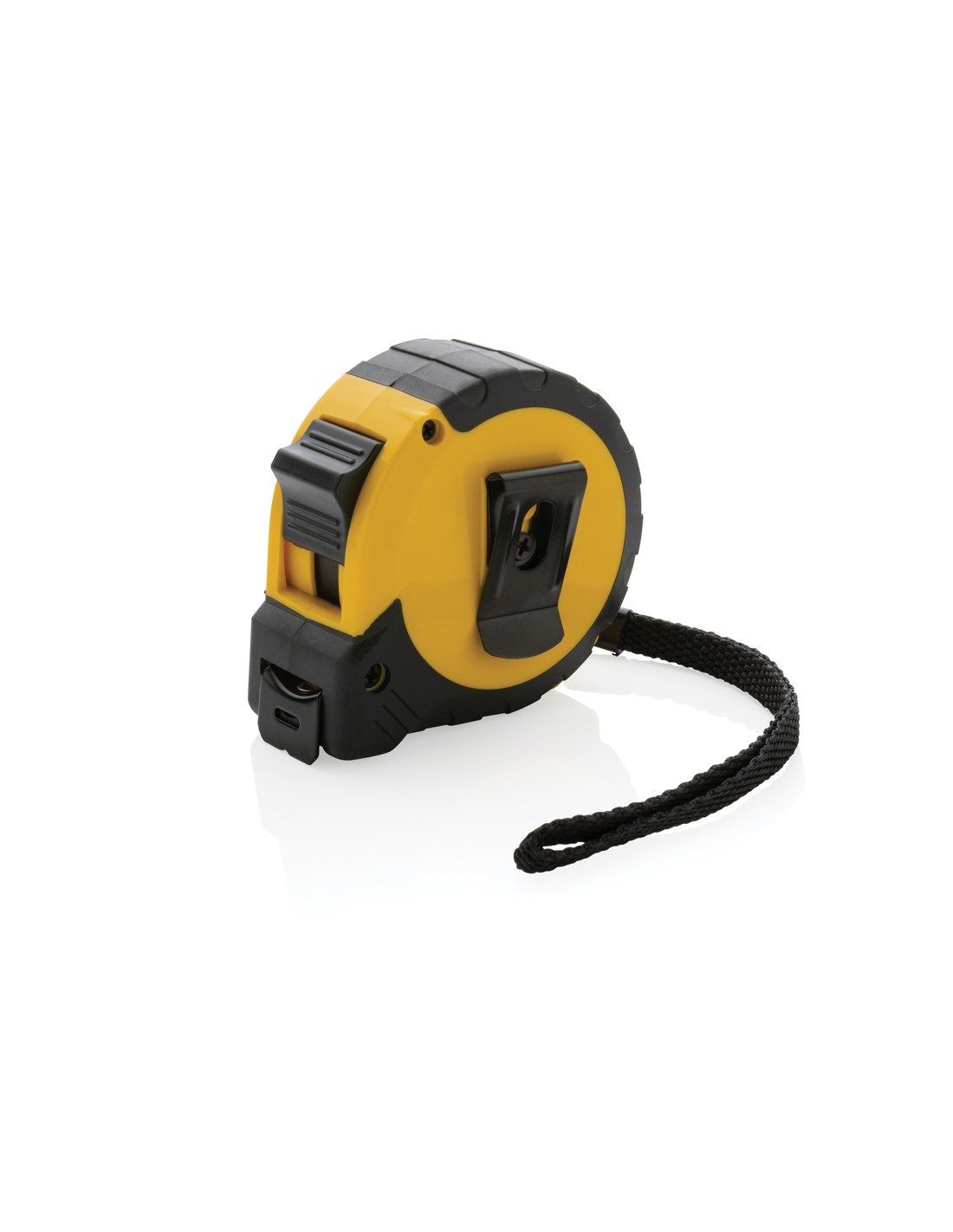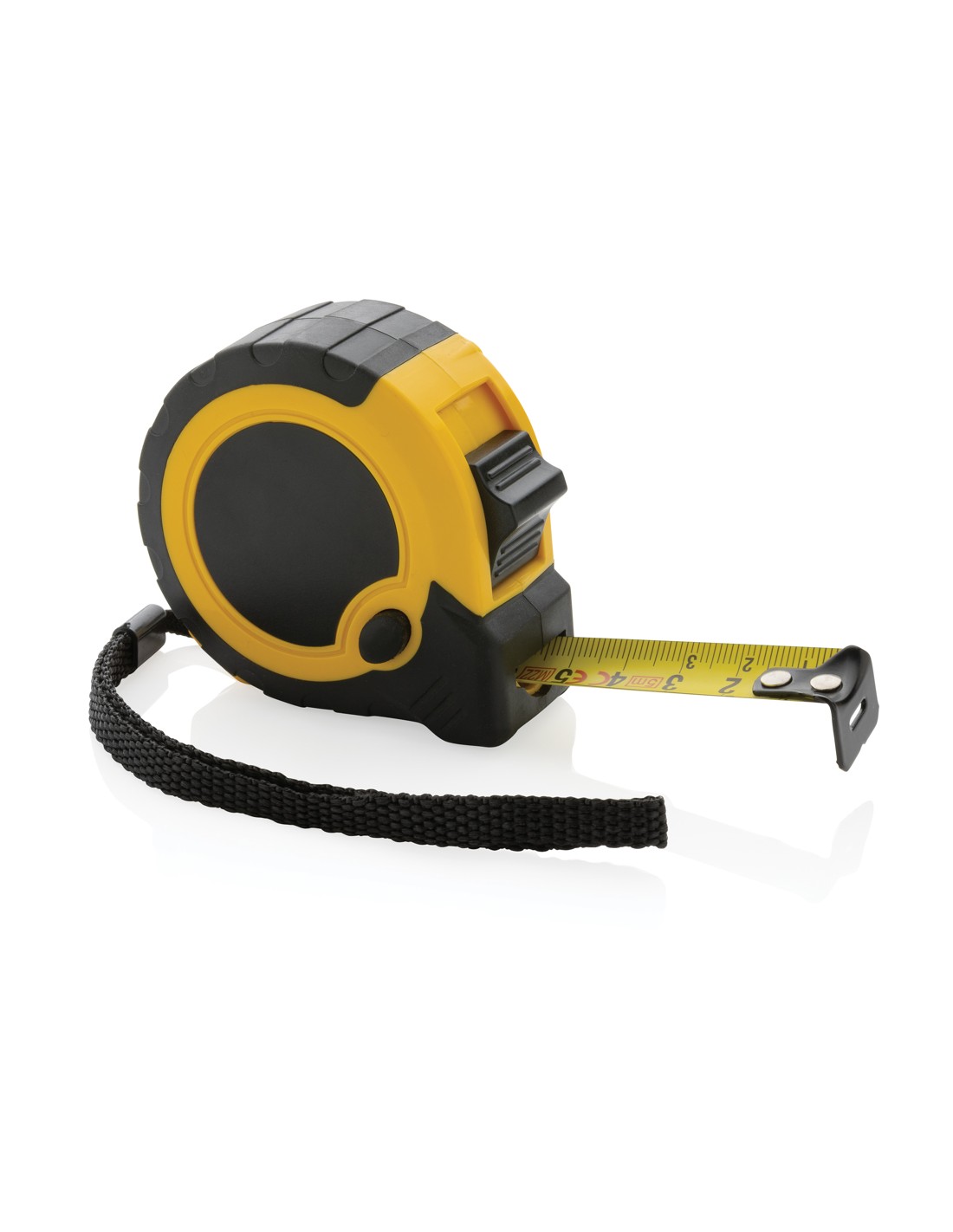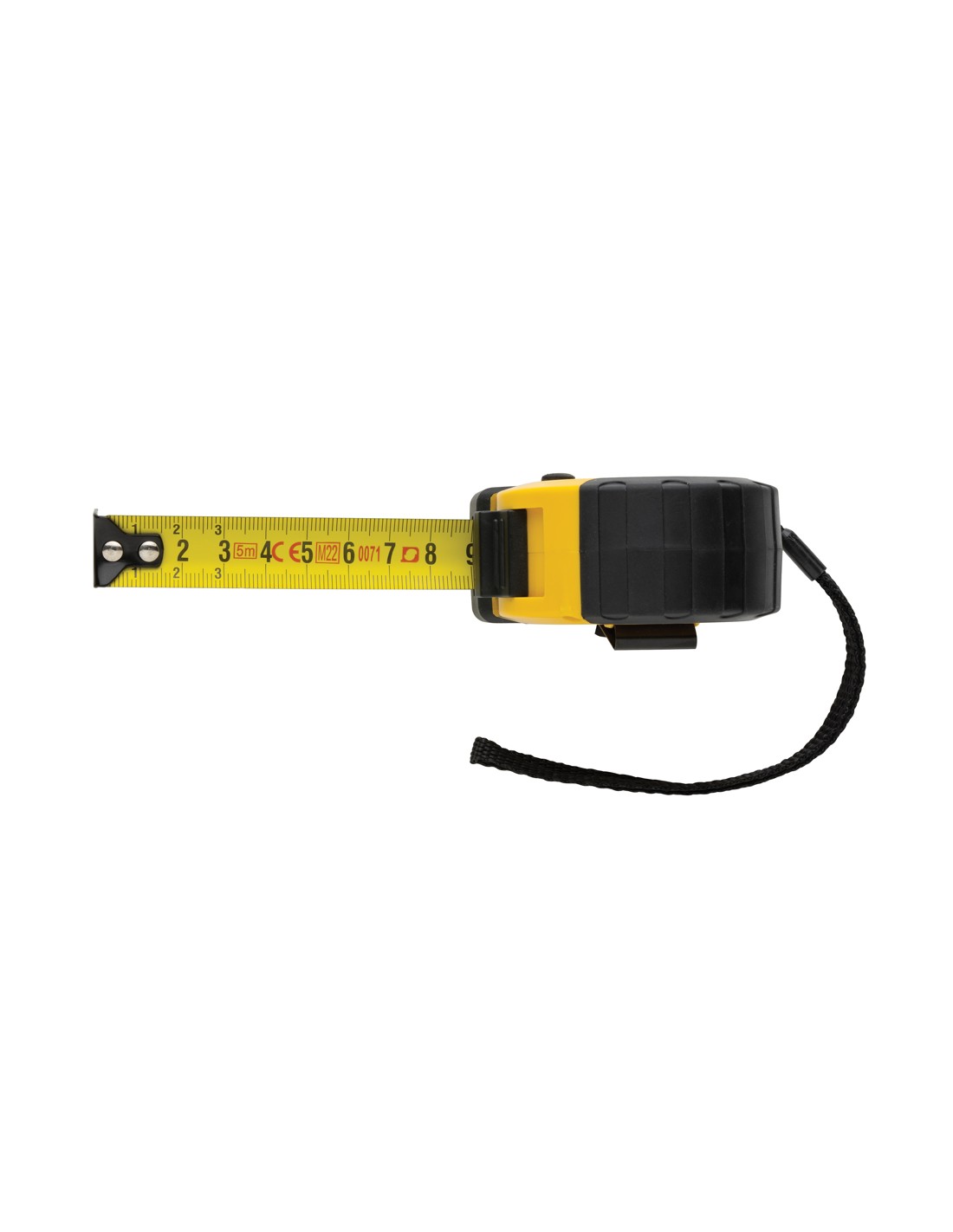 Flessometro da 5 metri realizzato con ABS riciclato certificato RCS (Recycled Claim Standard). Contenuto totale riciclato: 15% in base al peso totale dell'articolo. La certificazione RCS garantisce una filiera completamente certificata dei materiali riciclati. L'mpugnatura in gomma TRP deluxe garantisce una presa sicura. Pulsante di sblocco/blocco e ulteriore pulsante di blocco sul lato. Nastro da 19mm giallo con gancio in acciaio al carbonio nero. Cinturino da polso in poliestere. Confezionato in scatola FSC® mix.