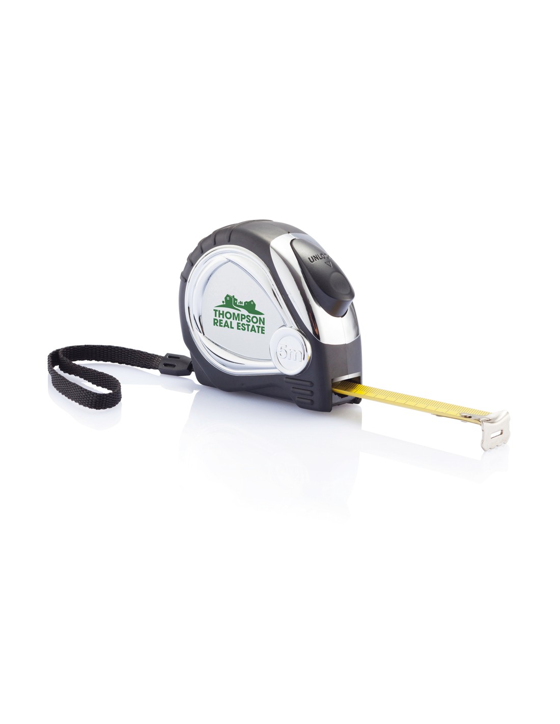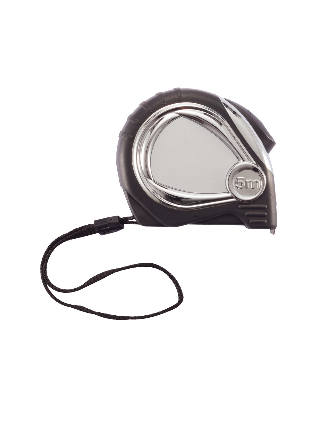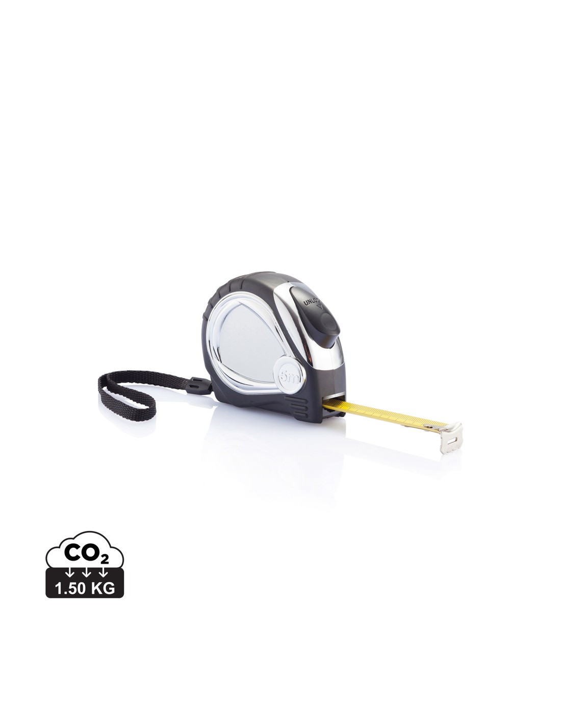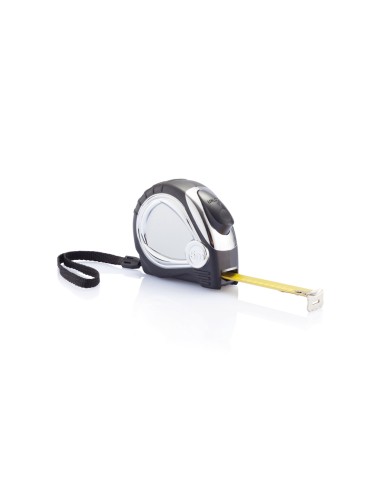 Guscio in ABS cromato con presa in gomma, nastro 5m/19mm in colore giallo opaco. Fornito di clip e cordino