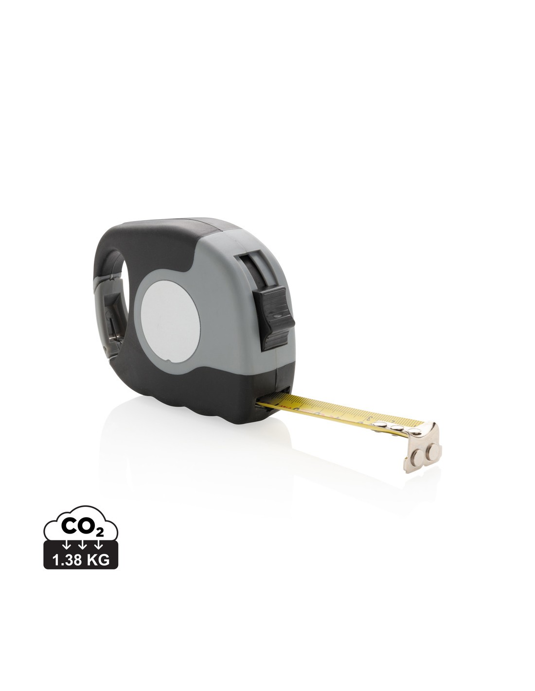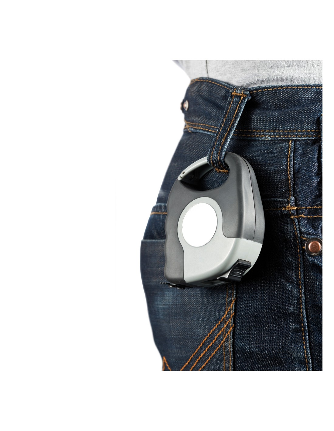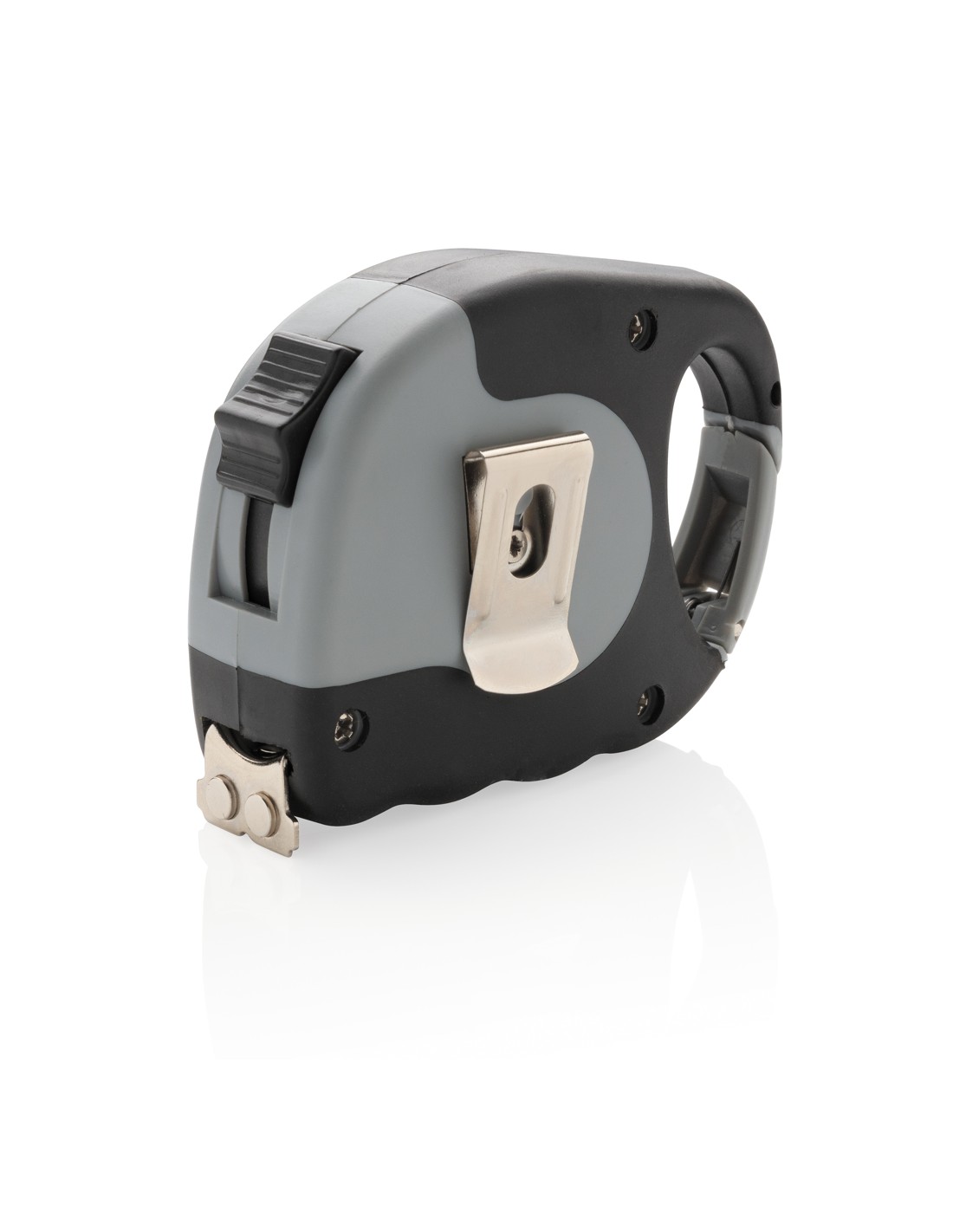 Flessometro 5m/19mm con moschettone. Ha il corpo grigio in ABS con impugnatura in TPR nera, clip nera per cintura, pulsante per autobloccaggio, gancio nero con 2 potenti magneti, nastro giallo, etichetta adesiva argentata opaca in PVC, confezionato in scatola bianca. Design registrato®