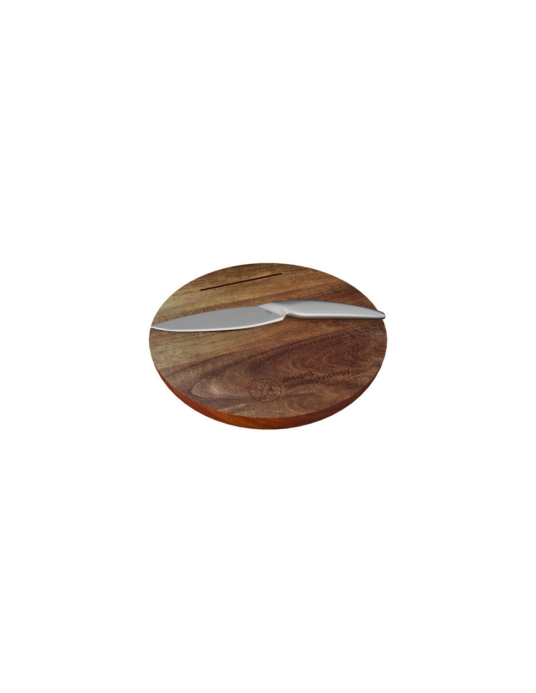 Esclusivo tagliere in legno di acacia e set di coltelli in acciaio inox. Prodotto personalizzabile con logo inciso. Il tagliere (diametro 30 cm con altezza 4 cm) è stato progettato con un inserto (30,4 x 4 x 2 cm) in cui riporre il coltello dopo l'uso. Entrambi i prodotti sono forniti in una confezione regalo in carta riciclata (36,8 x 33,5 x 5,1 cm) con chiusura magnetica. Garanzia di 3 anni inclusa.