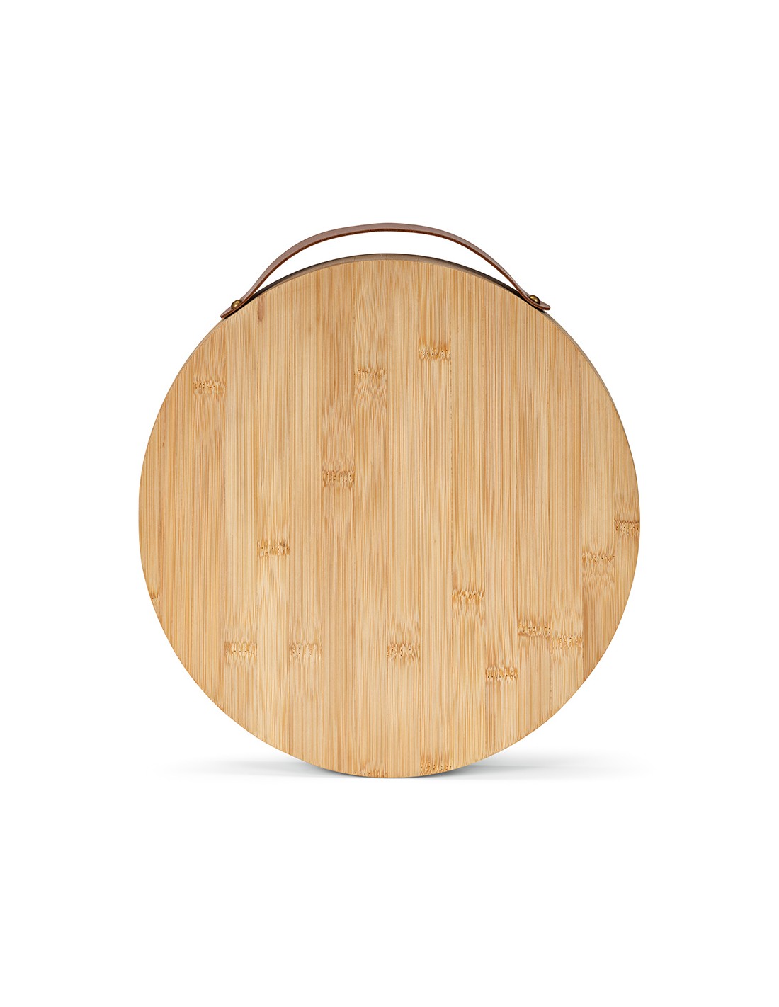Tagliere Duchamp in bambù con manico. Diametro 30cm e spessore 2,6cm. Tre utensili in acciaio inossidabile (coltello, forchetta e spatola) incassati sul retro del tagliere Duchamp, ideale per serate di formaggi e vini o riunioni di famiglia. Il manico facilita la conservazione quando non in uso, rendendo questo tagliere un’aggiunta elegante a qualsiasi cucina. Confezionato in una scatola kraft individuale.