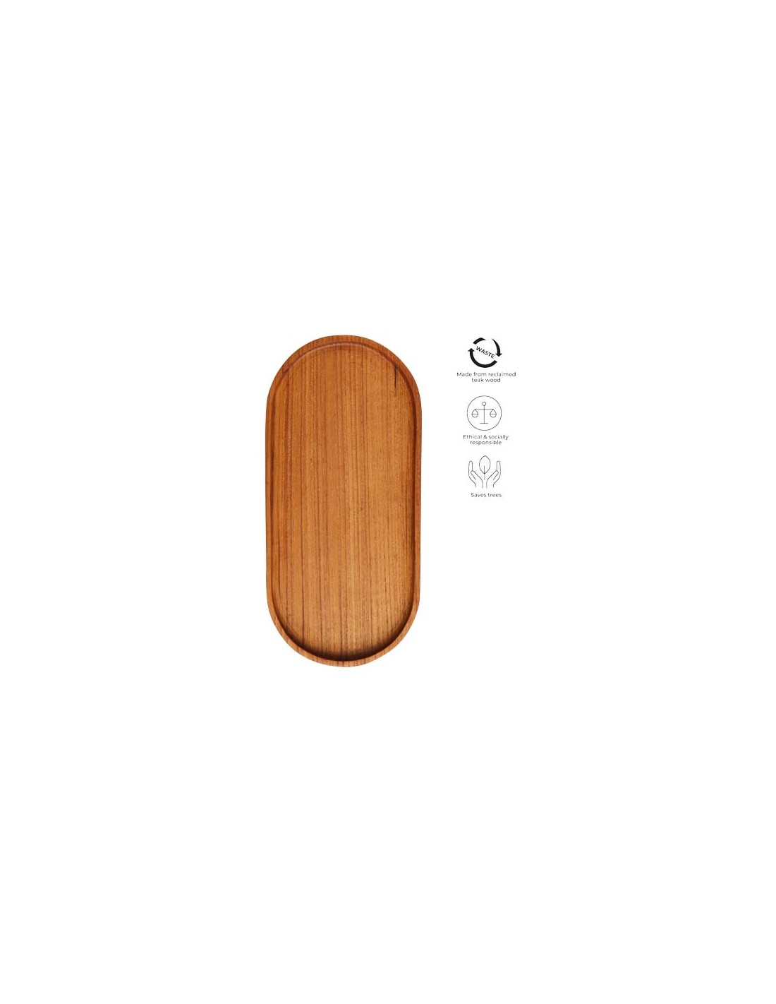 Vassoio di forma ovale ricavato dalla radice di un albero di teak, un prodotto di scarto dell'industria del teak. Proviene da piantagioni di teak certificate in Indonesia ed è fatto a mano da artigiani in un piccolo laboratorio rurale nell'East-Java. Adatto per servire snack, dolci, caffè o tè. Ogni articolo ha un aspetto naturale e unico. Sicuro per gli alimenti. Dimensioni: 24 x 12 x 1,5 cm.
