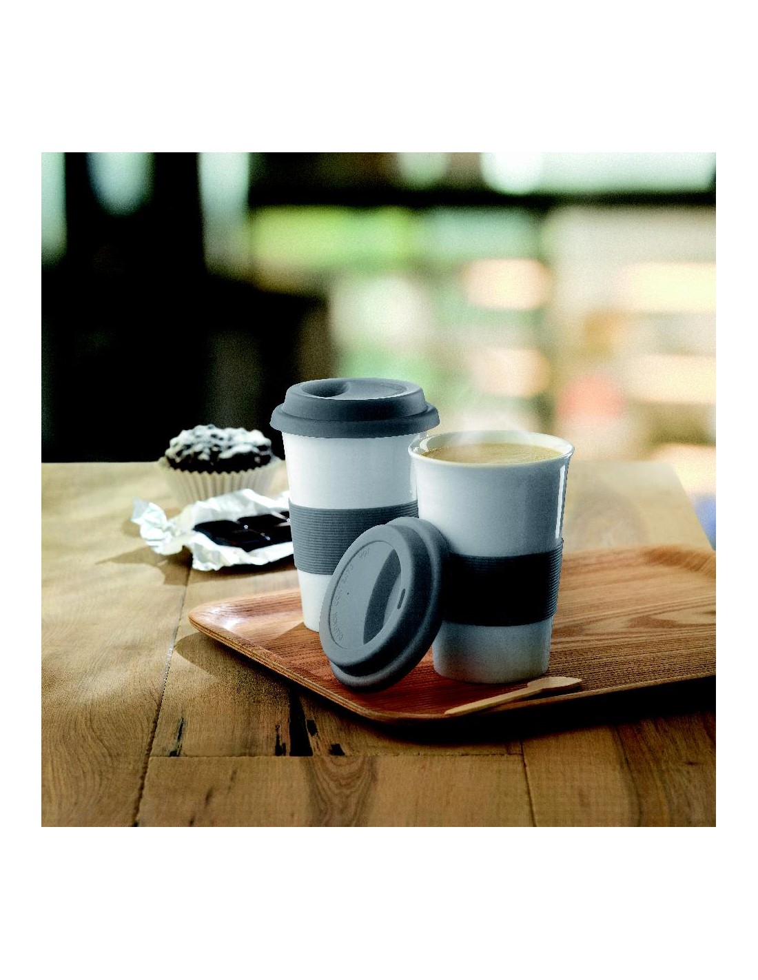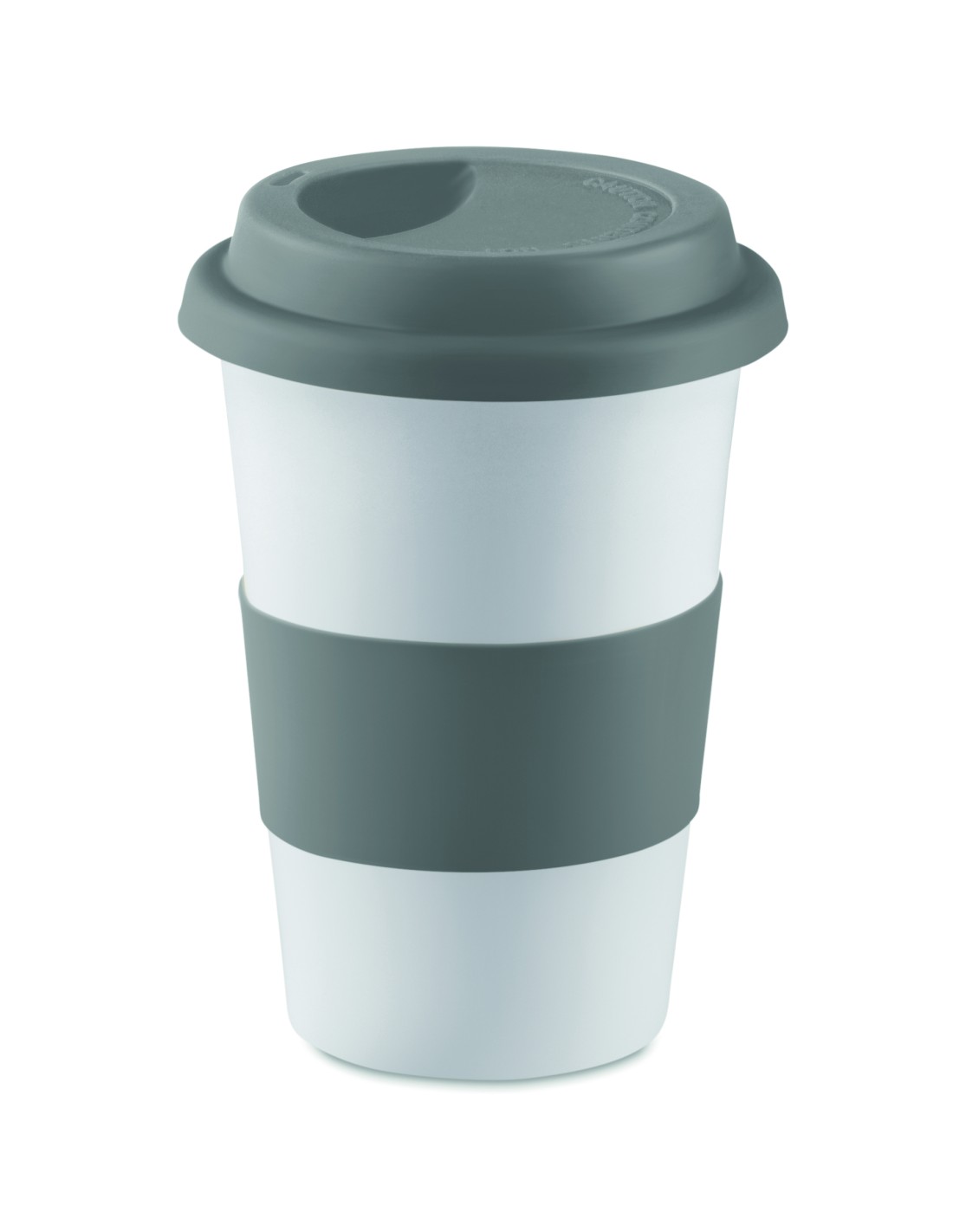 Bicchiere in ceramica a strato singolo, con coperchio e anello intermedio in silicone. Capacità 400ml. Il transfer su ceramica resiste al lavaggio in lavastoviglie. Disponendo di un solo strato potrebbe scaldarsi anche esternamente.