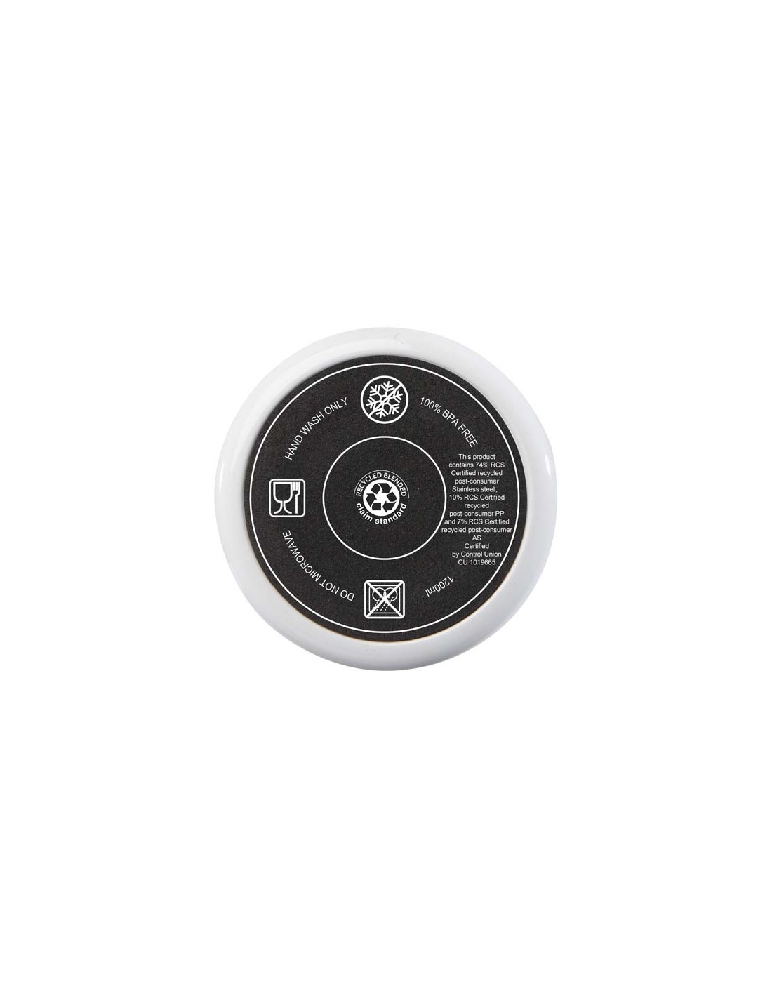 La tazza Melbourne è caratterizzata da un isolamento termico ad aria a doppia parete che permette di mantenere le bevande calde per 2 ore e fredde per 4 ore. La parete interna della tazza è composta da plastica riciclata e la parete esterna è realizzata in acciaio inossidabile riciclato certificato RCS. La tazza ha una capacità di 1200 ml, sufficiente per una perfetta idratazione per tutta la giornata. È caratterizzata da un coperchio a pressione a prova di schizzi con due aperture e chiusura girevole. Viene fornita con una cannuccia in materiale riciclato per alimenti. Lavarla solo a mano.