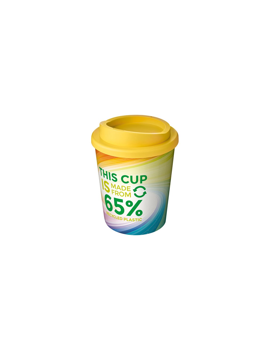 Bicchiere termico a doppia parete con coperchio twist e stampa full color su tutto il prodotto. Realizzato in materiale riciclato al 65% (tazza riciclata e interno nero), con un coperchio in plastica standard. Il bicchiere è completamente riciclabile, lavabile in lavastoviglie e adatto al forno a microonde. Capacità: 250 ml. Senza BPA. Confezionato in un sacchetto idoneo al compostaggio domestico. Prodotto nel Regno Unito.
