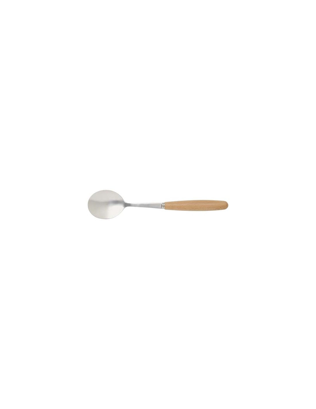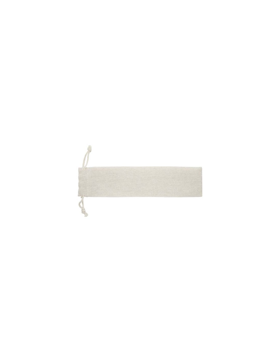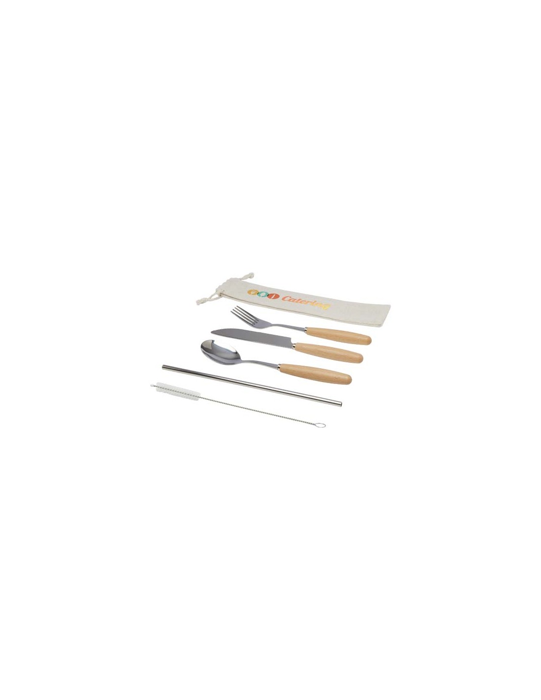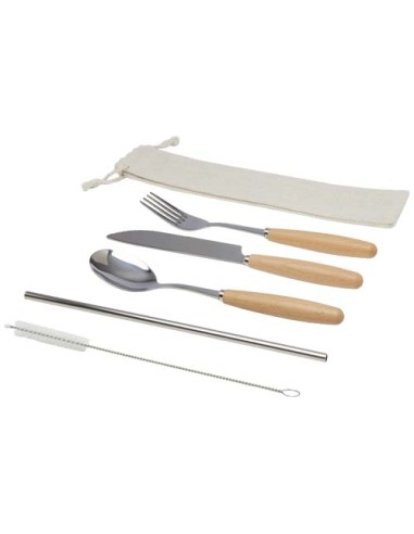 Set di posate comprendente forchetta, coltello, cucchiaio, cannuccia e spazzola per la pulizia. Le posate sono realizzate in acciaio inossidabile, resistente e facile da pulire, mentre i manici sono in legno di faggio. Fornita in un sacchettino di cotone.