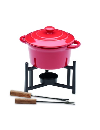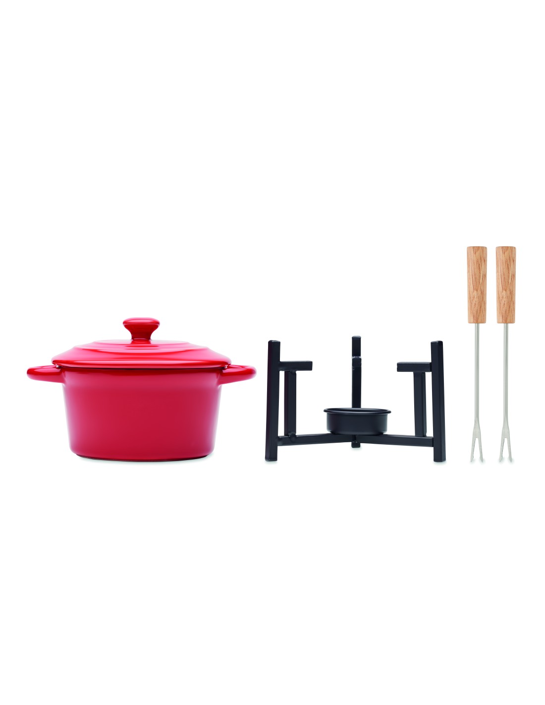 Piccolo set per fonduta in ceramica con coperchio per due. Incluse 2 forchette in metallo con manici in legno. Tealight non incluso. Capacità: 300 ml.
