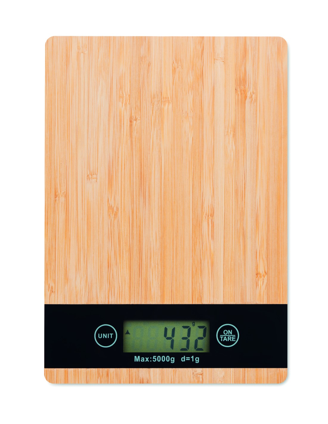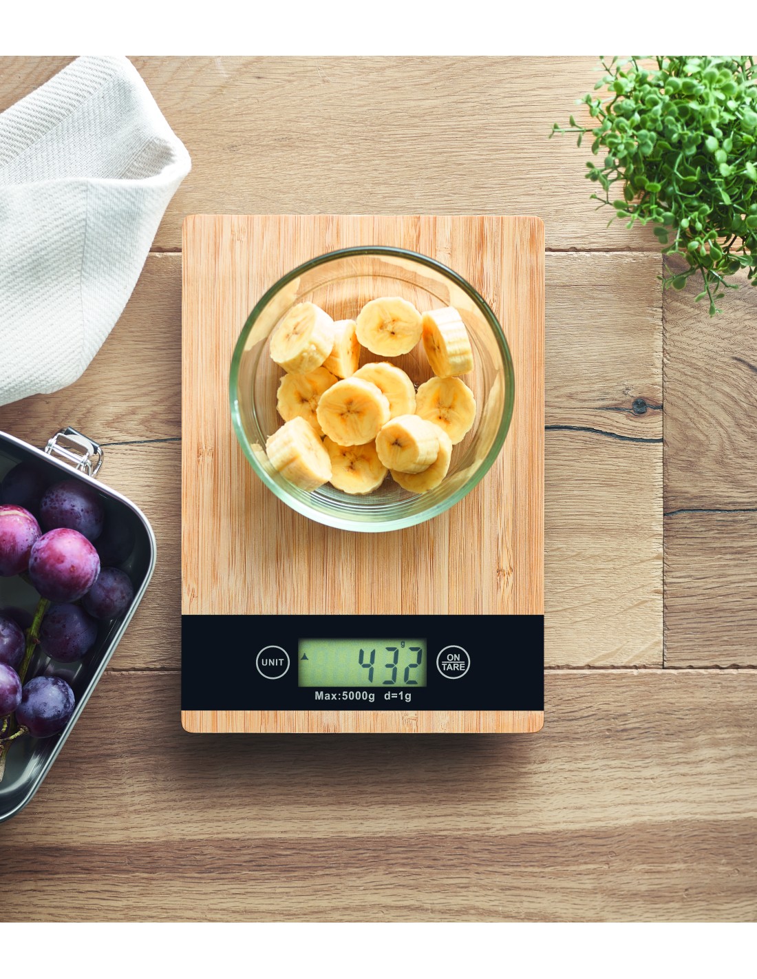 Bilancia da cucina digitale in bamboo. Perfetto per pesare gli ingredienti e il cibo quando si prepara una torta o si cucinano piatti deliziosi. La bilancia ha una portata massima di 5 kg. Escluse 2 batterie AAA. Il bamboo è un prodotto naturale, potrebbero esserci leggere variazioni di colore e dimensione per articolo, che possono influenzare il risultato finale della personalizzazione. FSC®-certified | FSC 100%, N5.7, FSC-C213206