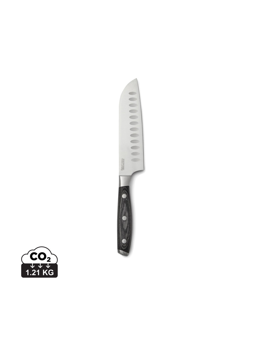 Coltello Santoku in acciaio tedesco X50CrMoV15 con manico in Pakkawood. L'impugnatura di facile presa e l'eccezionale equilibrio della lama rendono il coltello comodo e facile da usare. Dimensioni: lama da 14 cm.