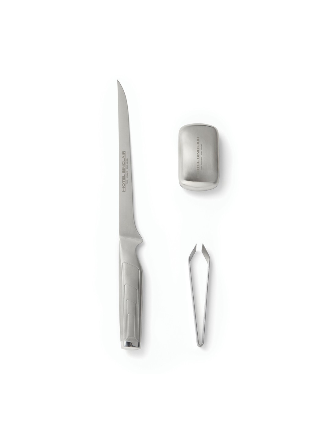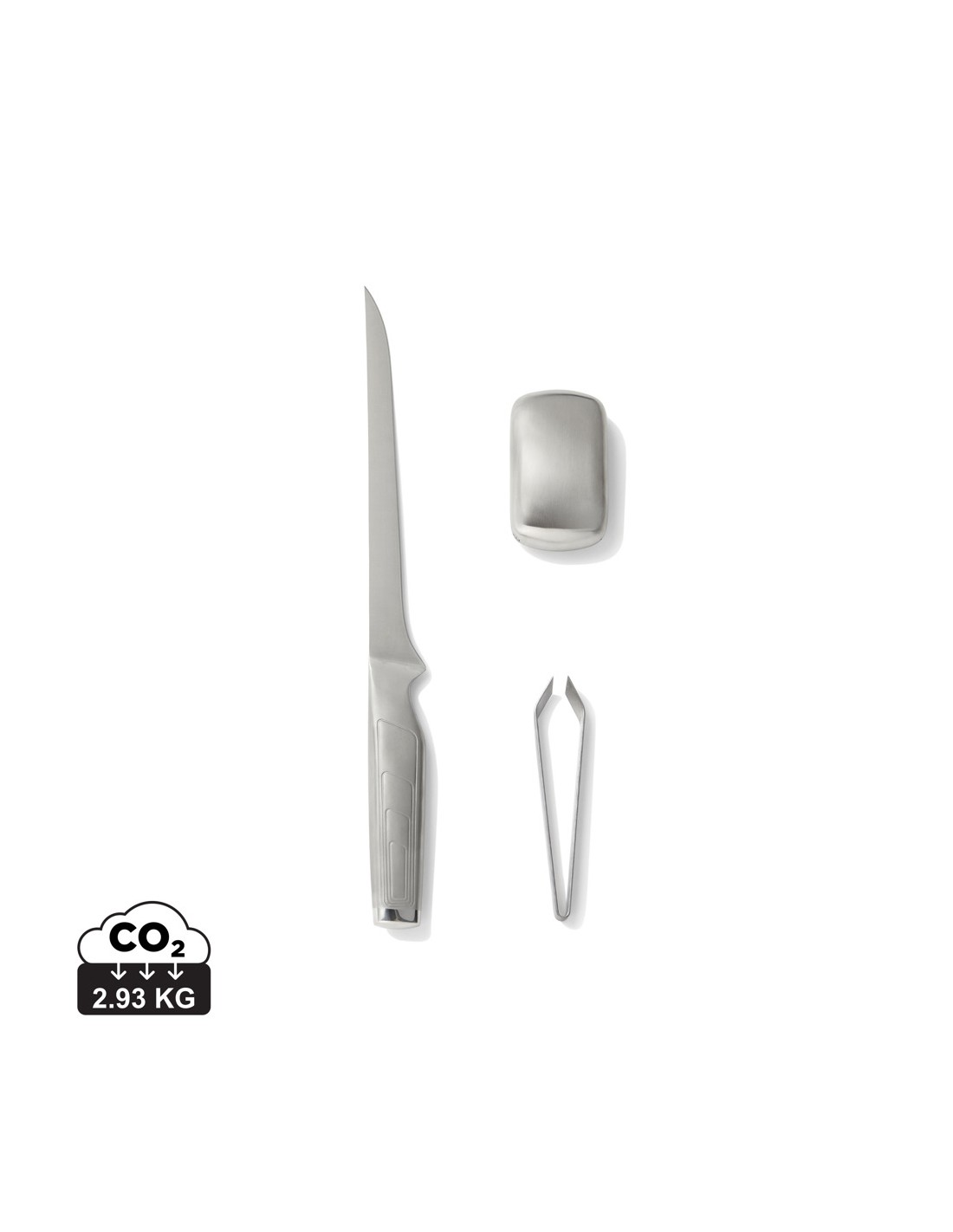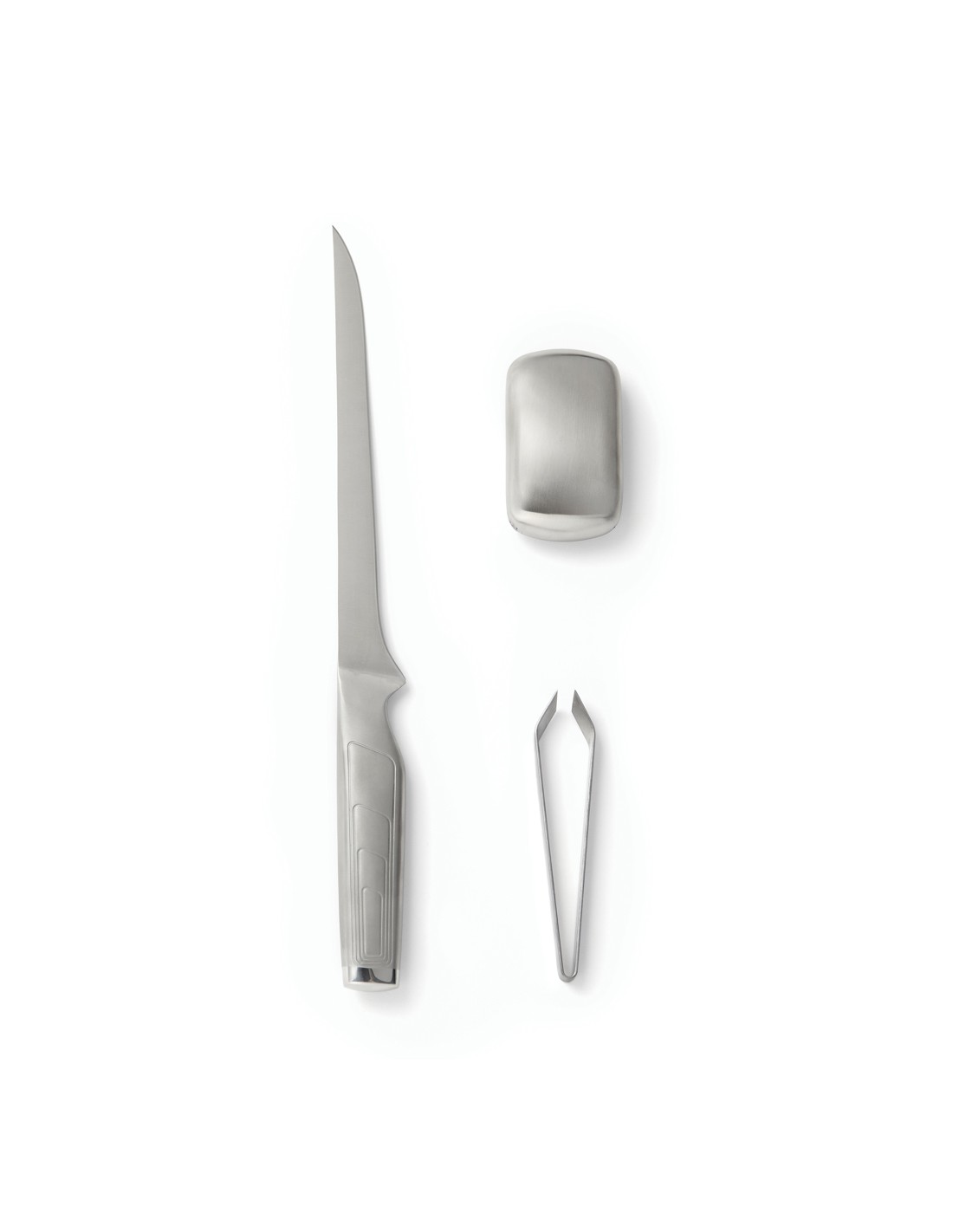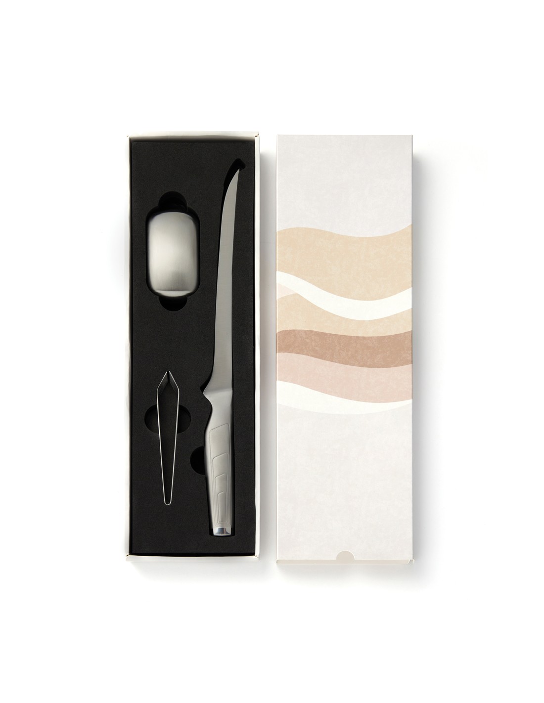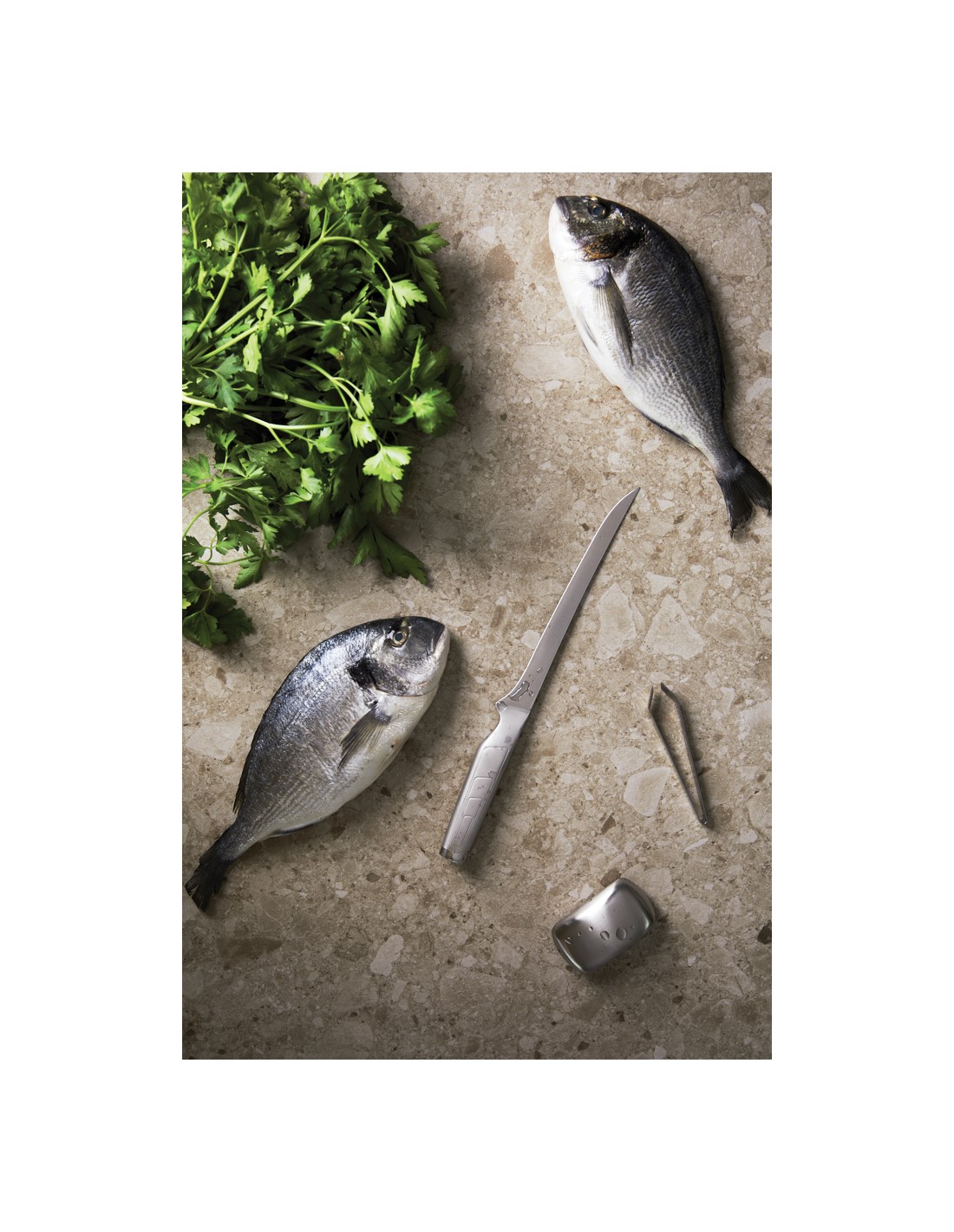 Coltello da filetto in acciaio giapponese 420J di alta qualità. Include una lama lunga, sottile e flessibile, perfetta per tagli precisi. Puoi usare il coltello per sfilettare il pesce o per affettare il prosciutto. Il set viene fornito con una saponetta metallica che rimuove gli odori di pesce e di aglio. La confezione include anche una pinzetta per rimuovere le piccole lische dal pesce. Il regalo perfetto per gli appassionati di cucina.