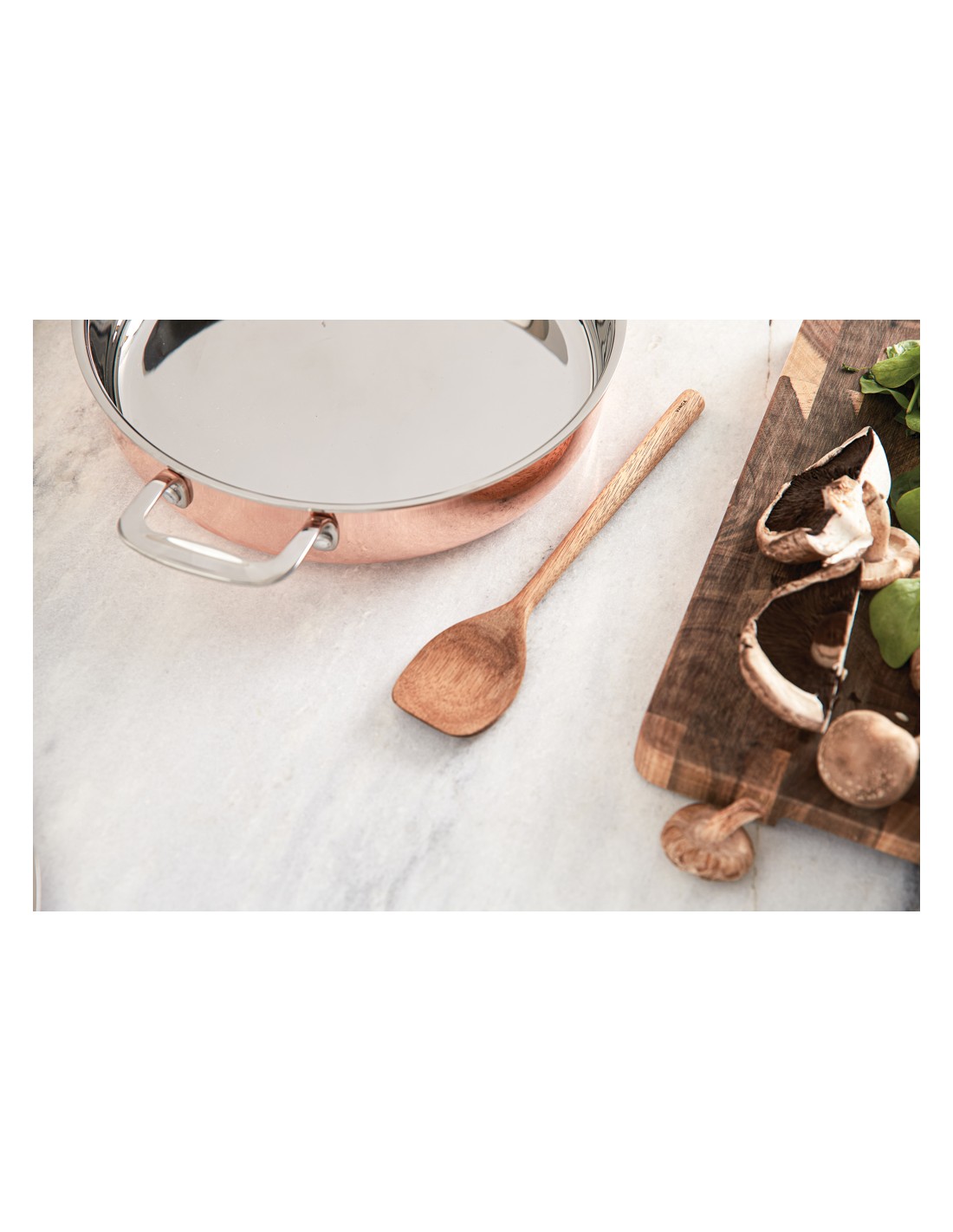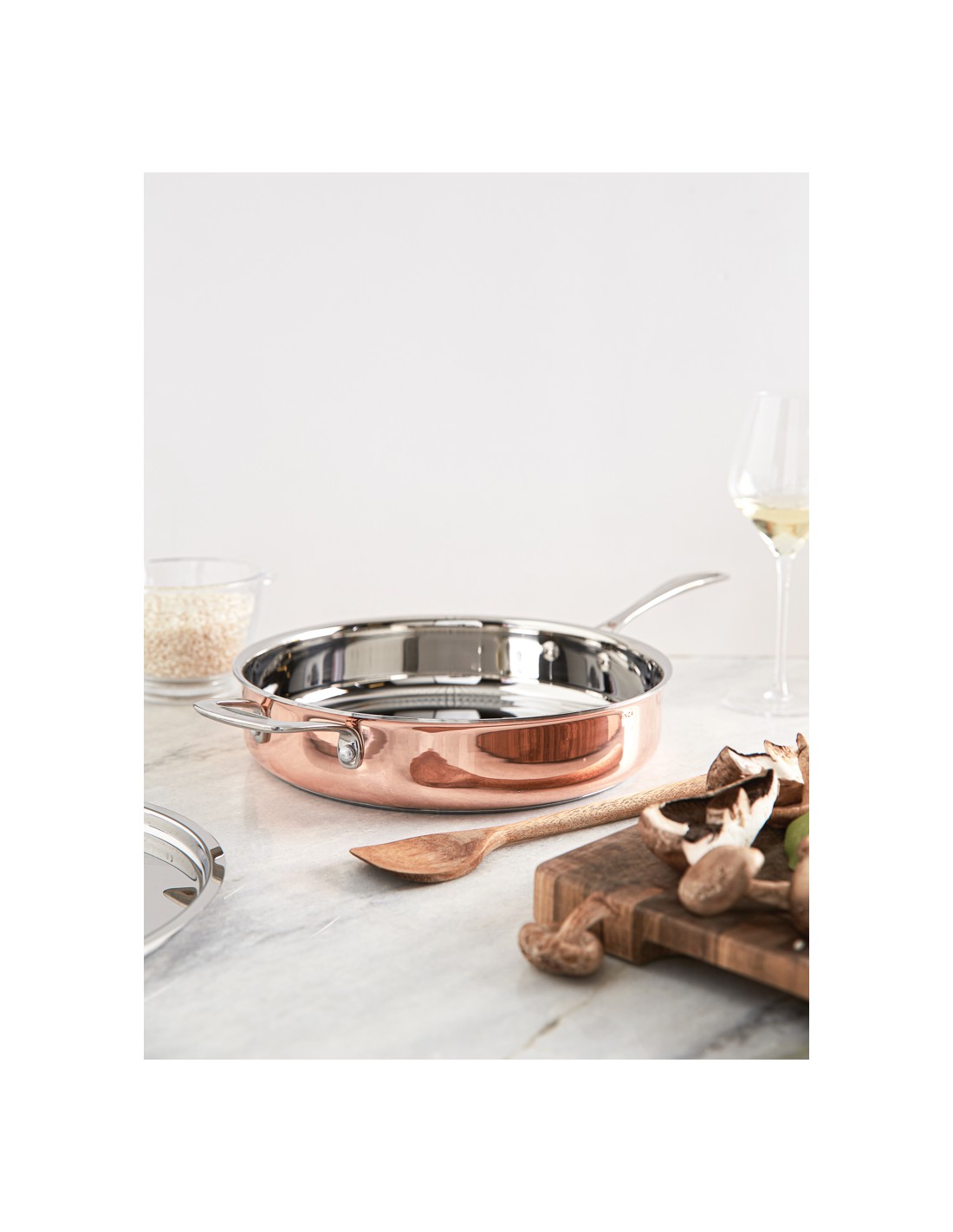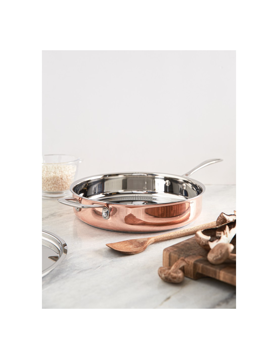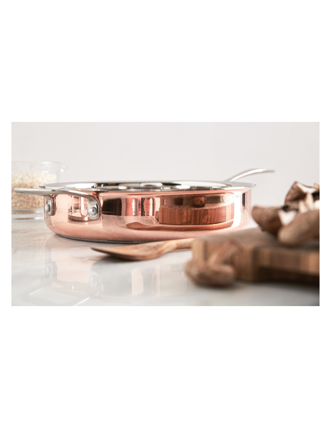Esclusiva padella in rame a tre strati con coperchio. Il primo strato è l'esterno in rame, mentre l'interno è composto da uno strato di alluminio e uno di acciaio inossidabile, che lo rendono facile da pulire. Gli strati di rame e alluminio conducono bene il calore, permettendo alla padella di riscaldarsi rapidamente e in modo uniforme. Il fondo è stato rinforzato con una piastra in acciaio inox più spessa che consente l'utilizzo su un piano di cottura a induzione. La padella è dotata di un manico in acciaio inossidabile che rimane fresco durante la cottura. Adatta a tutti i tipi di piani di cottura.