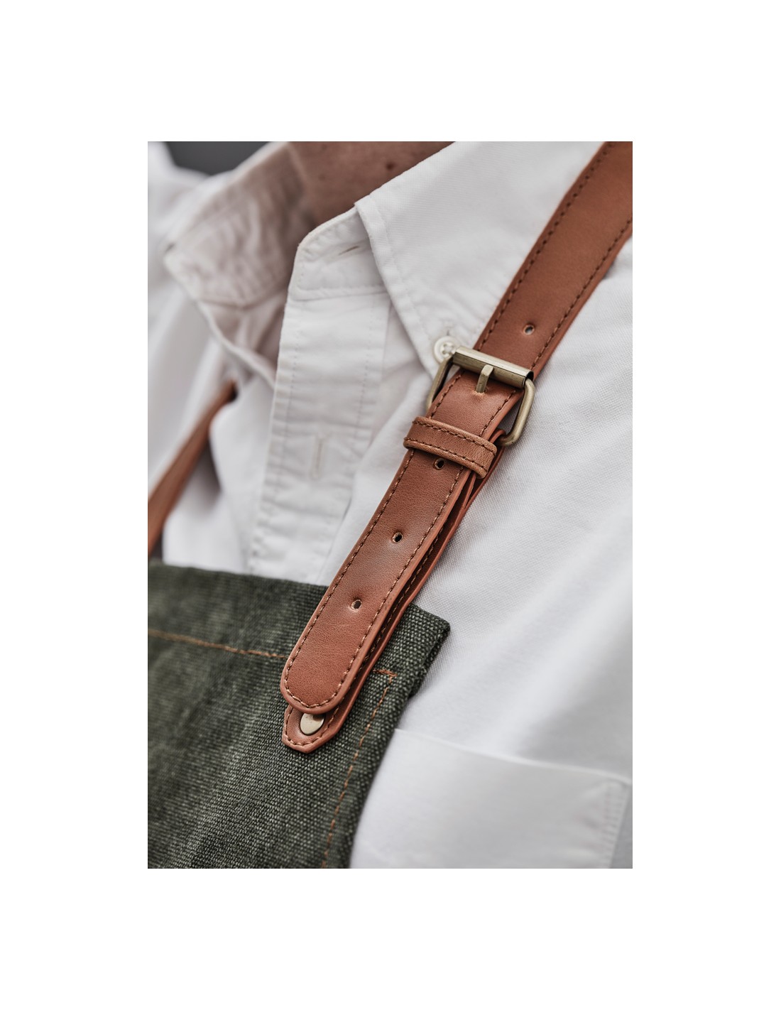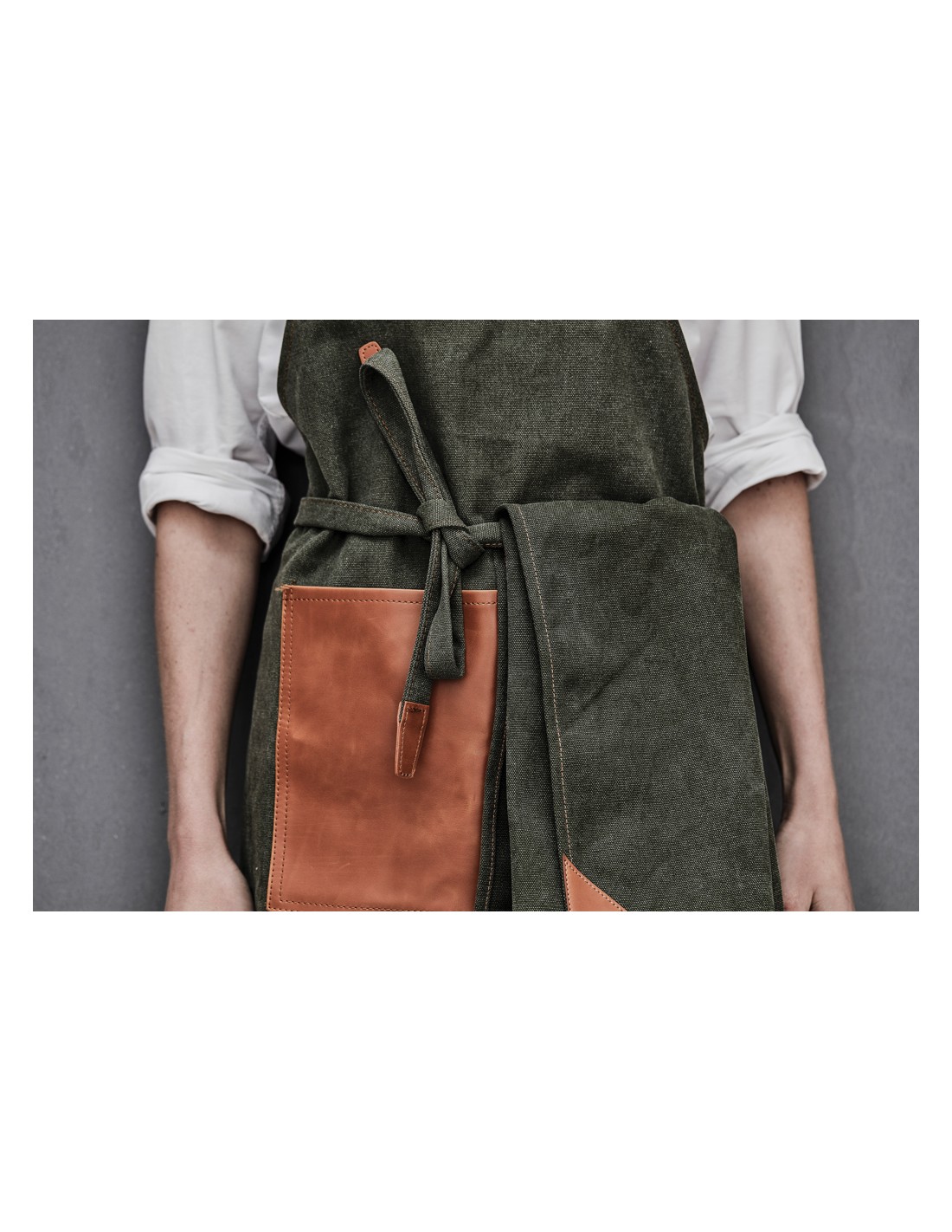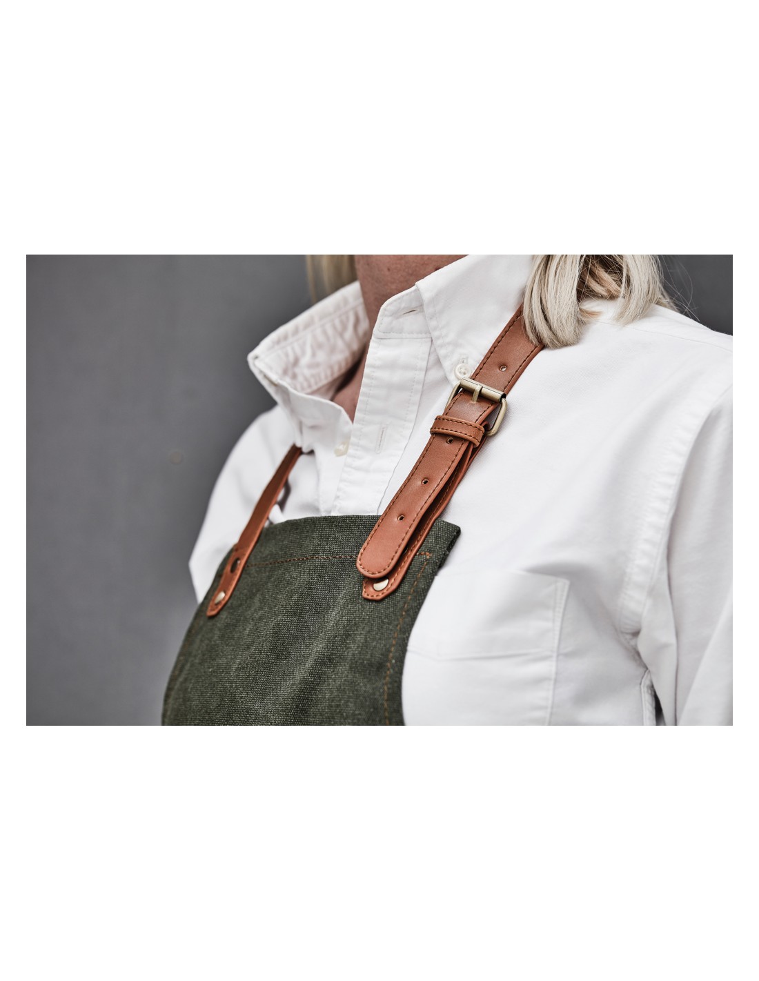 Resistente grembiule in tela stonewashed 500 gm2 con dettagli in PU. Un grembiule che invecchia con dignità.