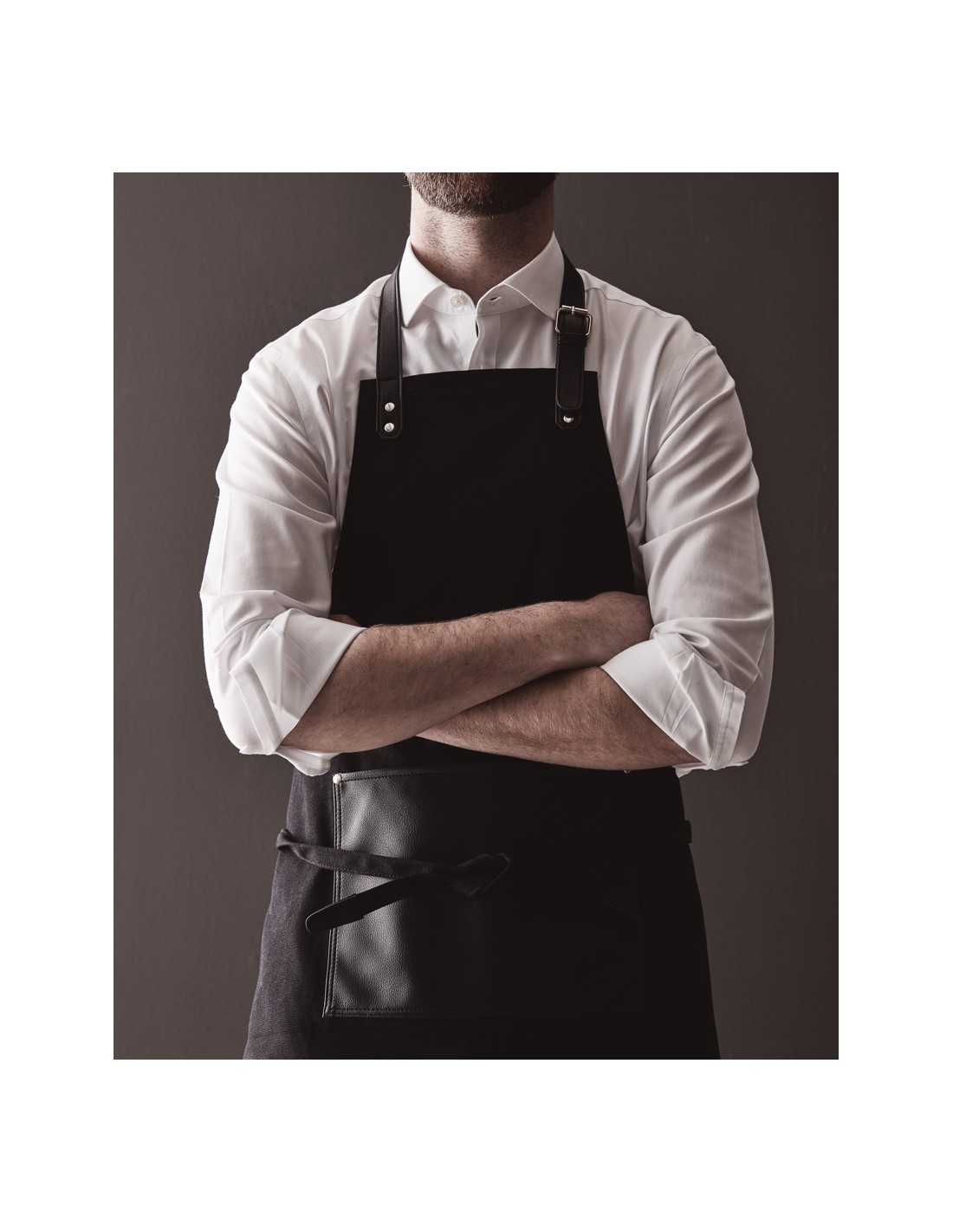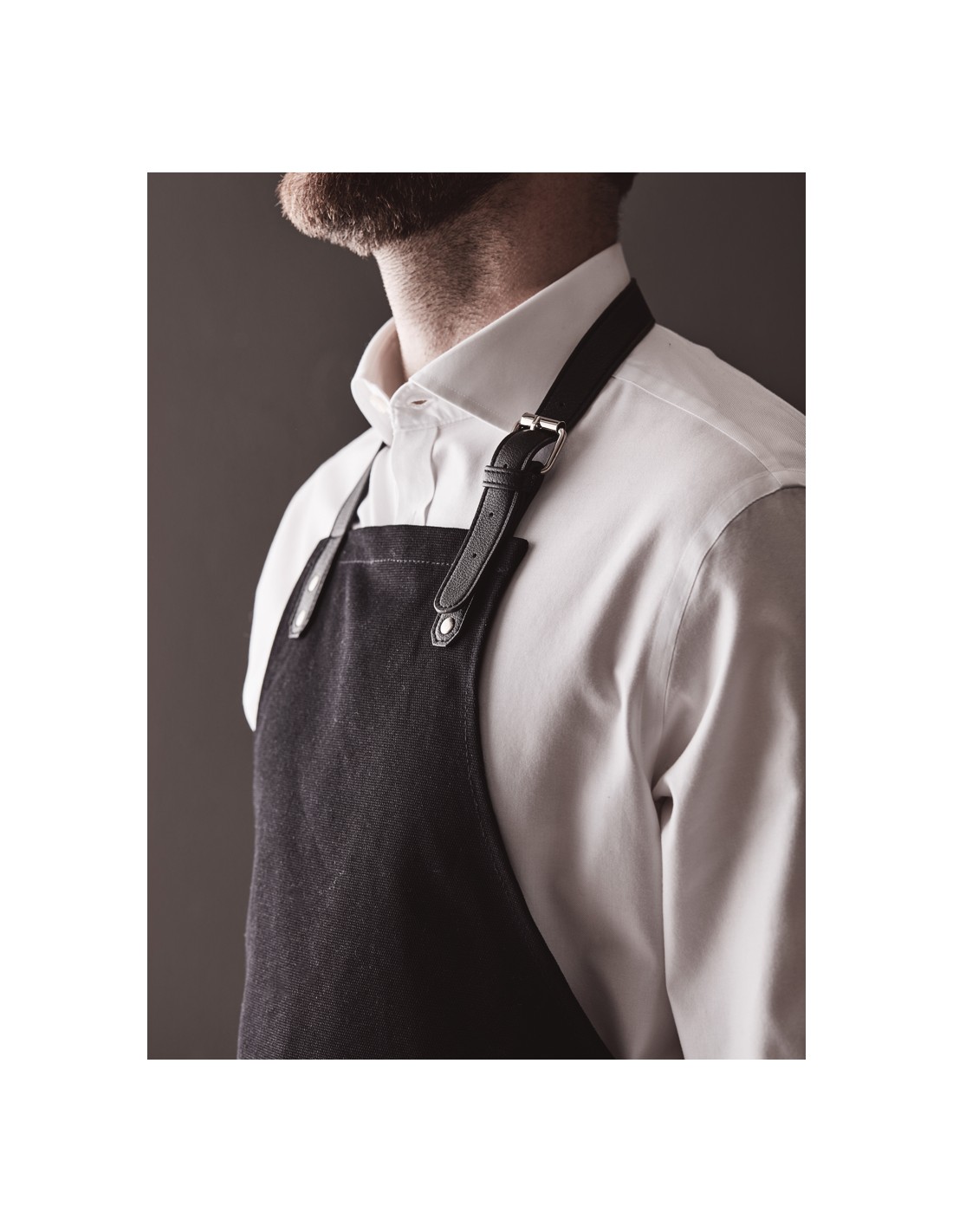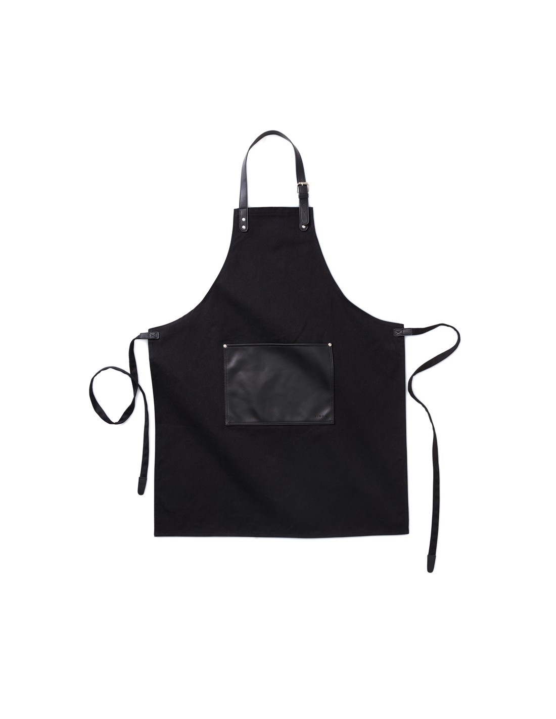 Grembiule elegante e classico in tela di cotone spessa con dettagli discreti in PU. Chiusura con fibbia regolabile nella parte superiore e ampia tasca nella parte anteriore. Un grembiule che dura nel tempo diventando sempre più bello.