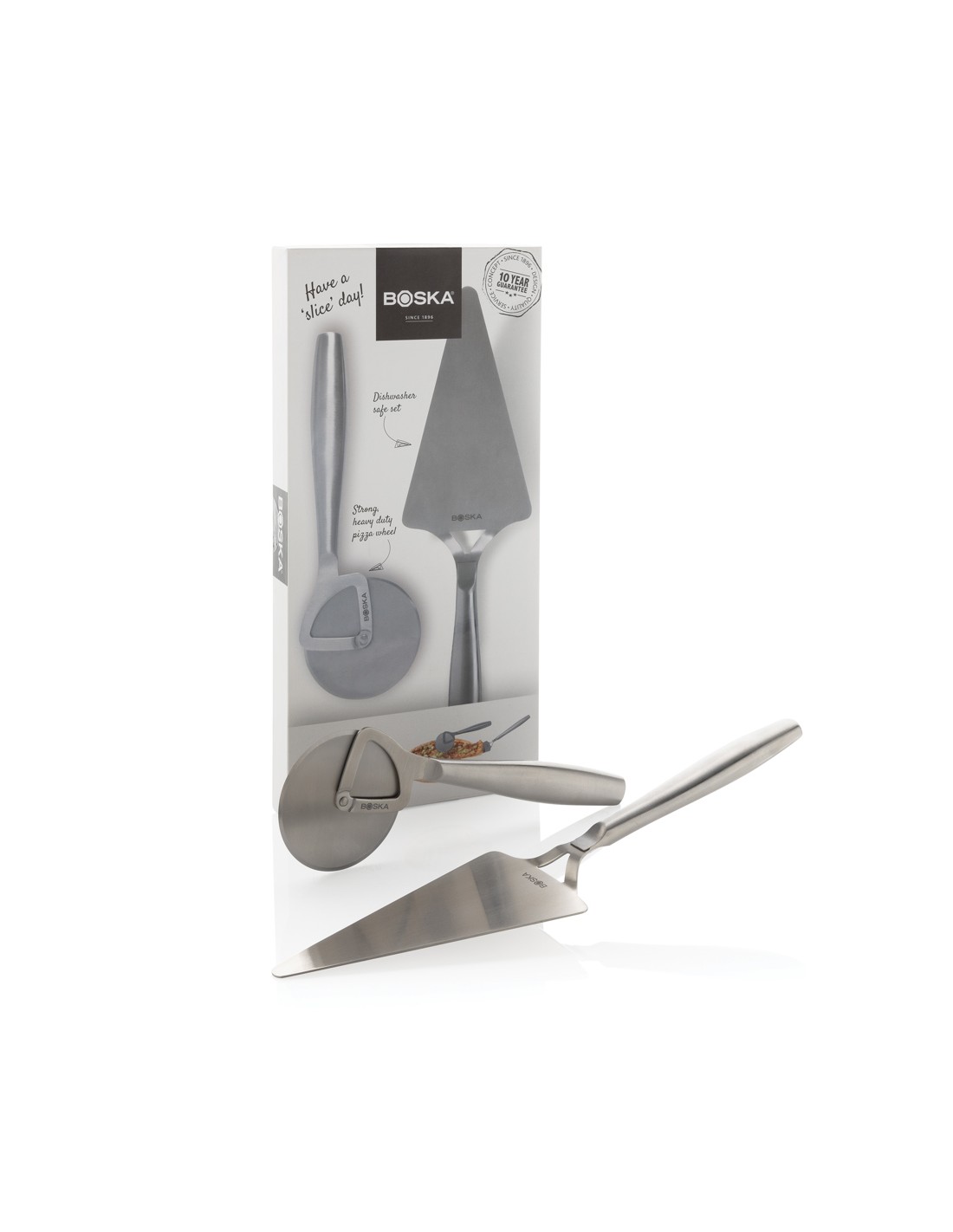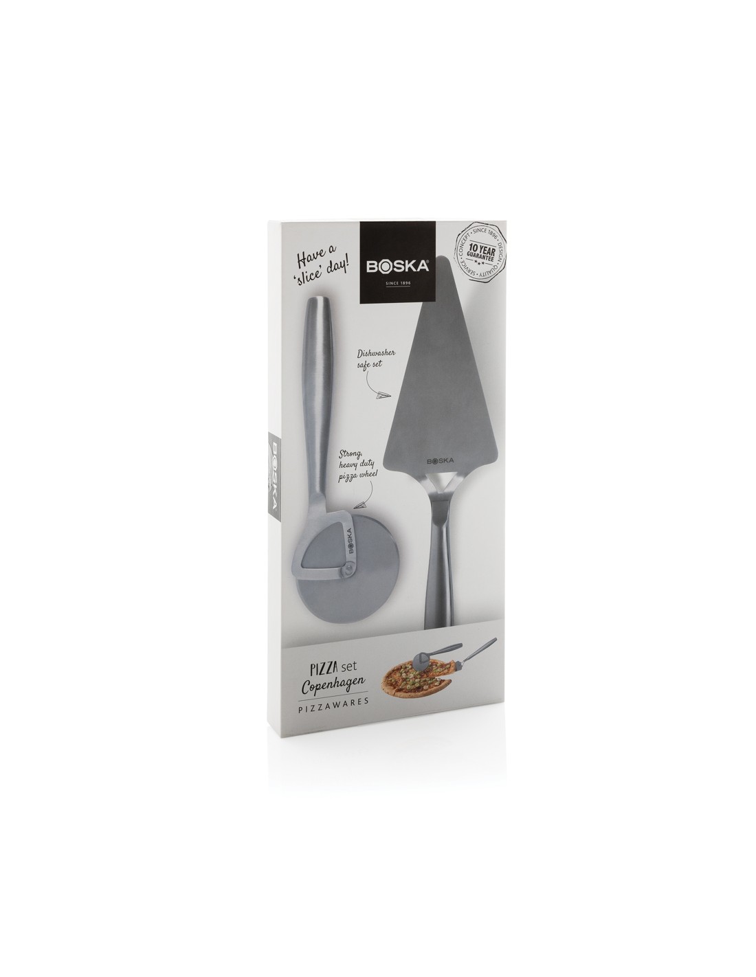 Affettate e servite la vostra pizza preferita con stile grazie al Set Pizza Copenhagen, del marchio BOSKA - azienda certificata B Corporation. Questo set, lavabile in lavastoviglie e adatto al frigorifero, comprende una rotella per pizzae un piatto, entrambi realizzati in acciaio inossidabile di alta qualità. Perfetto non solo per la pizza, ma anche per altre delizie culinarie come fpcacce e torte. Inoltre, viene fornito con una garanzia a vita.