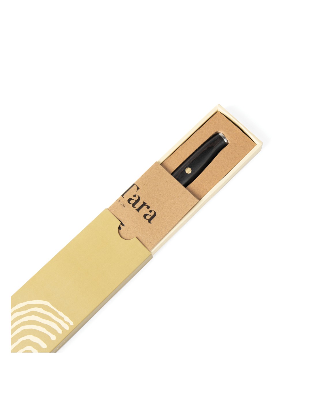 Realizzato in acciaio inossidabile, lo spelucchino Tara offre stile e versatilità. Ideale per sbucciare frutta e verdura e per affettare piccoli ingredienti come l'aglio. La lama più corta ma versatile dello spelucchino conferisce precisione e finezza alle attività di cucina. Realizzati in acciaio inossidabile 5Cr15Mov di alta qualità, questi coltelli offrono durata e prestazioni eccezionali. Il bellissimo manico in Pakkawood offre una presa comoda e sicura, mentre l'eccellente bilanciamento della lama garantisce la facilità d'uso. Dimensioni: 19,5 cm (lama 8,5 cm). Lavare solo a mano per garantire una lunga durata.
