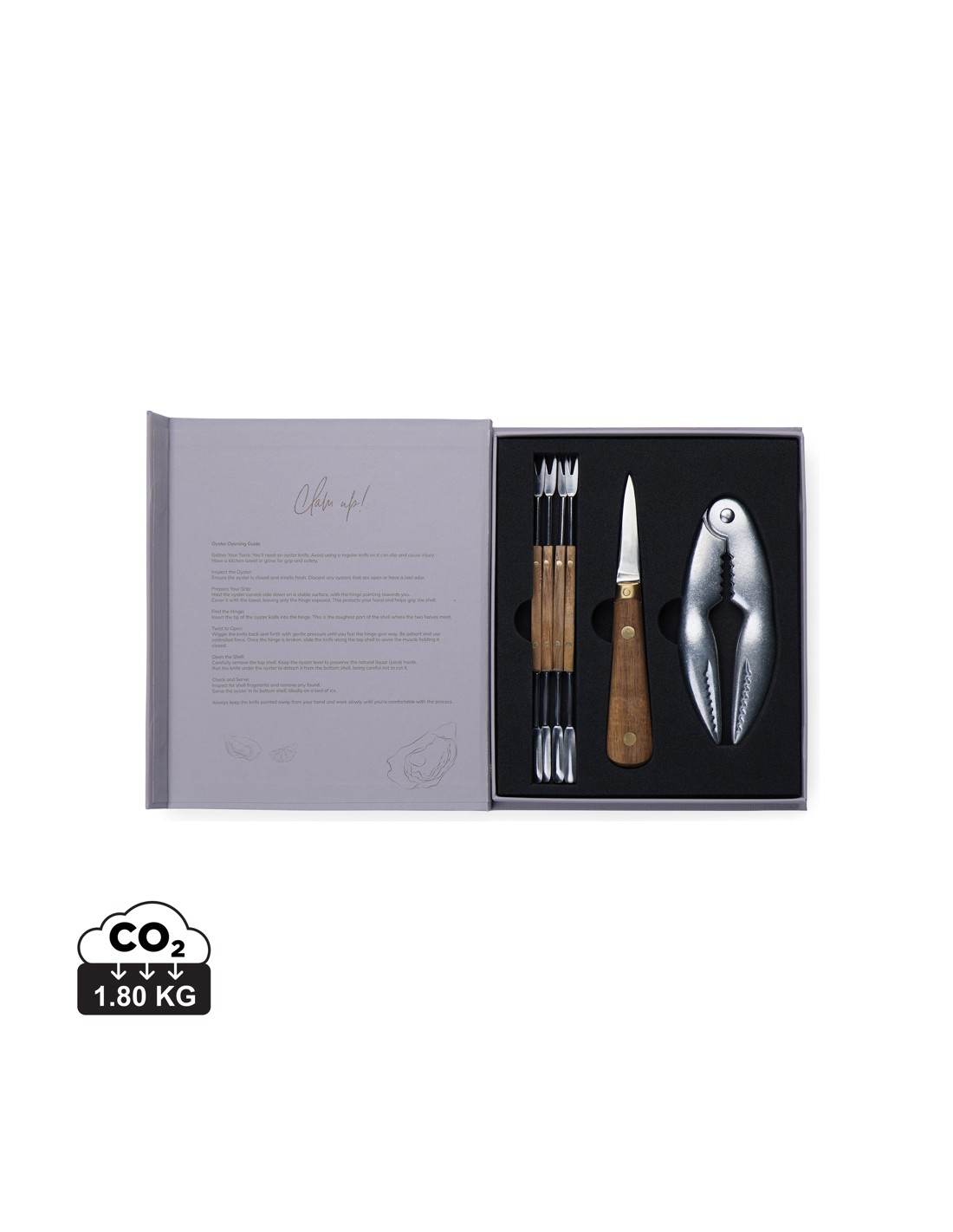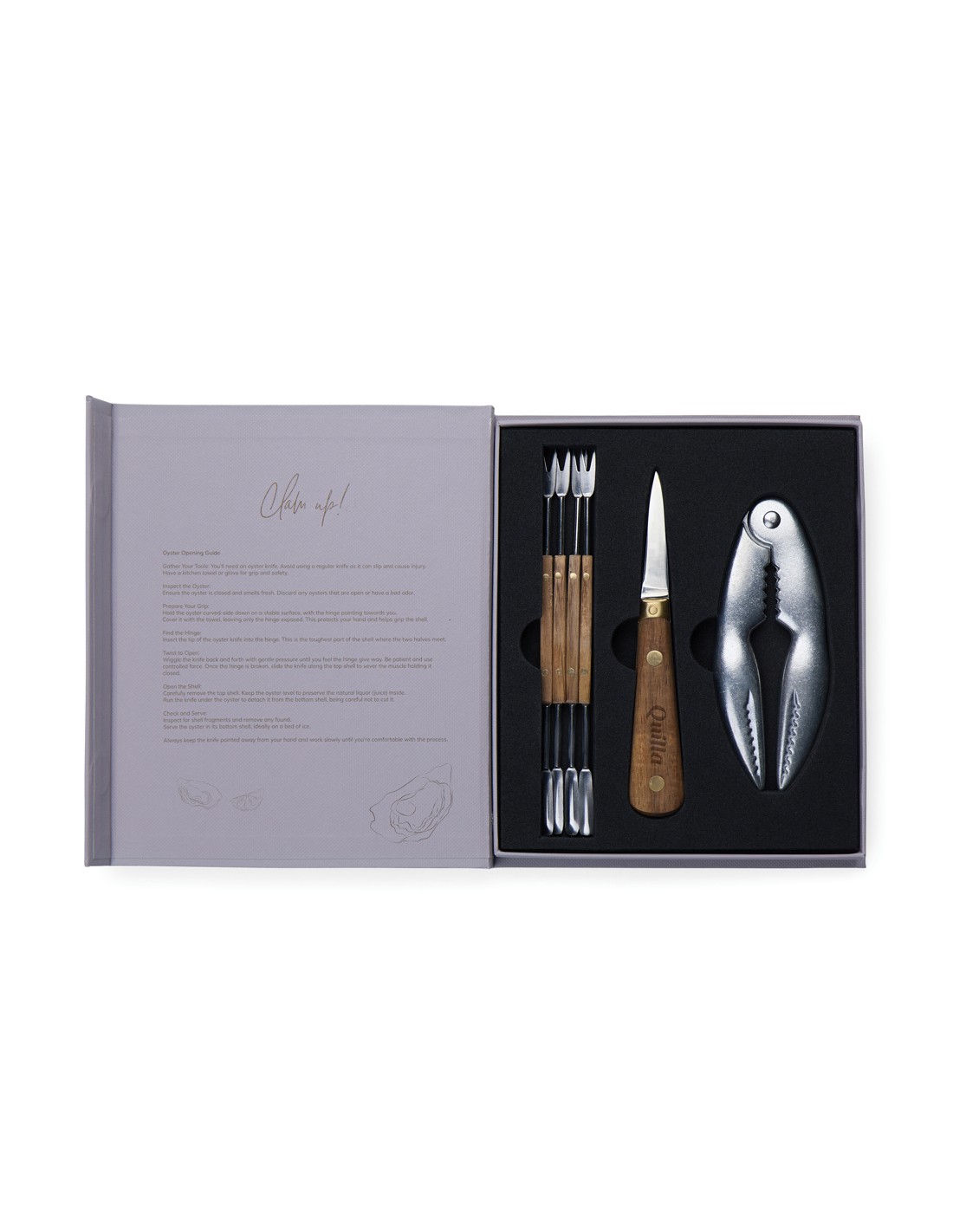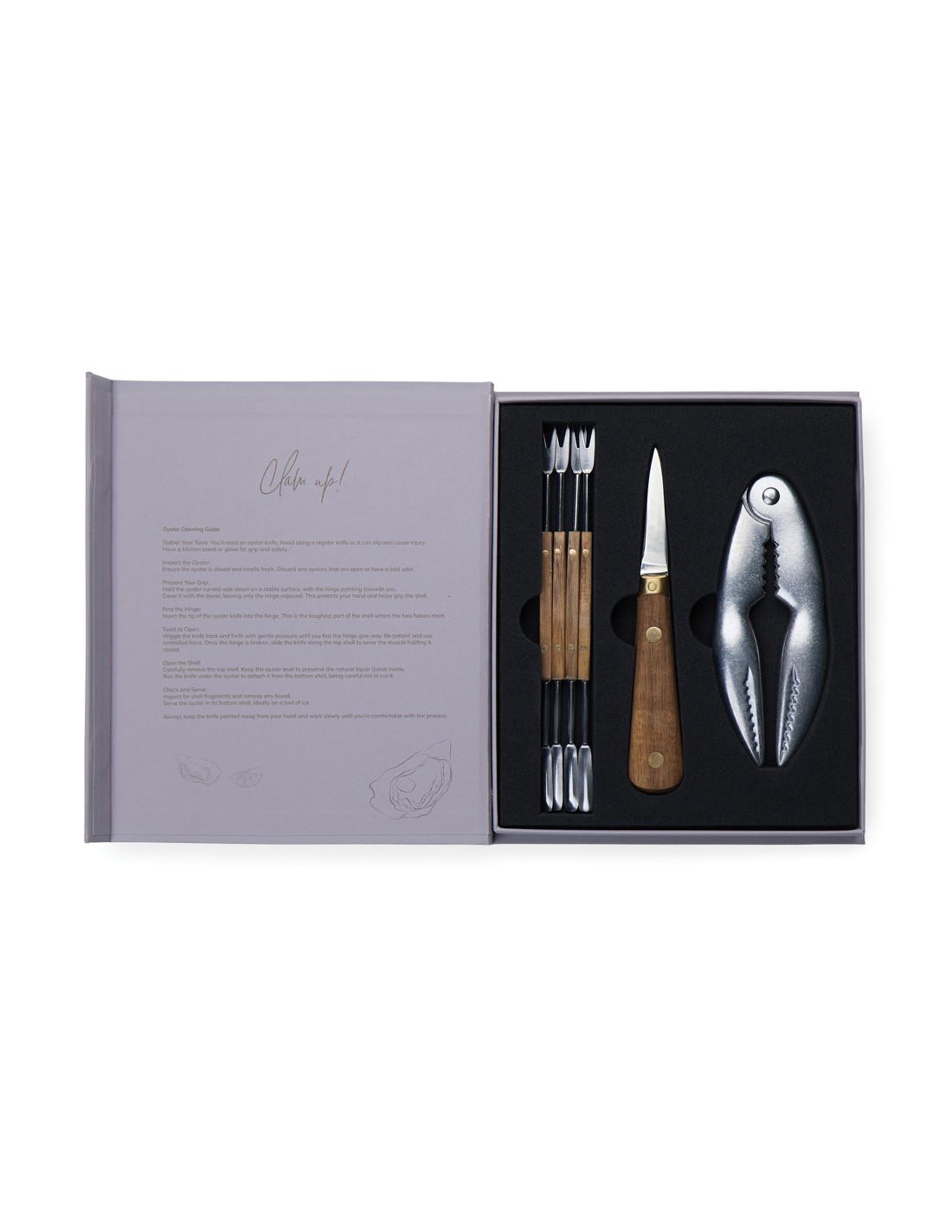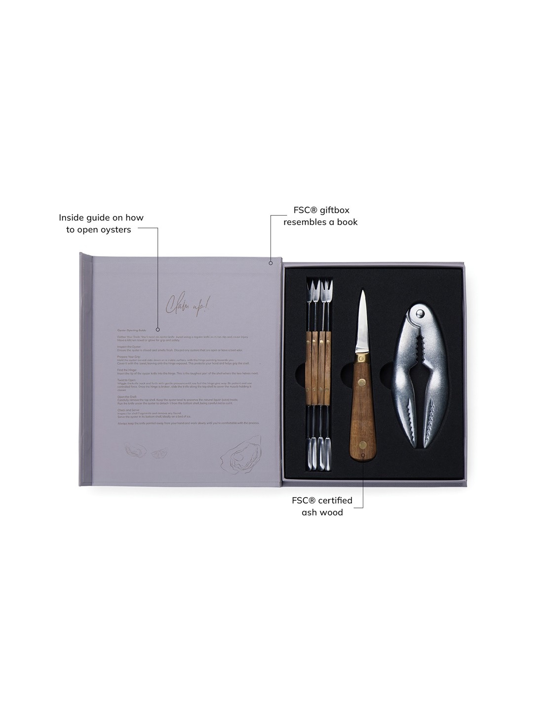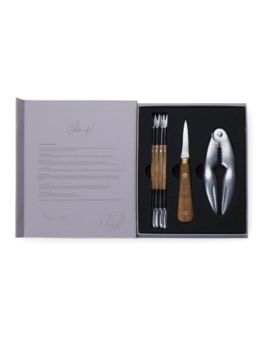 Immergetevi nello squisito mondo dei frutti di mare con il set Story of Seafood, elegantemente confezionato in una scatola regalo FSC® che ricorda un libro classico. Questo set accuratamente curato comprende un coltello per ostriche, un rompi conchiglie e quattro forchette per frutti di mare, tutti realizzati con precisione in acciaio inossidabile e legno di frassino certificato FSC®. La confezione unica non solo protegge gli strumenti, ma racconta anche una storia accattivante sui frutti di mare, rendendolo un regalo ideale per ogni amante dei frutti di mare.