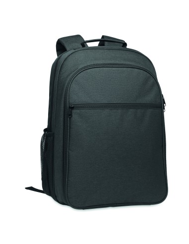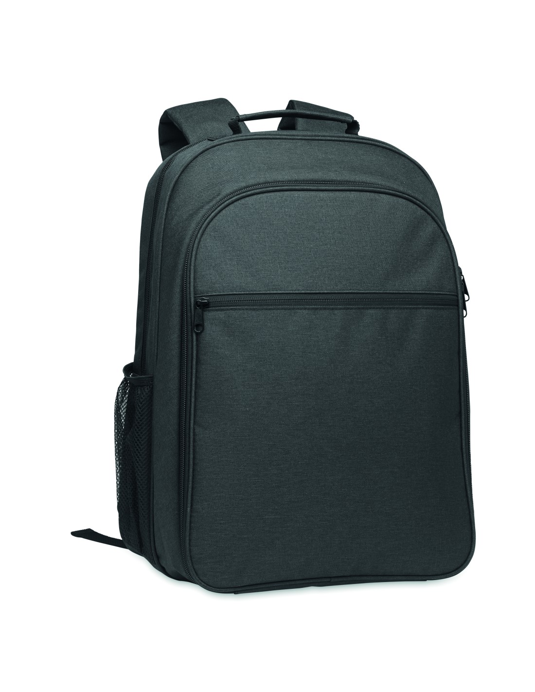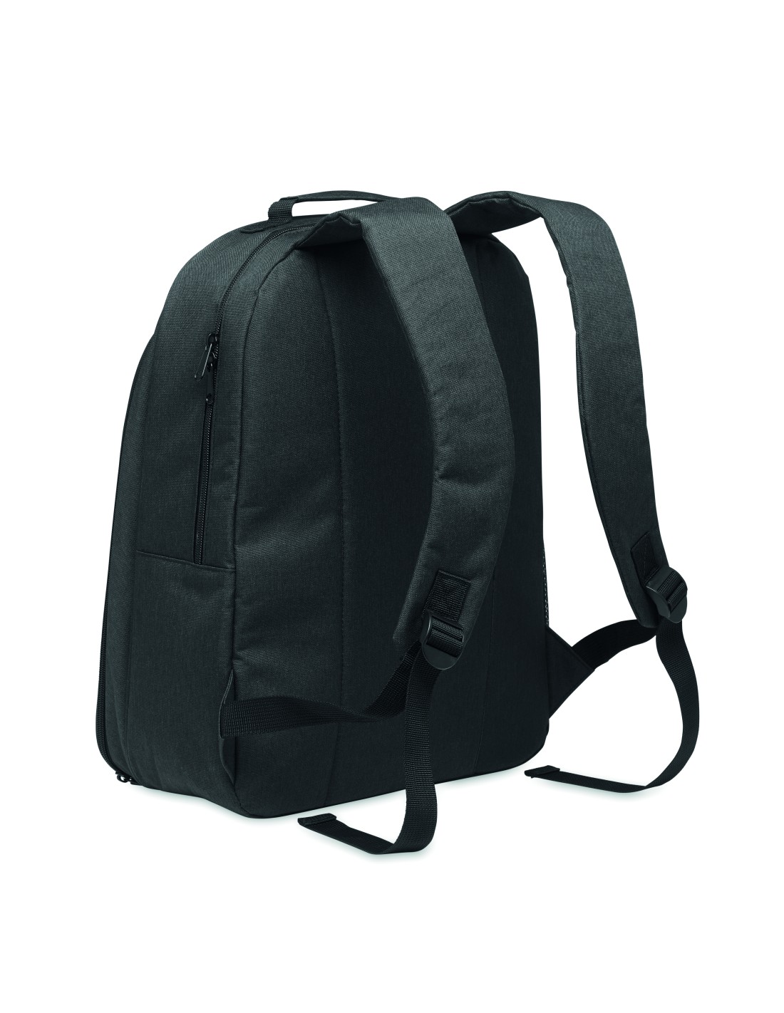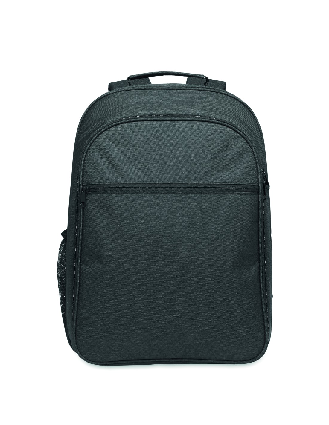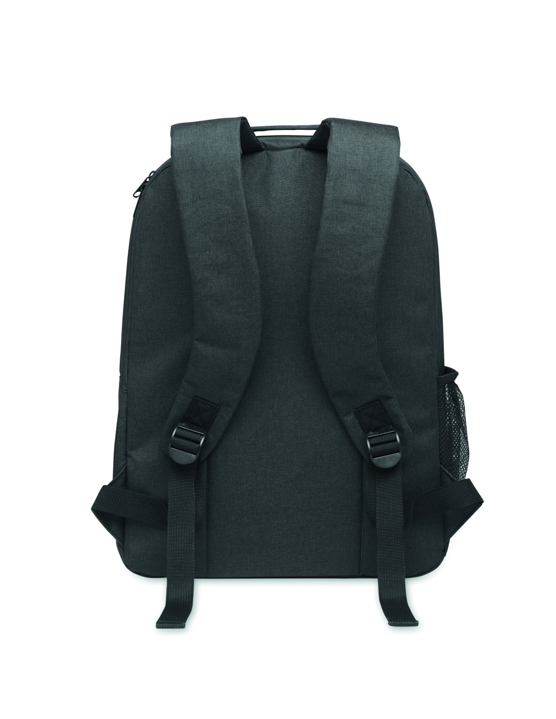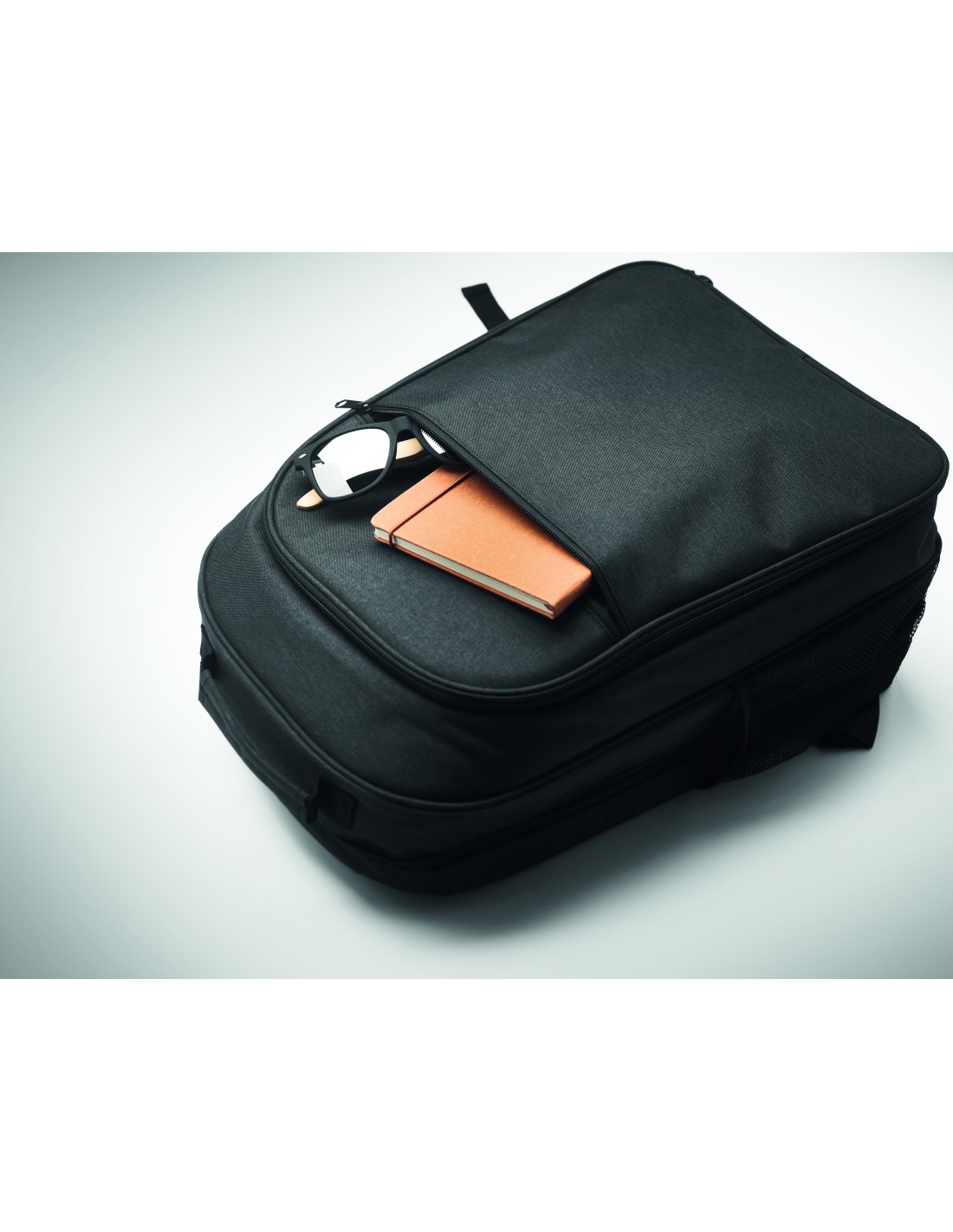 Zaino sottile per laptop da 15 pollici in 300D RPET con apertura a 180° e fodera in 210D RPET. Uno scomparto per laptop, 2 tasche interne, 2 tasche interne per penne. Maniglie, schienale e spallacci imbottiti. Custodia per valigia.