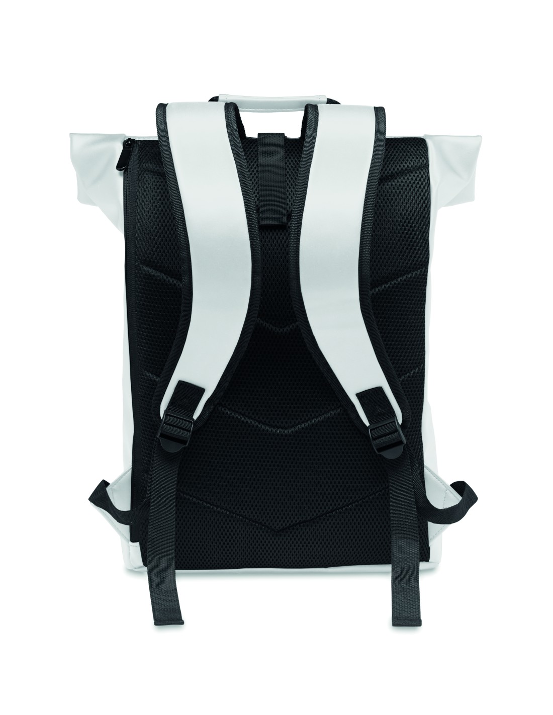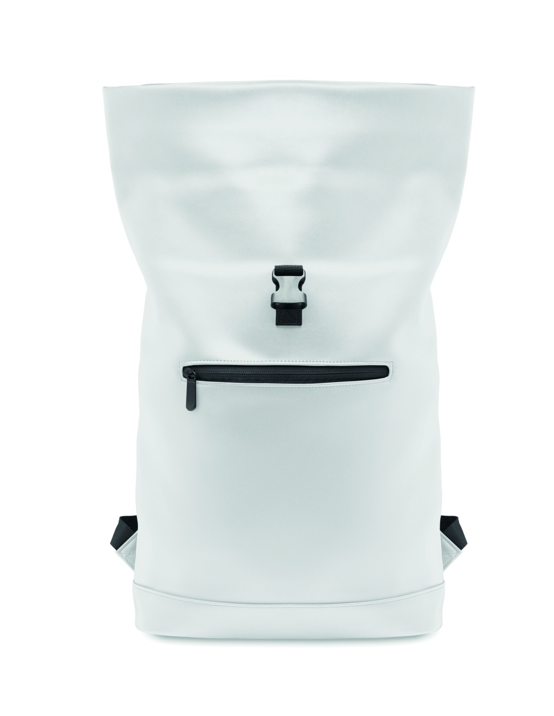 Zaino arrotolabile per laptop da 15 pollici in morbido PU con schienale imbottito e base rinforzata. Ampia tasca frontale con cerniera. La fodera è in RPET 210D.