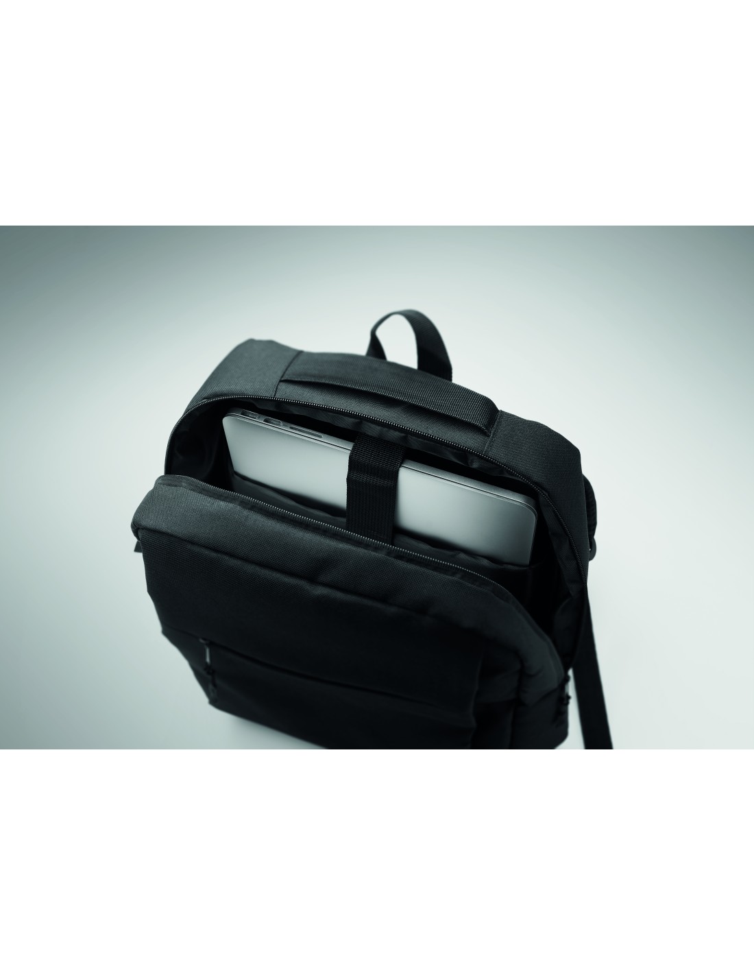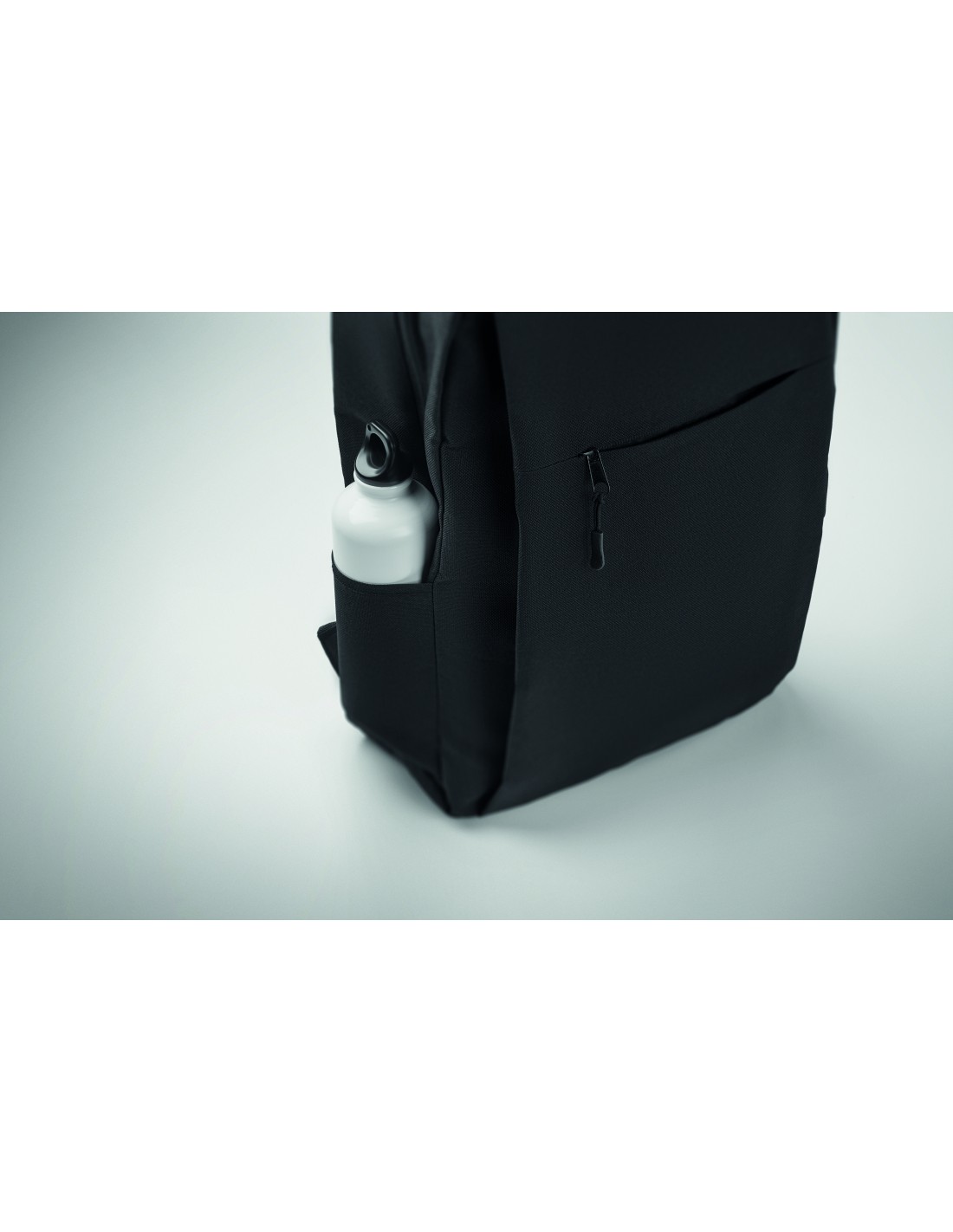 Zaino per laptop da 15 pollici in poliestere 300D RPET. Dispone di 2 ampi scomparti con cerniera, tasche anteriori con doppia cerniera e tasca laterale in rete. Schienale e spallacci imbottiti.