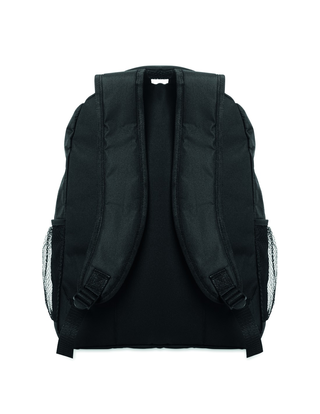 Zaino sottile per laptop da 15 pollici in 300D RPET con apertura a 180° e fodera in 210D RPET. Uno scomparto per laptop, 2 tasche interne, 2 tasche interne per penne. Maniglie, schienale e spallacci imbottiti. Custodia per valigia.