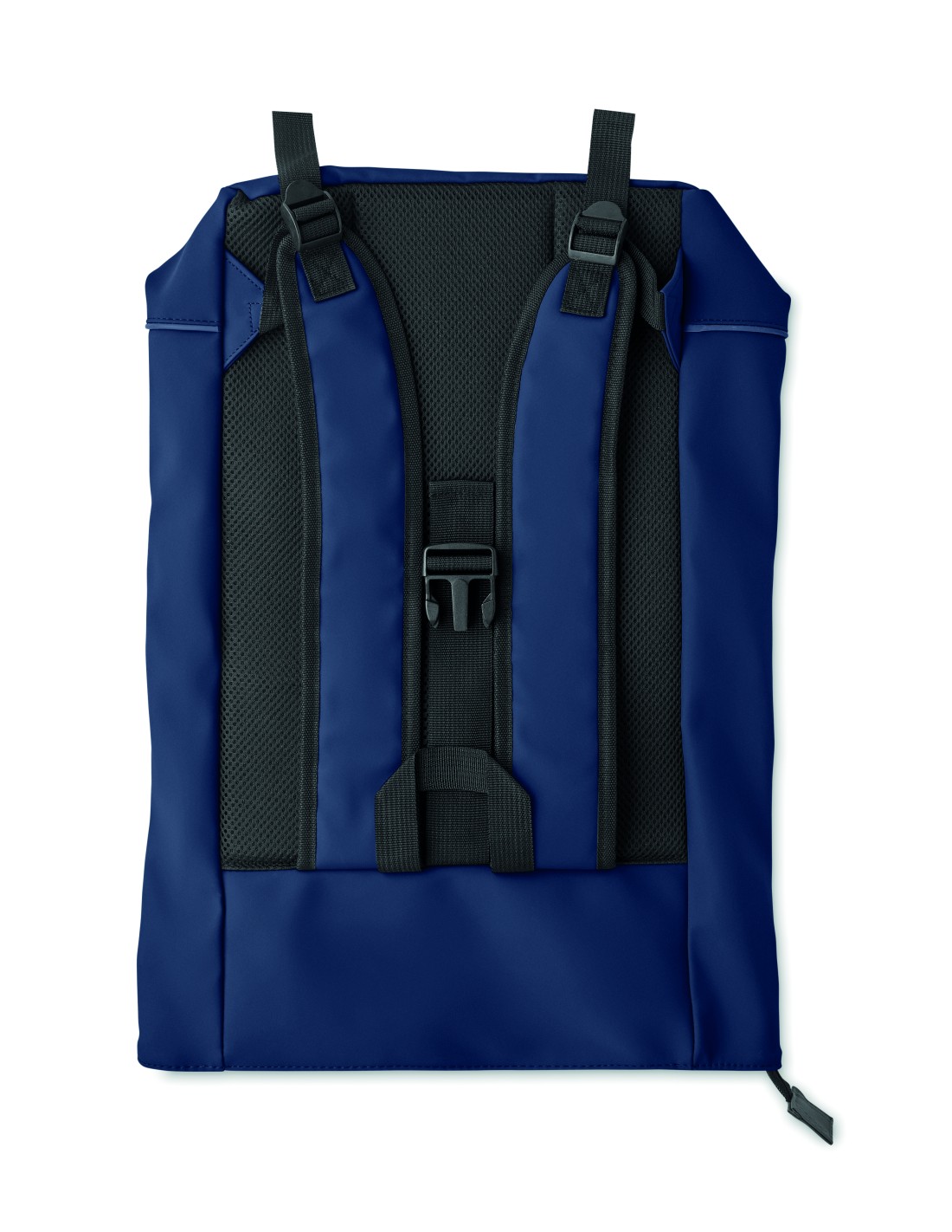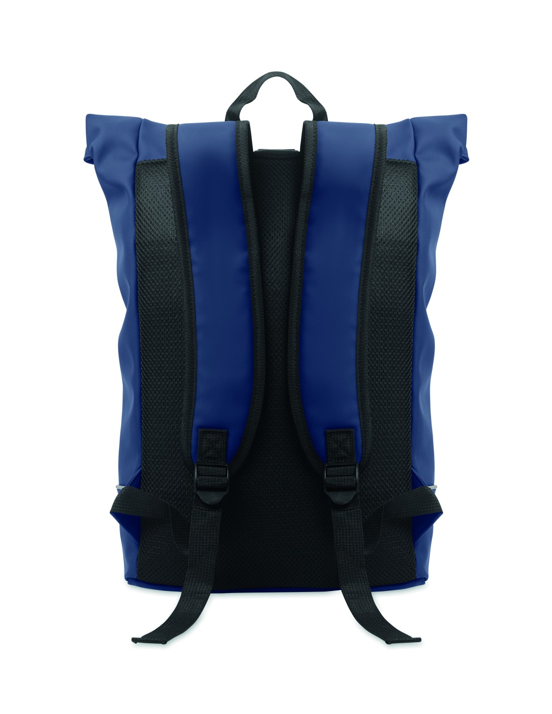 Zaino rolltop per laptop da 15 pollici in morbido PU con schienale imbottito e rinforzo alla base con striscia riflettente. Tasca frontale impermeabile con cerniera. Fodera in poliestere 210D RPET.