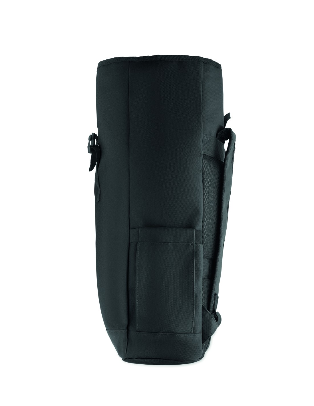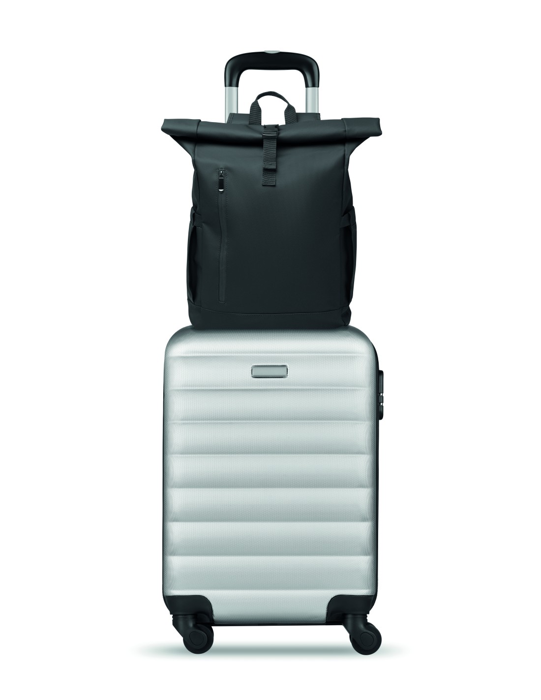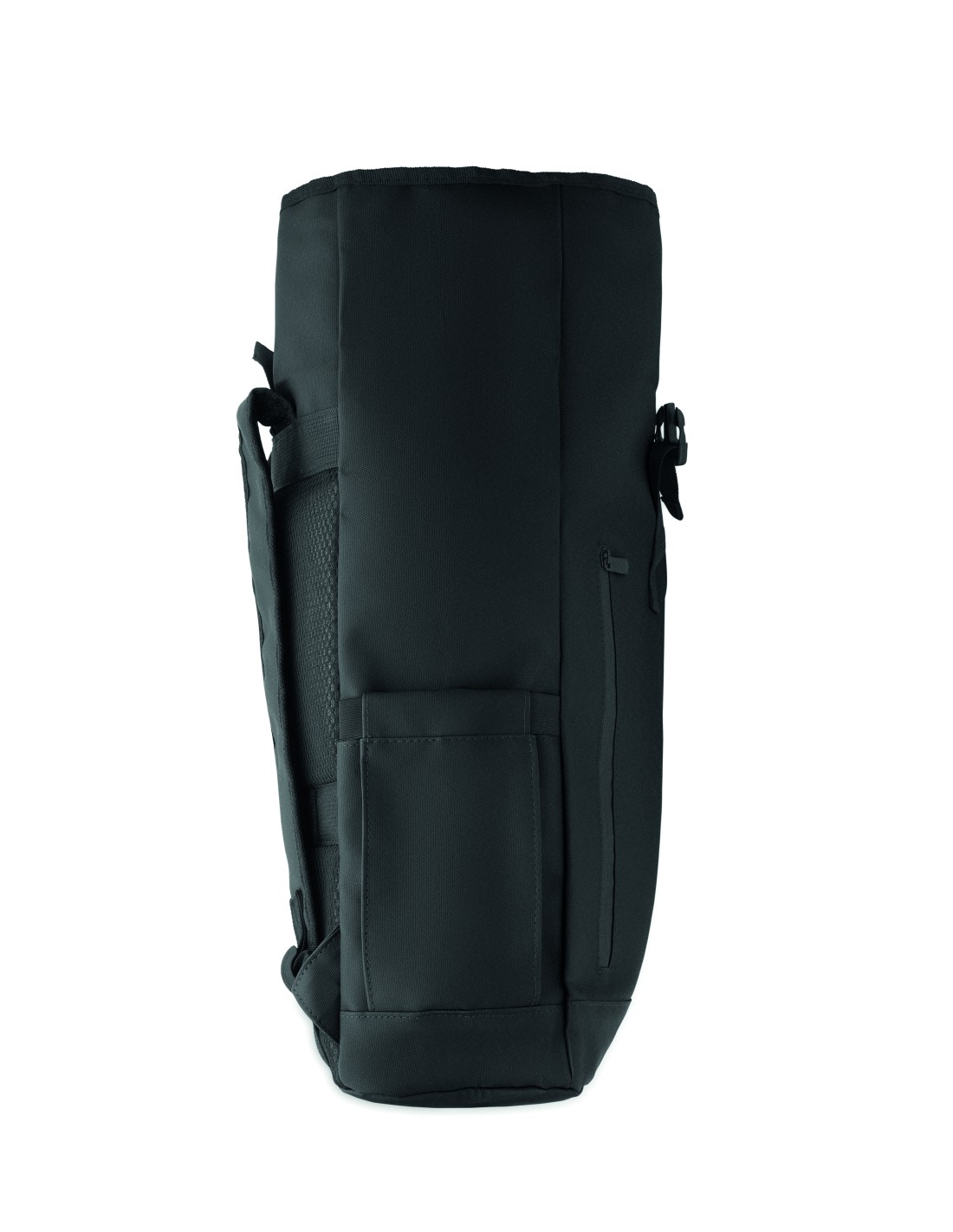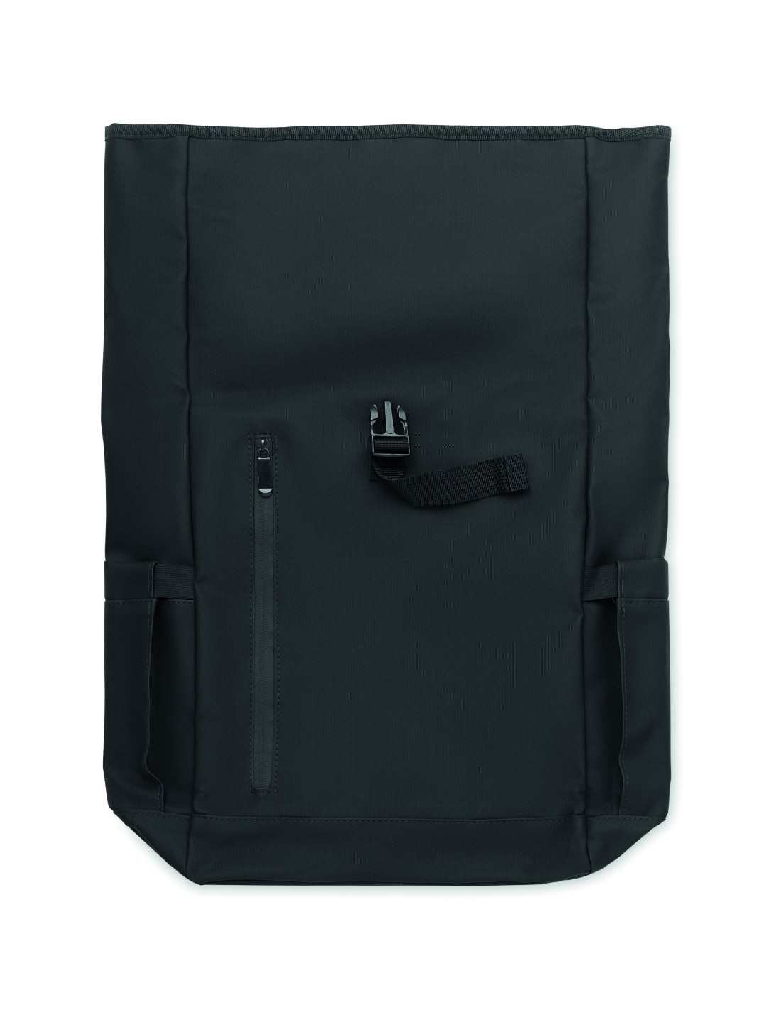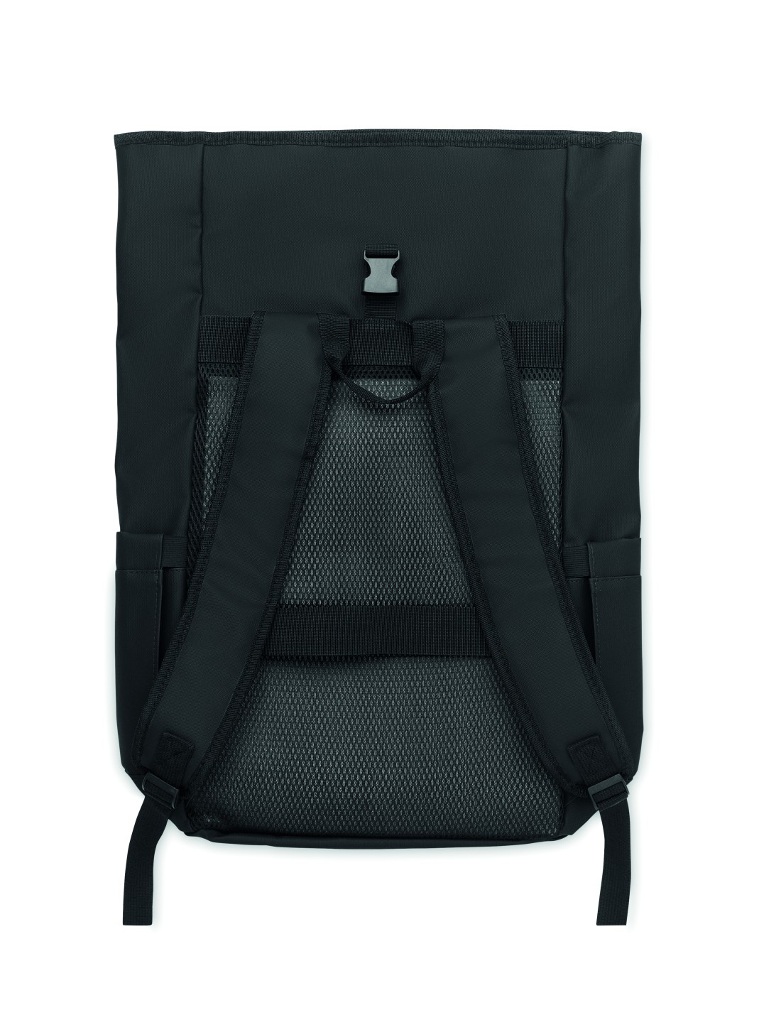 Zaino rolltop per laptop in poliestere 600D RPET rivestito in PU e fodera in poliestere RPET. Schienale imbottito in rete con tasca con cerniera e cinghia trolley. Tracolla imbottita con finitura interna in rete.