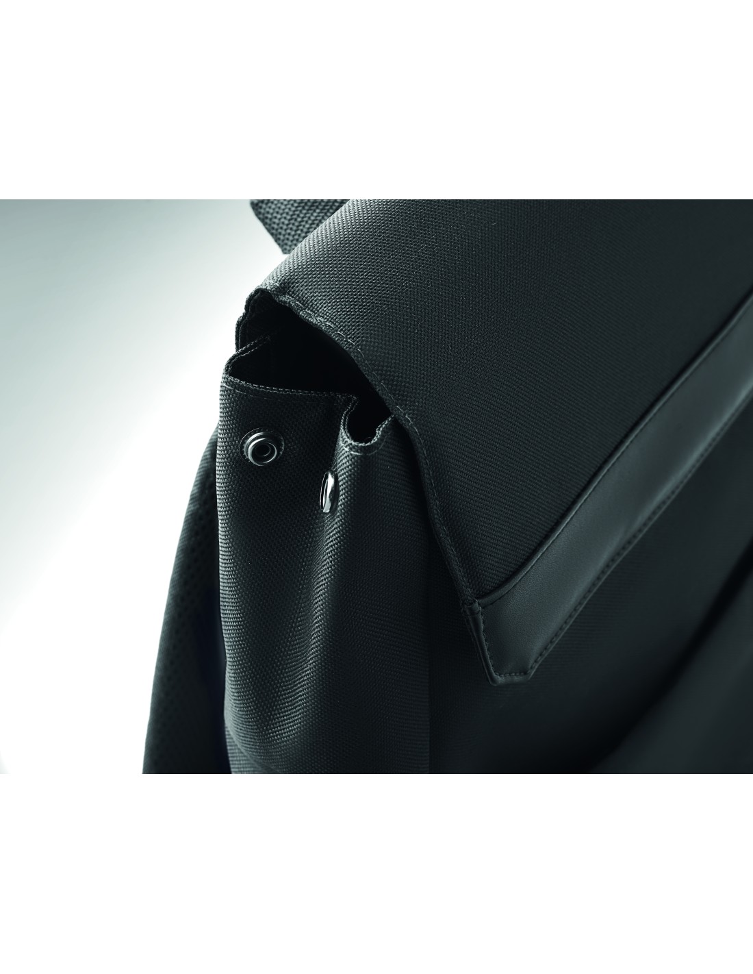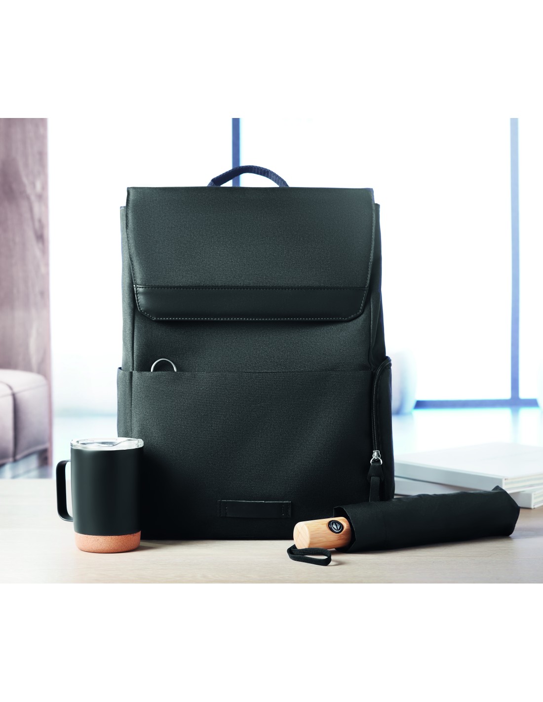 Zaino porta laptop da 15 pollici in RPET 600D 2 toni con bottone a pressione magnetico. Scomparto imbottito per laptop, tasche anteriori con cerniera e 2 tasche laterali.